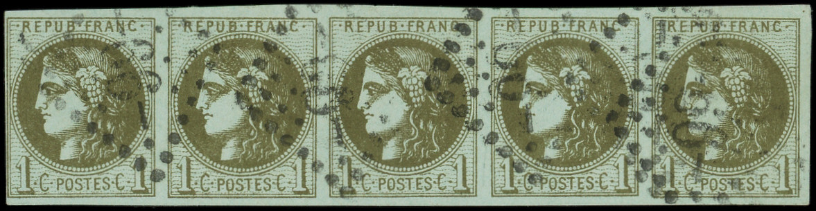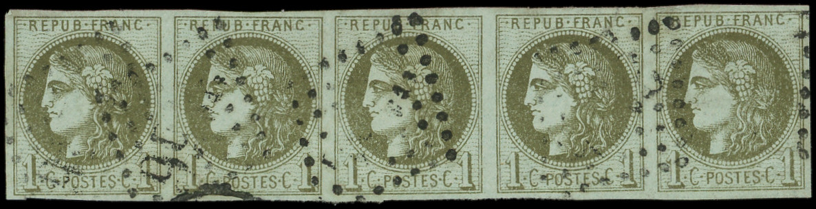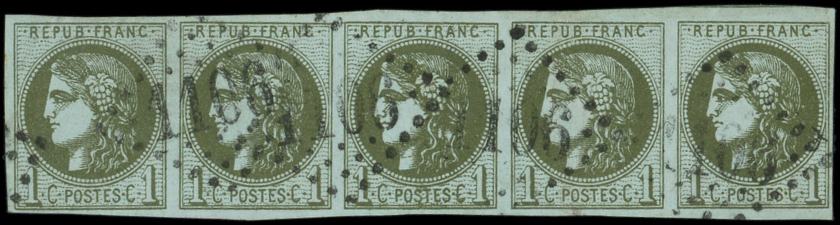foncé, nuance intense, BANDE de 5 obl. GC, petite froiss. sur le 3e timbre, mais néanmoins TTB (Image)