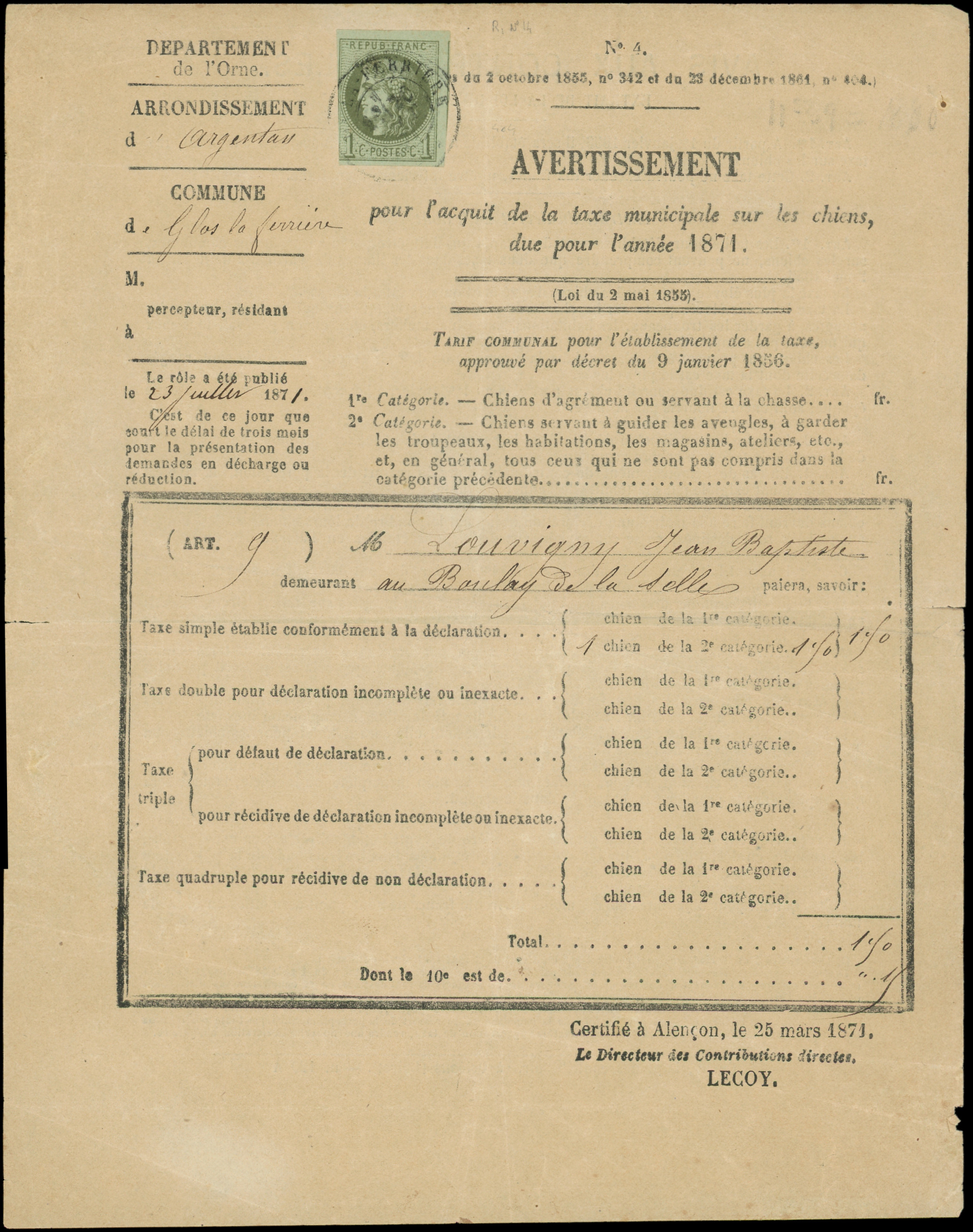 I, lég. touché à gauche, obl. càd CLOS-LA-FERRIRE 20/8/71 s. Avertissement pour l'acquit de la taxe sur les chiens, TB (Image)