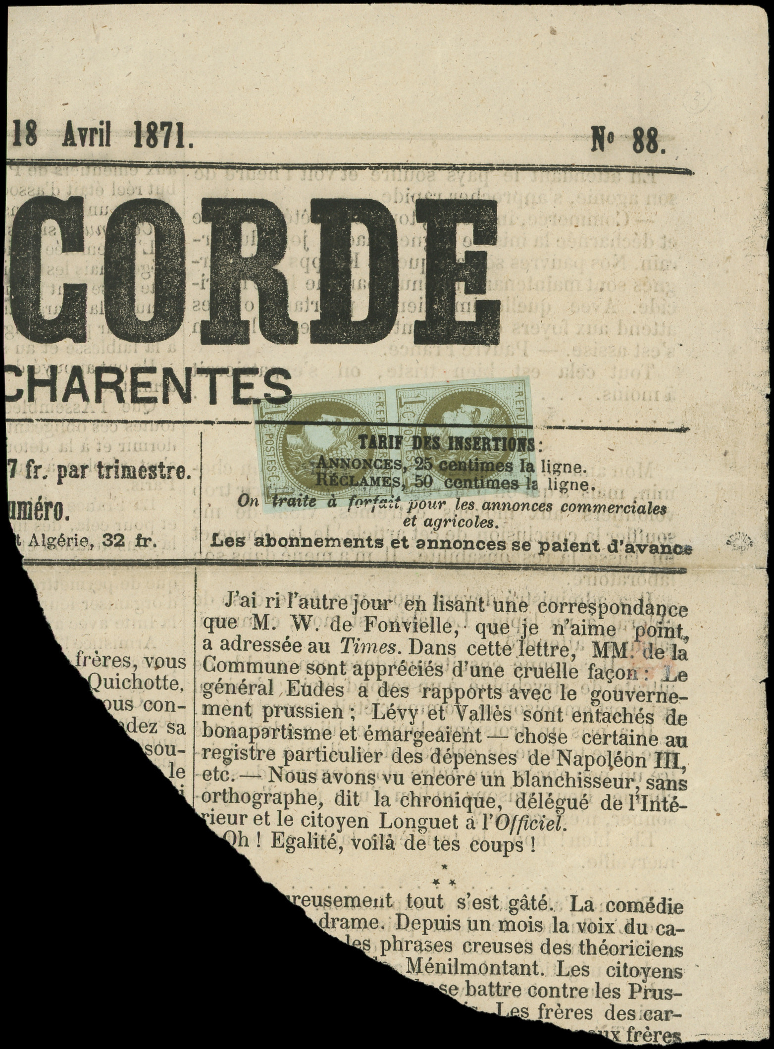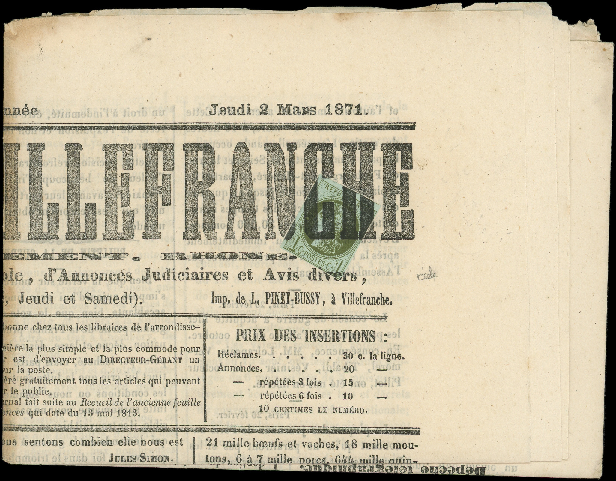 I, obl. TYPO s. le Journal de VILLEFRANCHE du 2/3/71, RR et TTB (Image)
