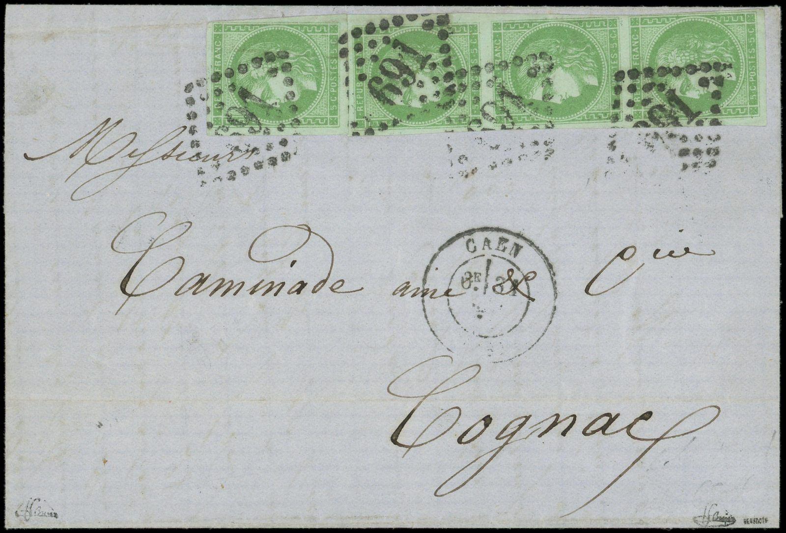 vert-EMERAUDE, BANDE de 3 + 1 ex., ce dernier inf. froiss., obl. GC 691 s. LAC, càd T17 CAEN 31/5/71, jolie nuance, TB. J (Image) (Image2)
