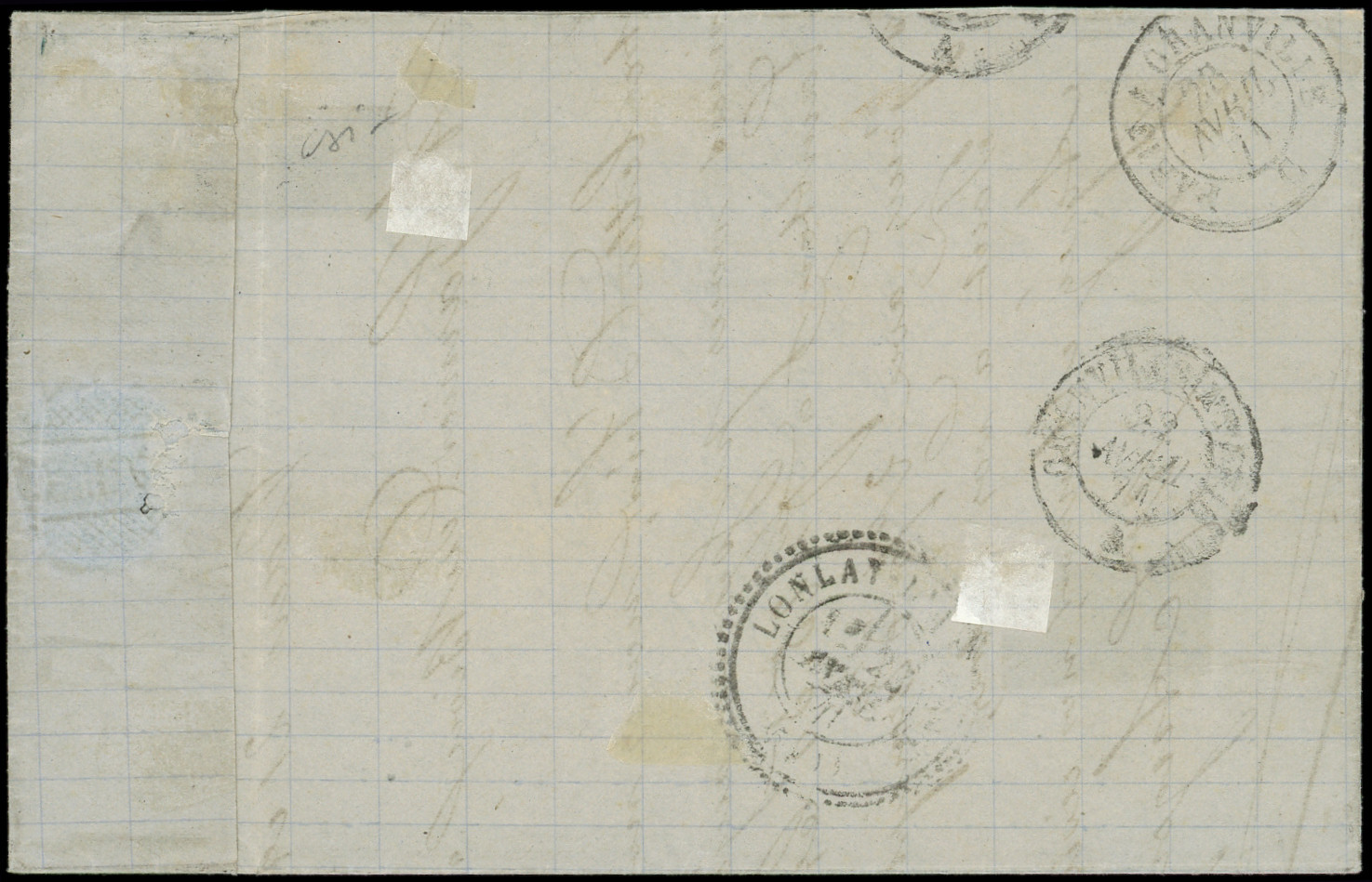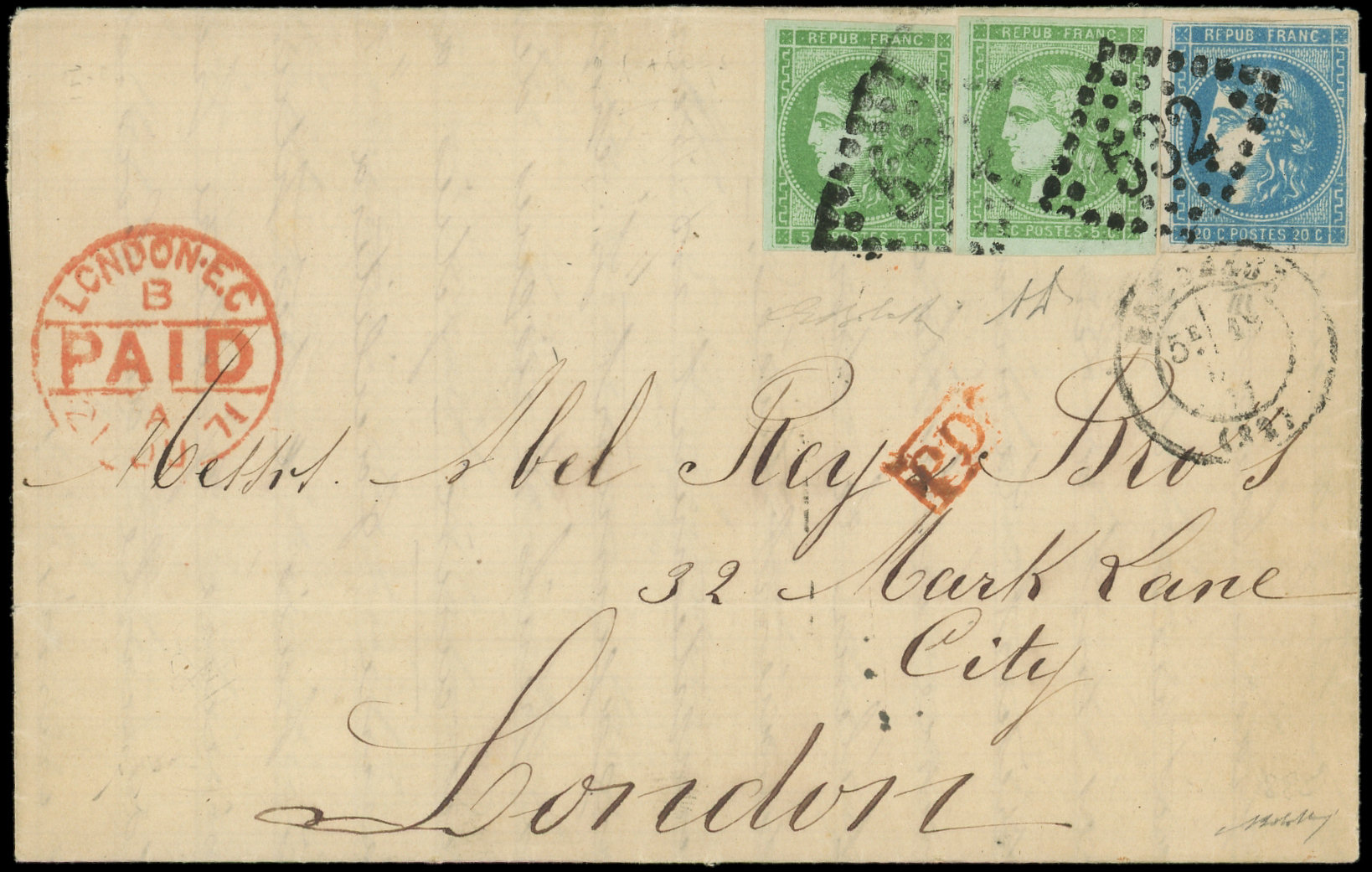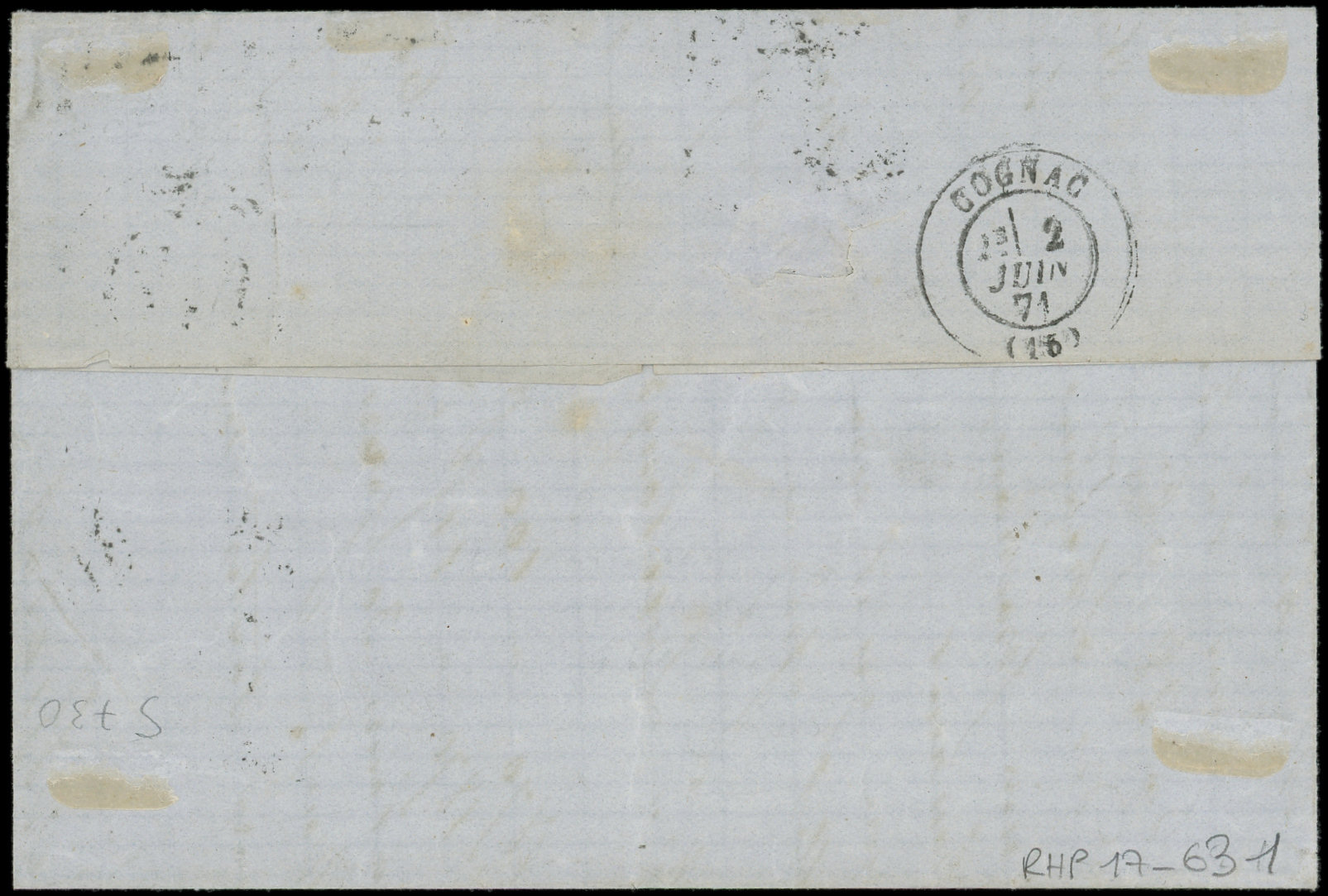 vert-jaune (2) et 20c. bleu T III R II, obl. GC 532 s. LAC de BORDEAUX 19/6/71, arr. LONDON 21/6, affrt RR, TTB (Image)