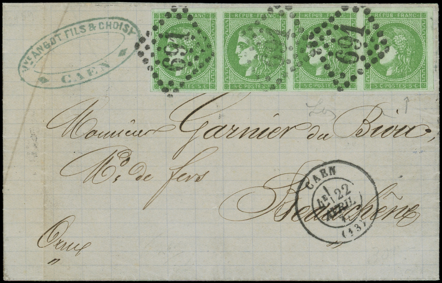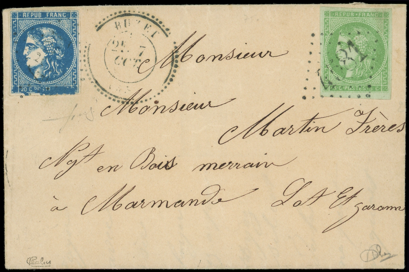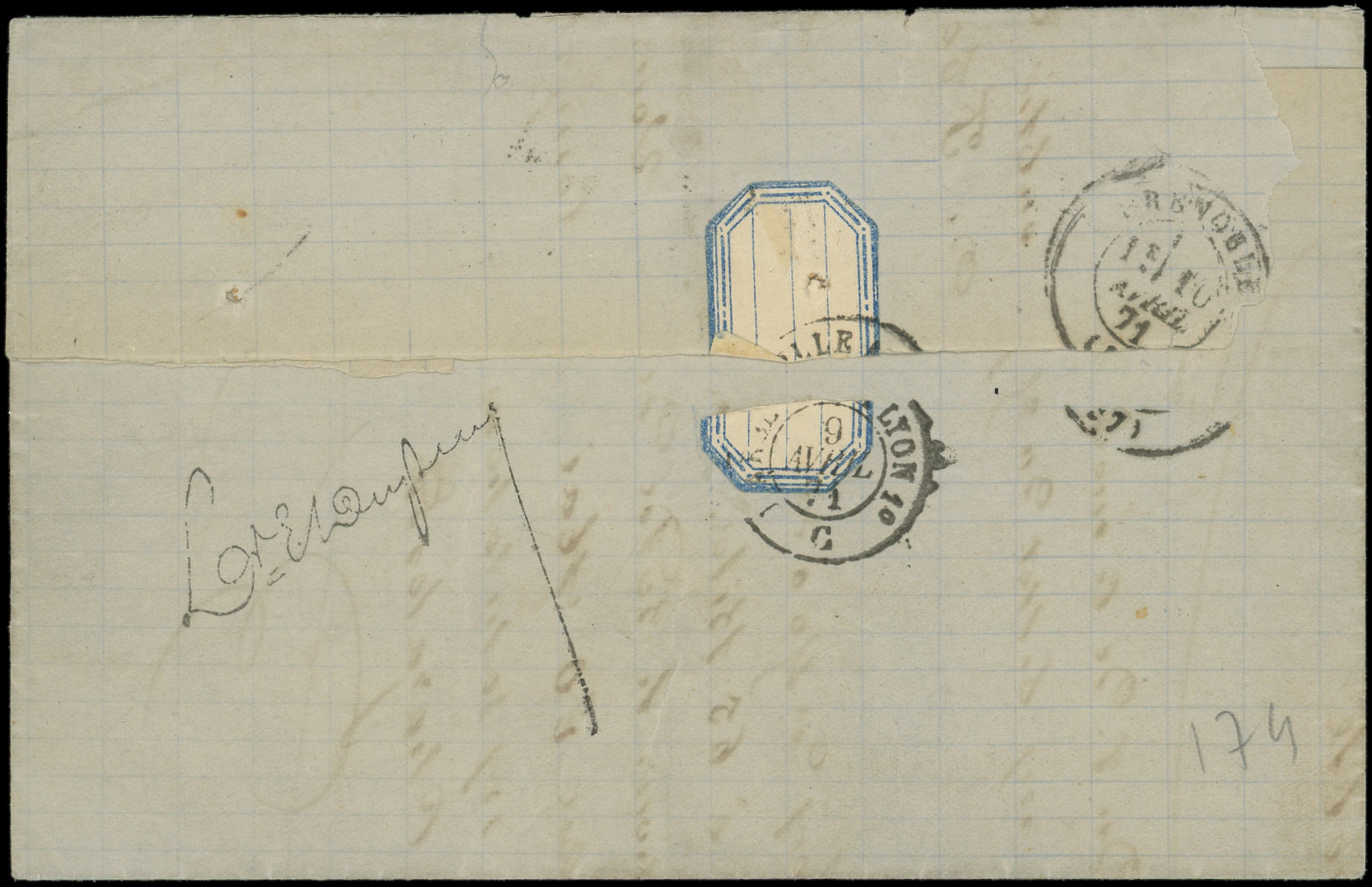 vert-jaune (2) et 20c. bleu T III R II, obl. GC 532 s. LAC de BORDEAUX 19/6/71, arr. LONDON 21/6, affrt RR, TTB (Image)
