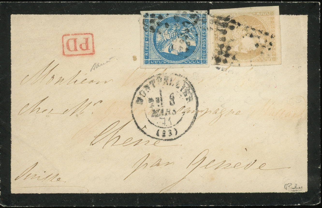 bistre terne R I et 20c. T II R I obl. s. Env., càd T17 MONTPELLIER 3/3/71, arr. CHENE-BOURG Suisse 5/3, TB. C (Image) (Image2)