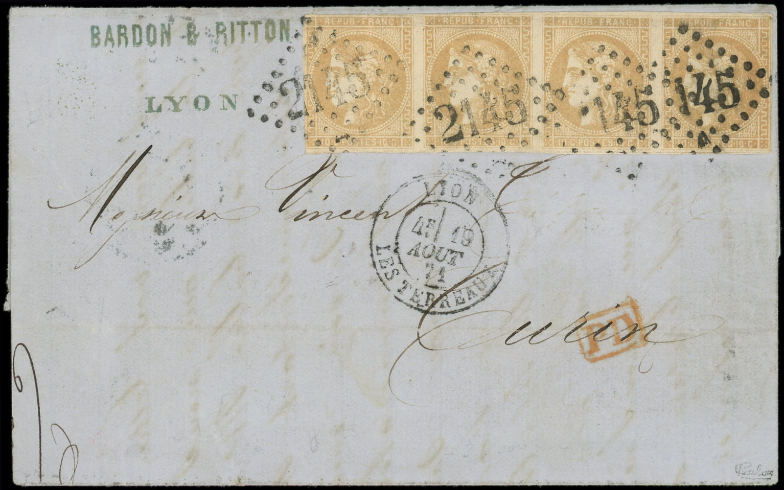 bistre-jaune R II, BANDE de 4 obl. GC 2145 s. LAC, càd LYON LES TERREAUX 19/8/71, arr. TORINO 21/8, 1er t. effl. sinon TB. C (Image) (Image2)