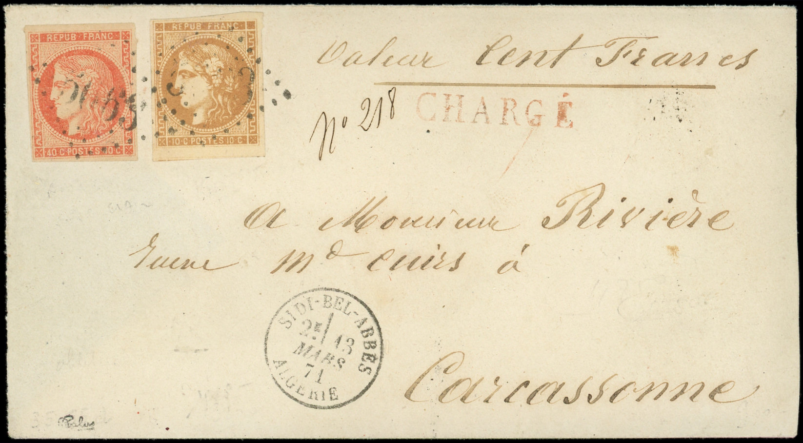 bistre-ROUX R I et 40c. ROUGE SANG, obl. GC 5063 s. Env. CHARGE, càd SIDI-BEL-ABBES 13/3/71, arr. CARCASSONNE 21/3, Superbe. C (Image) (Image2)