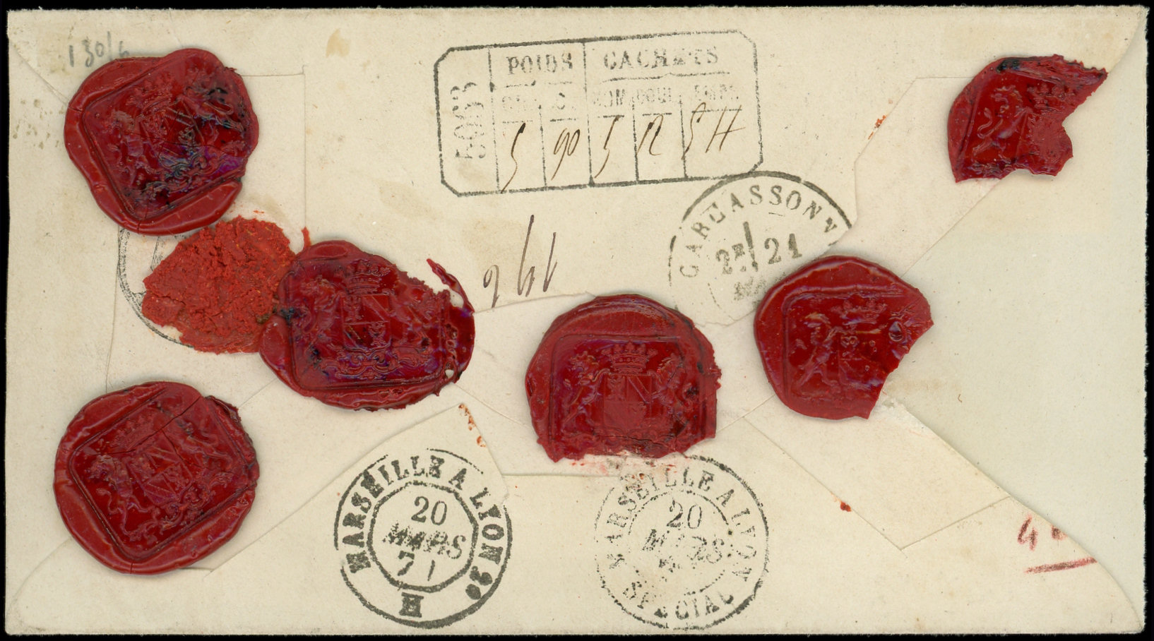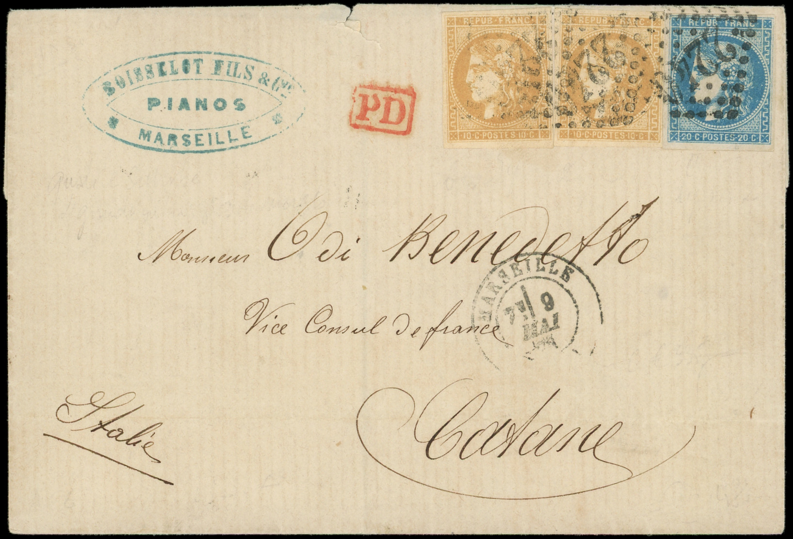 R II (2) et 20c. T III R II obl. GC 2240 s. LSC, càd Marseille 9/5/71 et arr. CATANIA 13/5, TB (Image) (Image2)