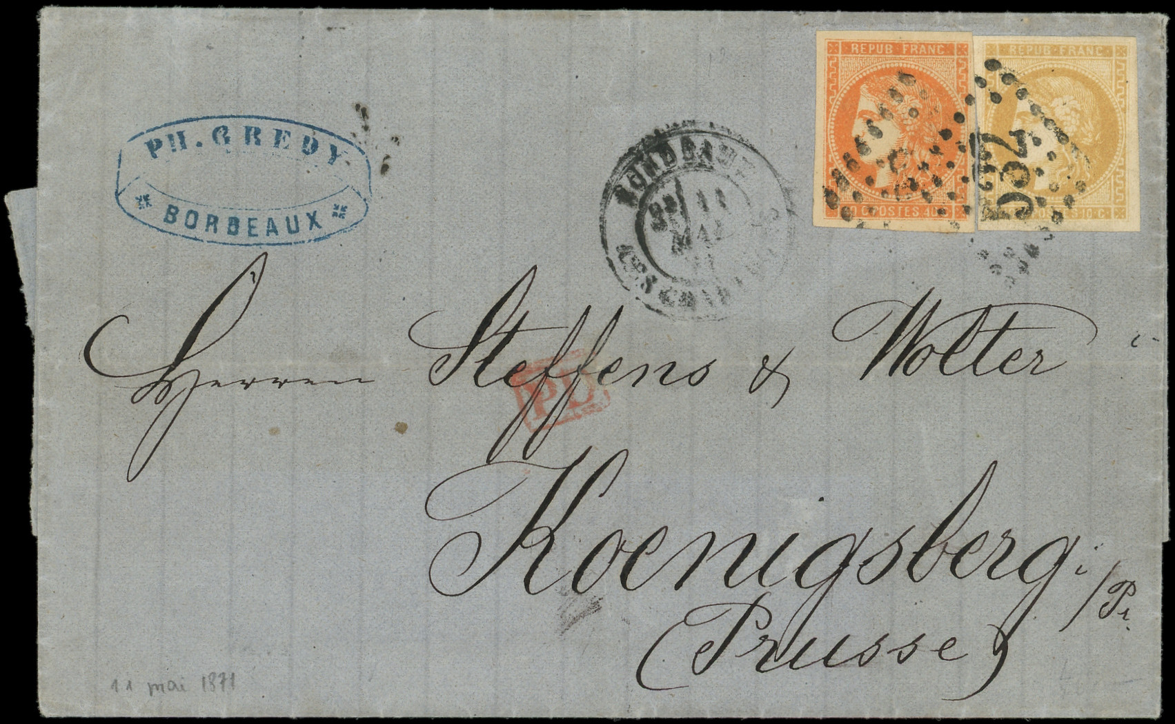 II et 40c. très grandes marges, obl. GC 532 s. LAC, càd BORDEAUX LES CHARTRONS 11/5/71, pour KOENISBERG PRUSSE 15/11, Superbe (Image)