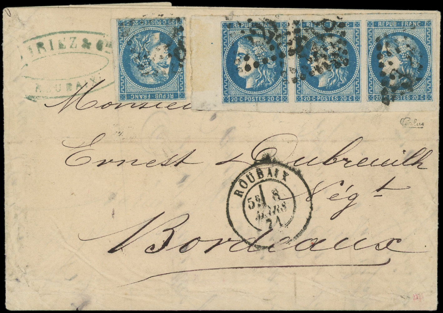 III R II, BANDE de 3 cdf et 1 ex., obl. GC 3218 s. LAC, càd T17 ROUBAIX 8/3/71, arr. Bordeaux, RR et TTB. C (Image) (Image2)