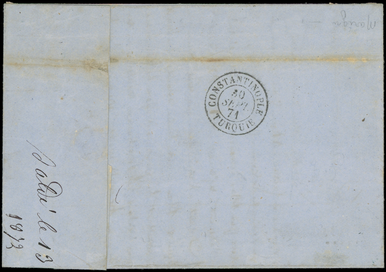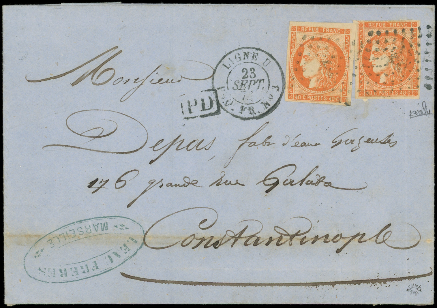 2 ex. obl. ANCRE s. LAC, càd LIGNE U PAQ. FR. N°3 23/9/71, arr. CONSTANTINOPLE 30/9, R et TTB (Image) (Image2)