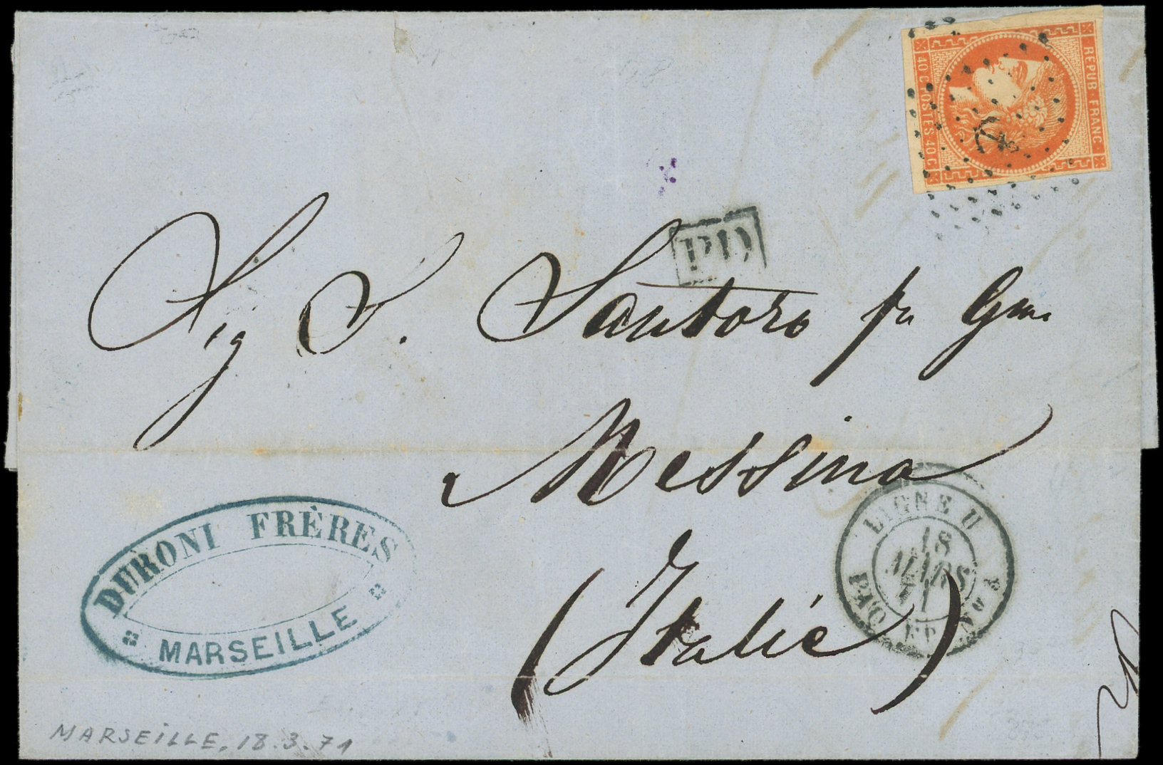 obl. ANCRE s. LSC de Marseille 18/3/71, càd LIGNE U PAQ FR N°3, arr. MESSINA, TB (Image)