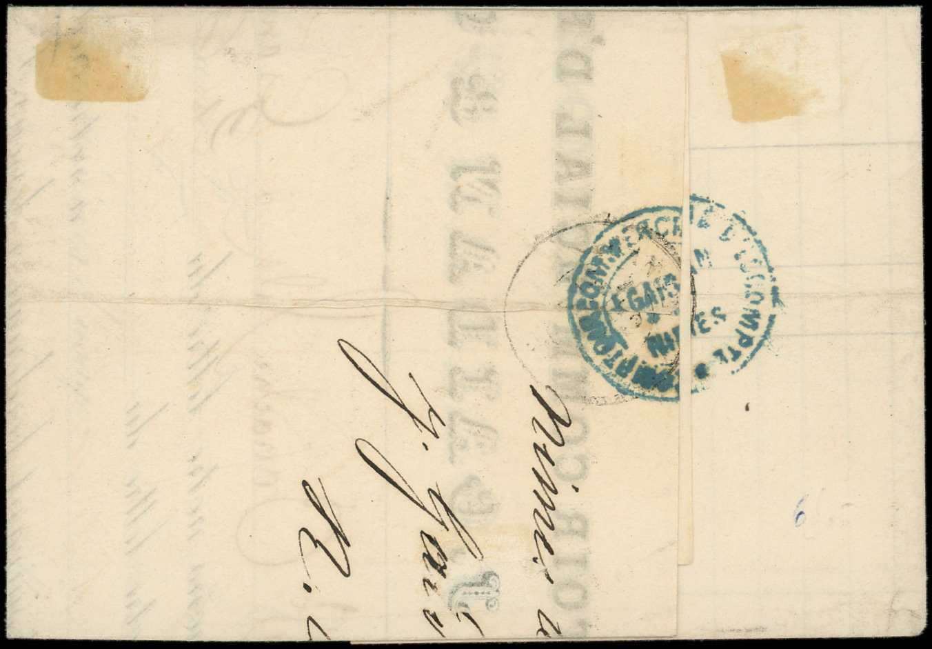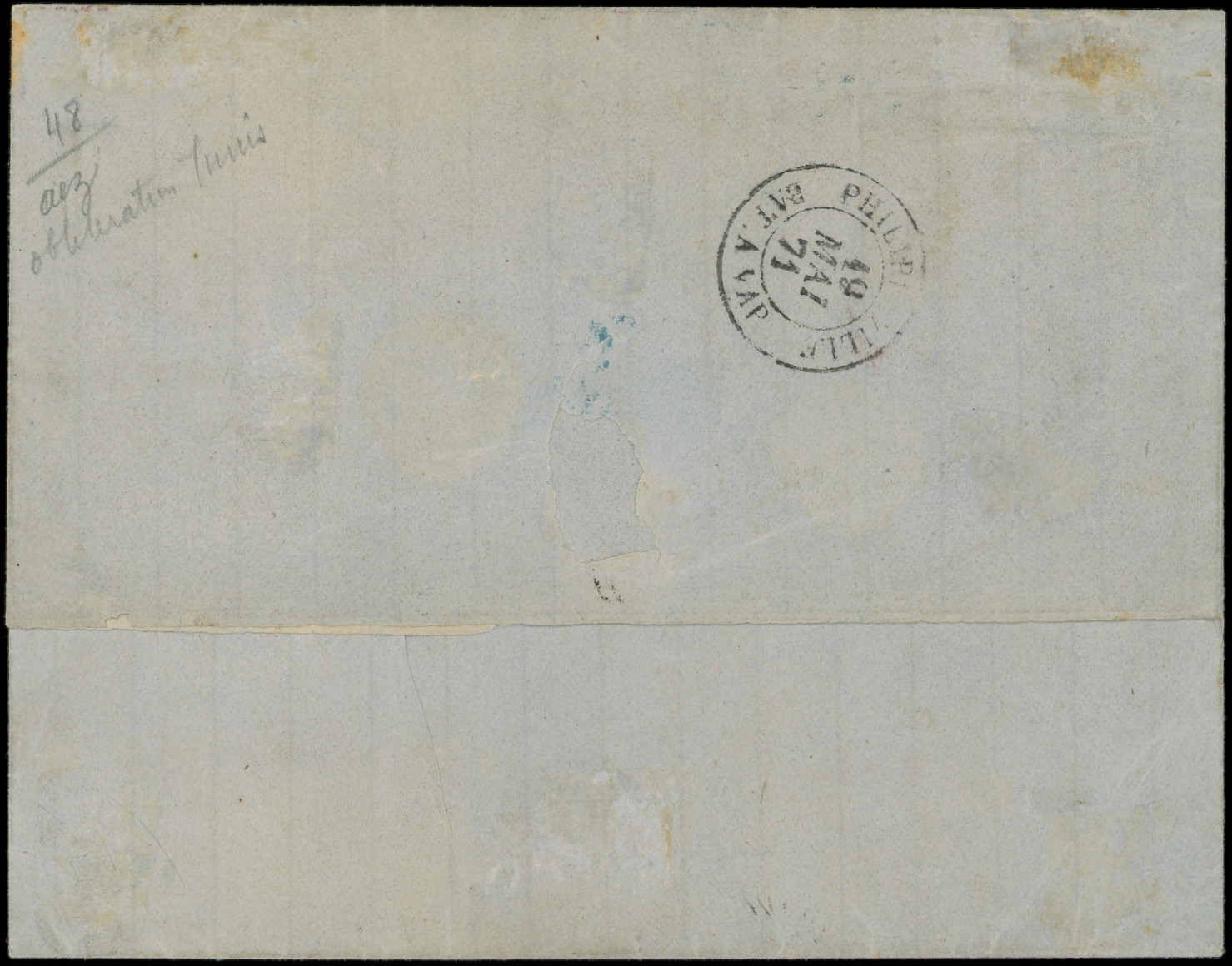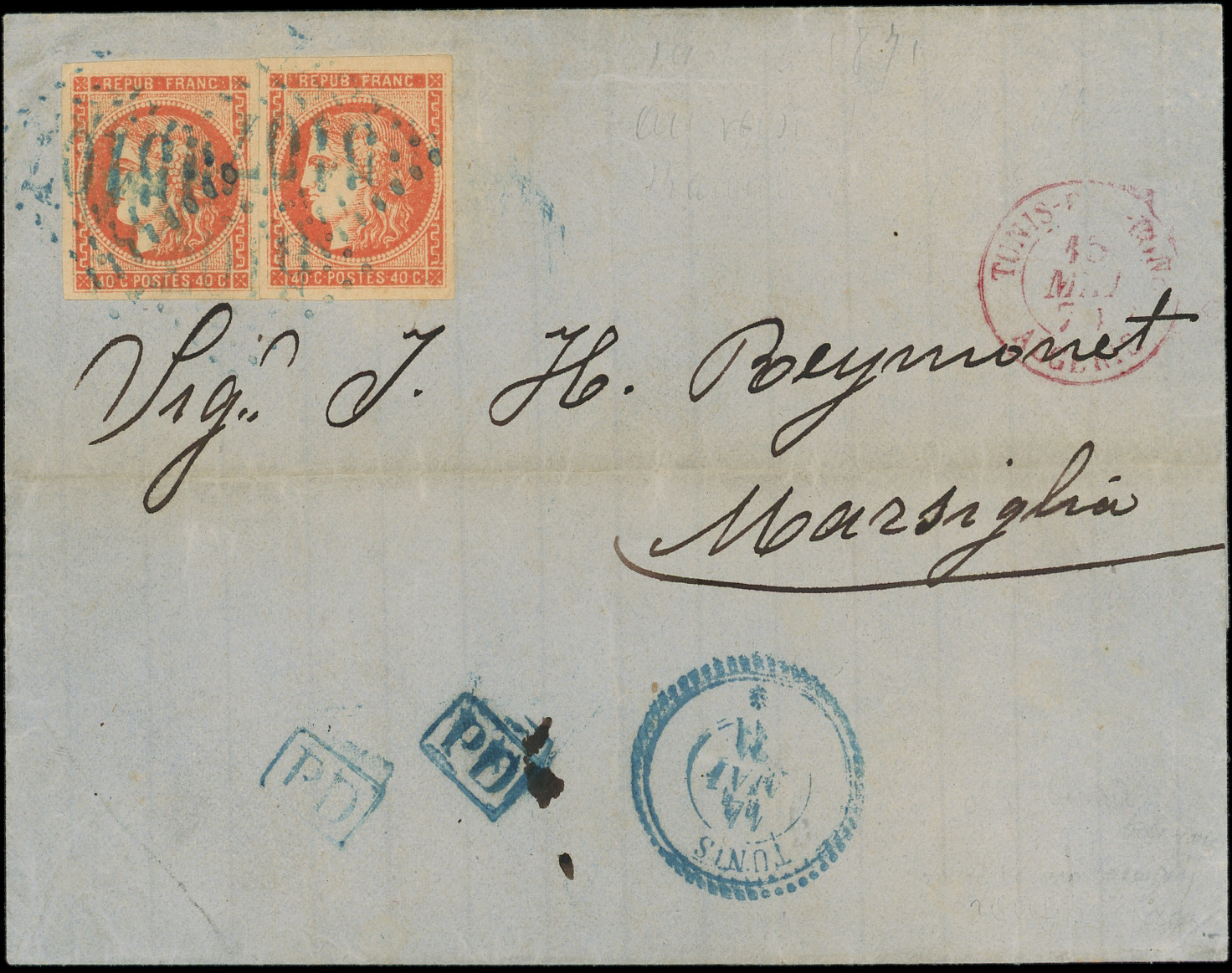 vif (certif. Roumet pour rouge vif), PAIRE obl. GC BLEU 5107 s. LSC, càd TUNIS 14/5/71 et càd rouge TUNIS-PAR-BONE ALGERIE, au verso càd PHILIPPEVILLE BAT A VAP 19/5, pour Marseille, combinaison TB (Image) (Image2)