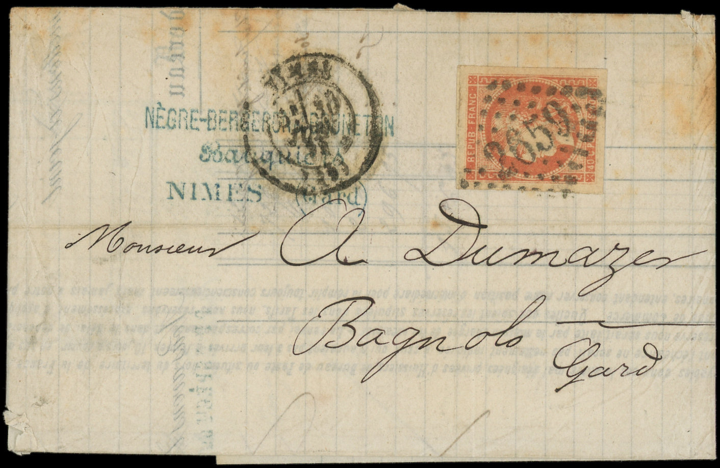 ROUGE-SANG clair, très belles marges, obl. GC 2659 s. LAC, càd T17 NIMES 30/6/71, TB (Image)