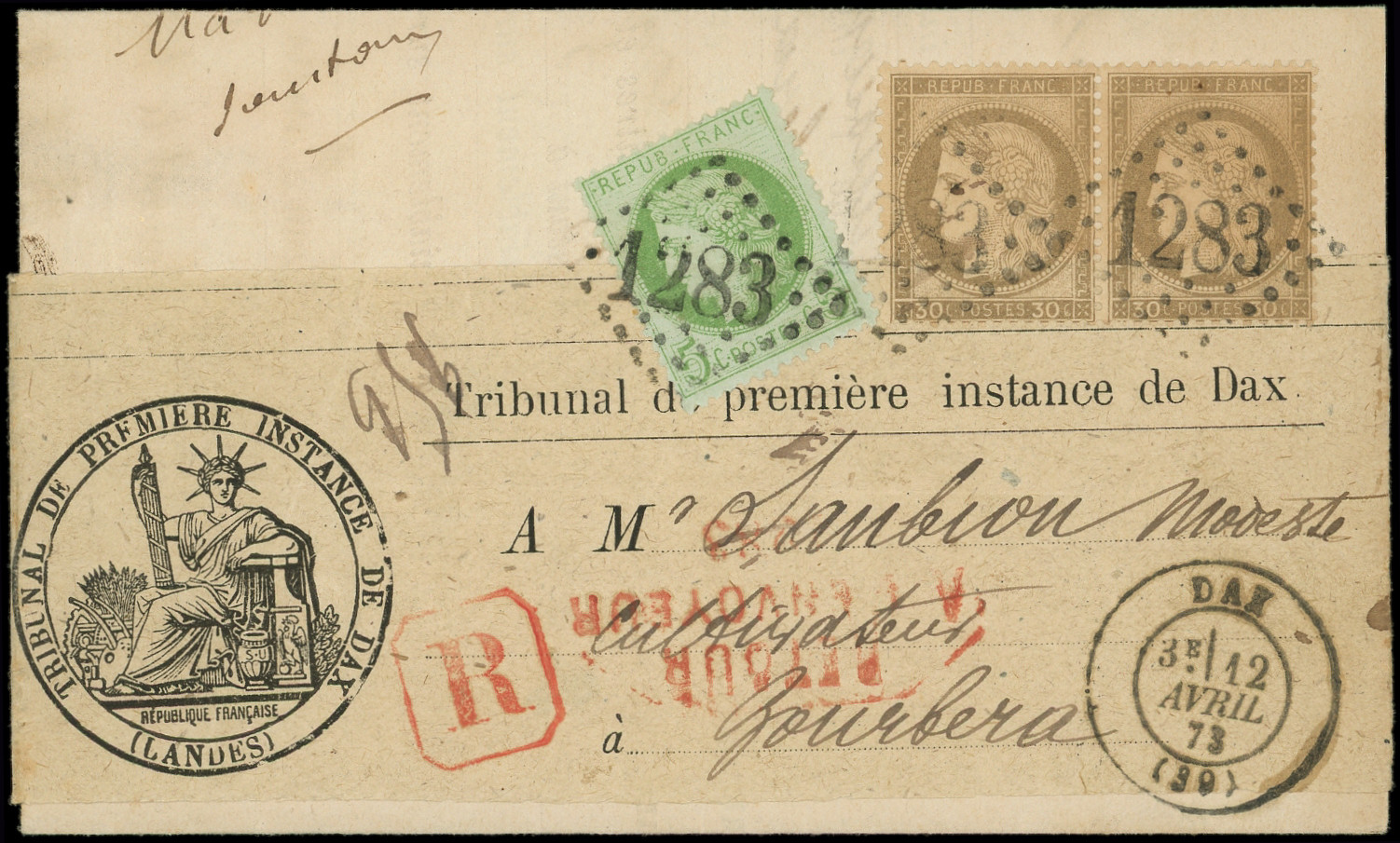 vert-jaune sur azuré et 30c. brun PAIRE, tous obl. GC 1283 s. Imprimé Rec. sous bande, càd T17 DAX 12/4/73, TTB (Image)