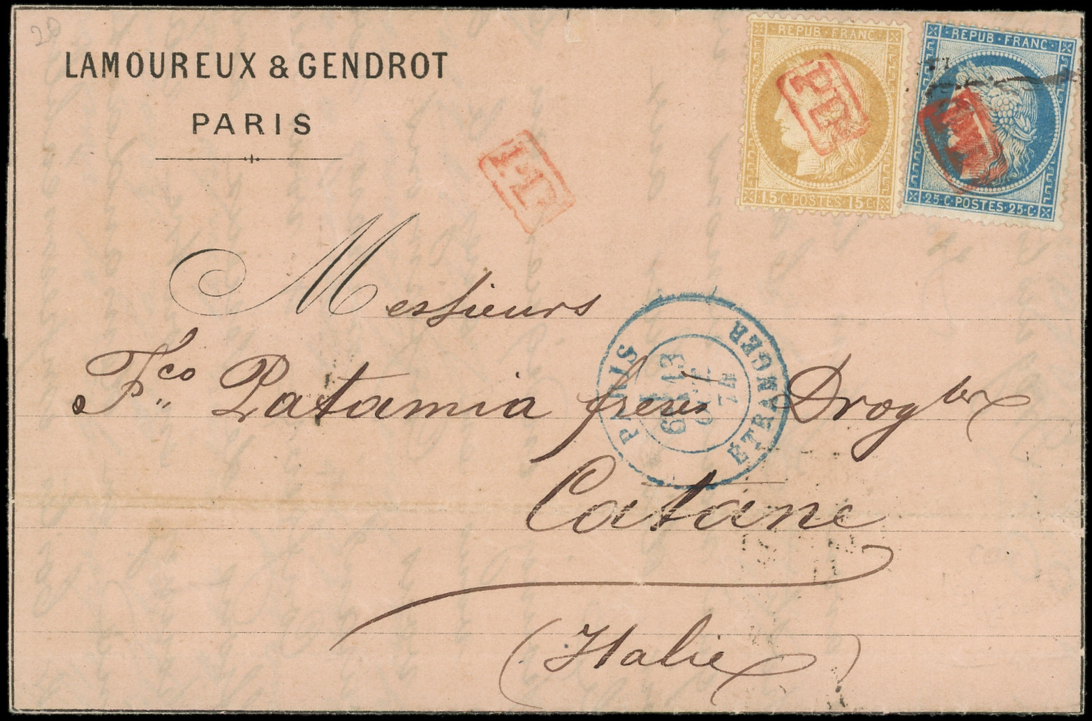 et 25c. obl. PD rouge encadré s. LAC et répété à côté, càd BLEU PARIS ETRANGER 13/10/74, arr. CATANIA 17/10, combinaison Rare et TB (Image) (Image2)