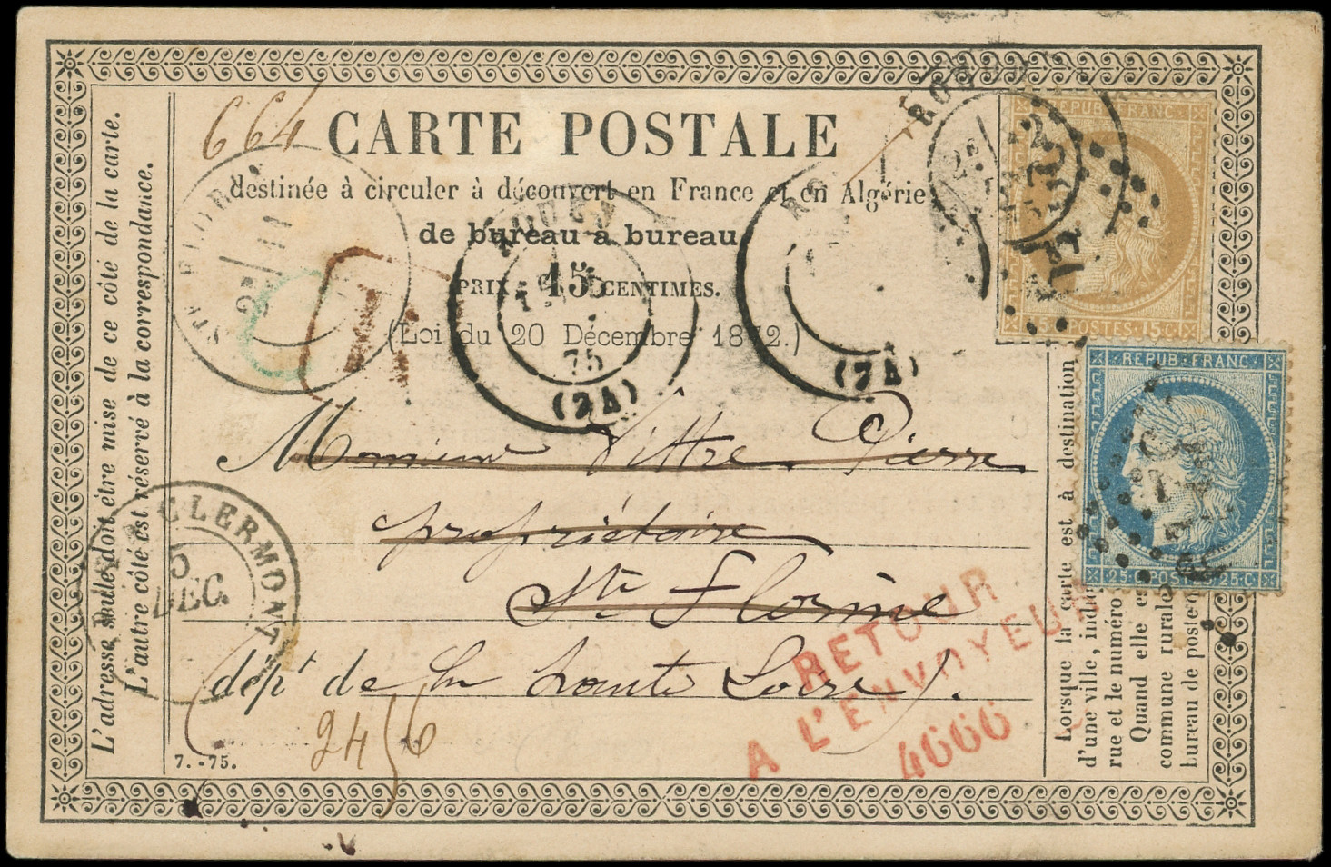 et 25c. obl. GC 3219 s. CP Rec. de Mise en Demeure, càd ROUEN 15/12/75 pour Ste Florine et "retour à l'envoyeur", TB (Image)