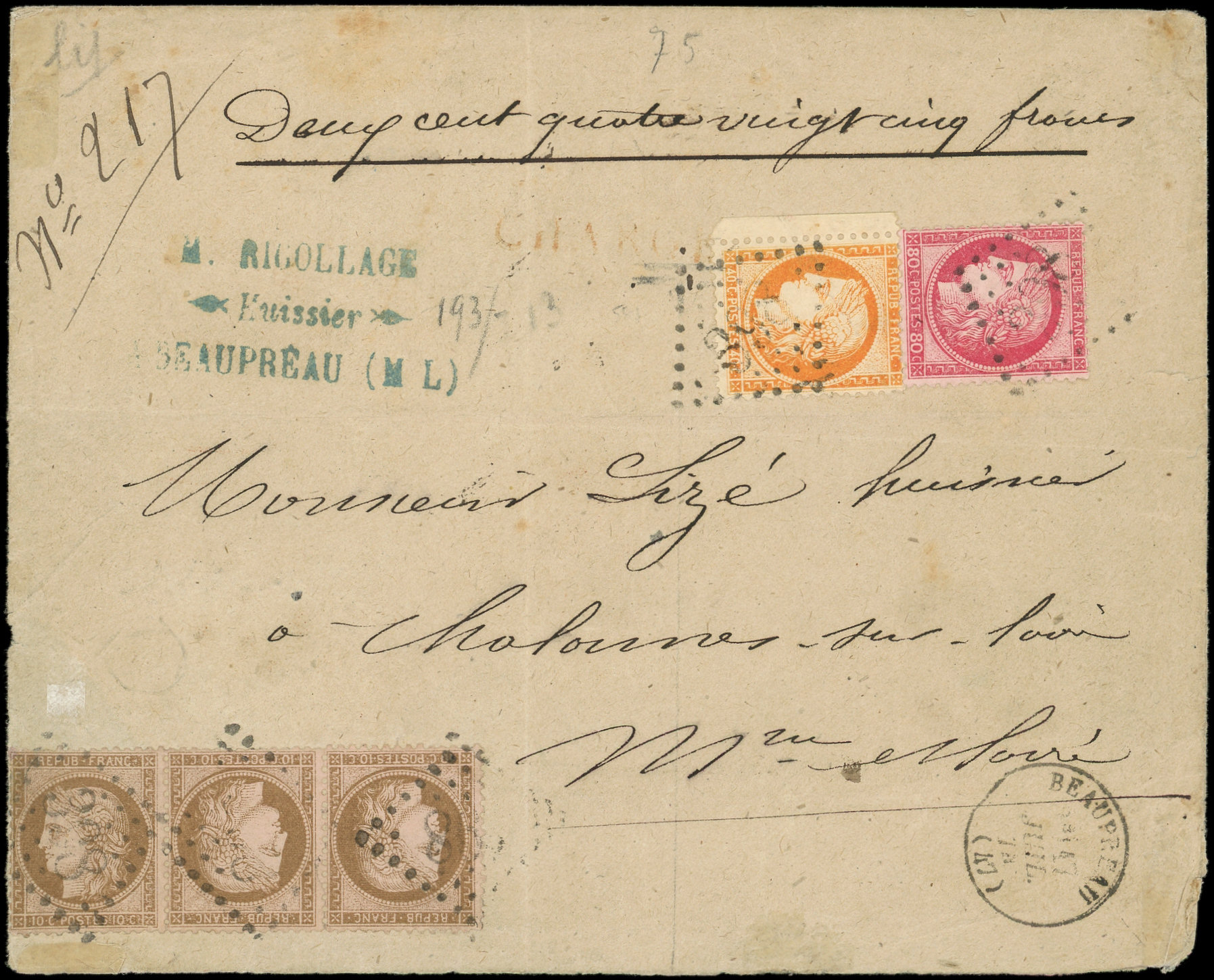 sur rose, TETE BECHE dans une BANDE de 3 + N°38 et 57, obl. GC 398 s. Env. CHARGE, càd T16 BEAUPREAU 13/7/74, RR et TB (Image) (Image2)