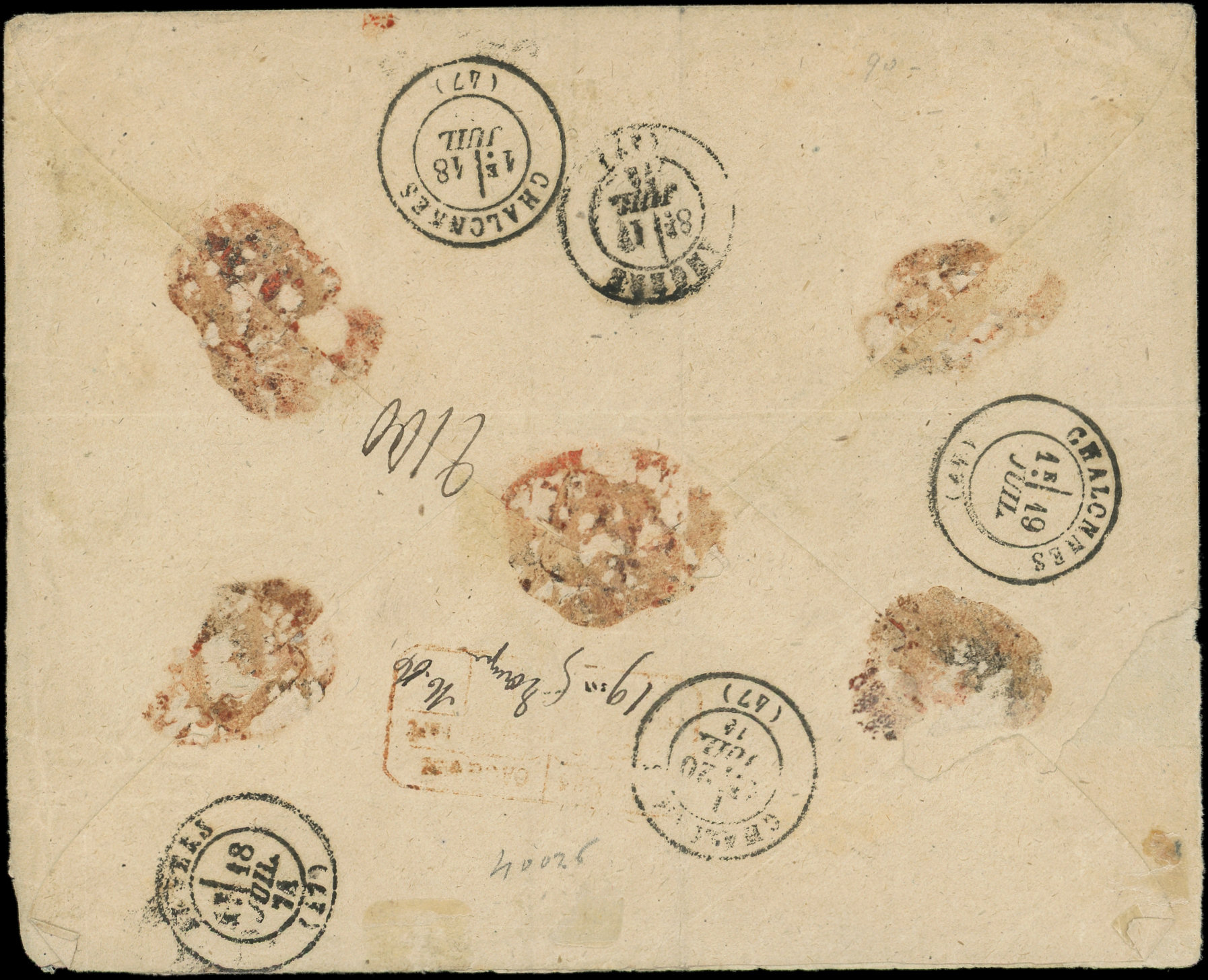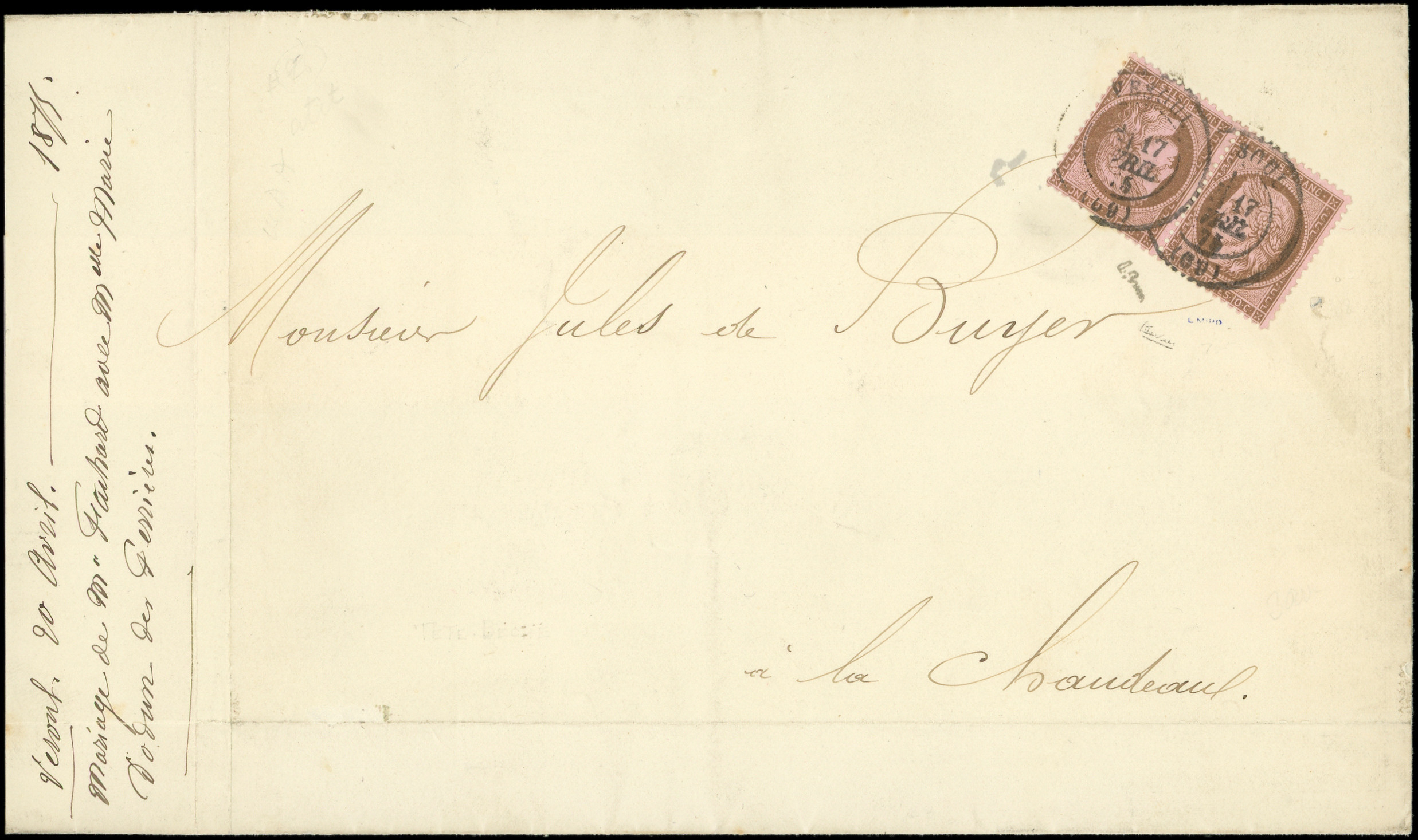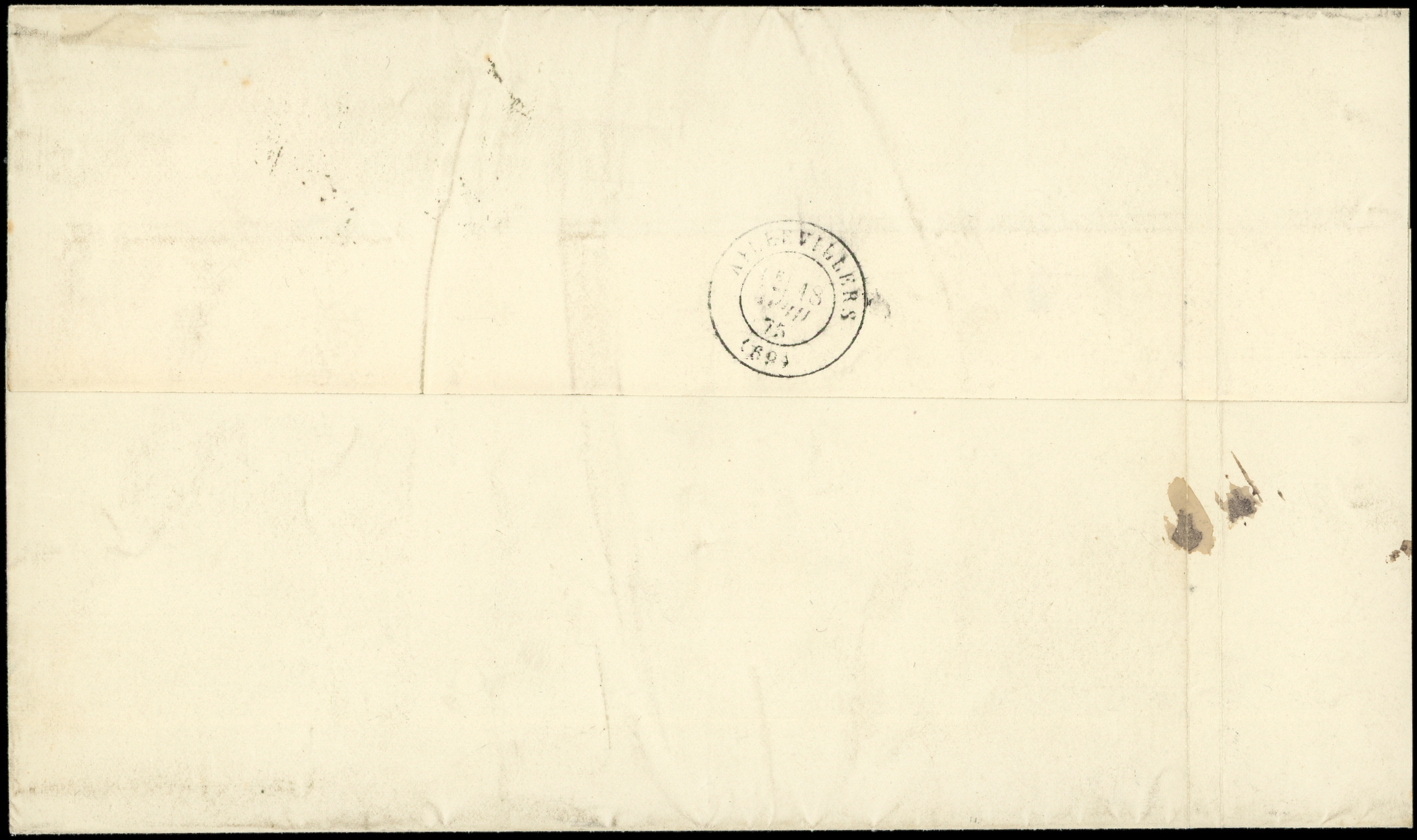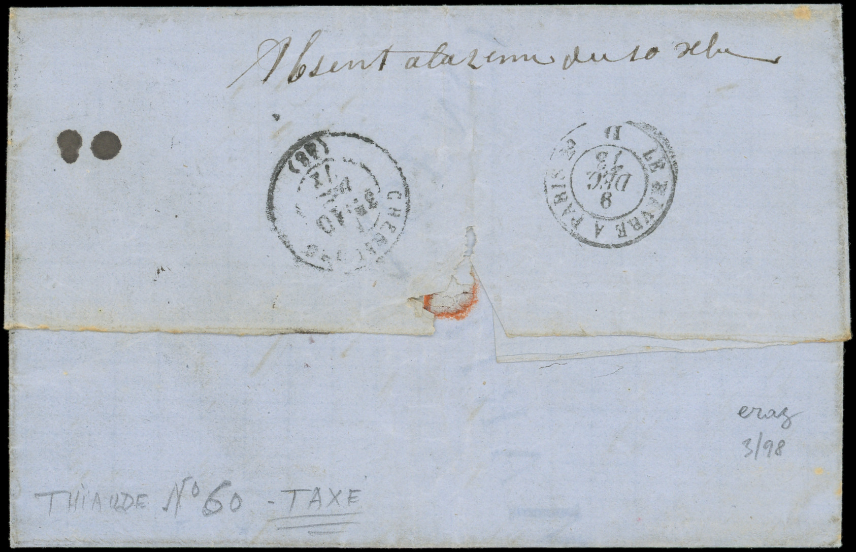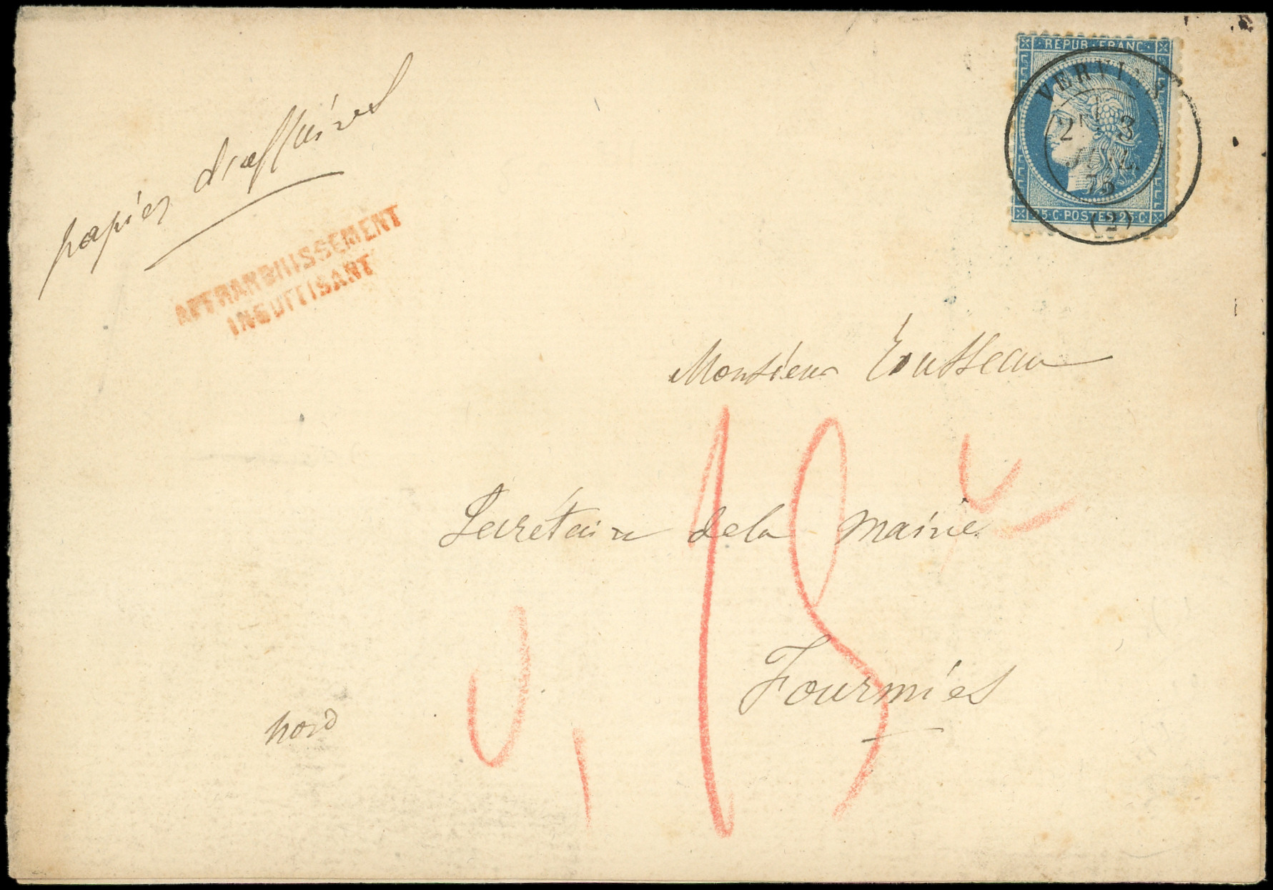 obl. càd T17 VERVINS 3/7/75 s. papiers d'affaires, "affrt insuff" et TAXE 0,15c. au crayon rouge, RR ainsi, TTB (Image)