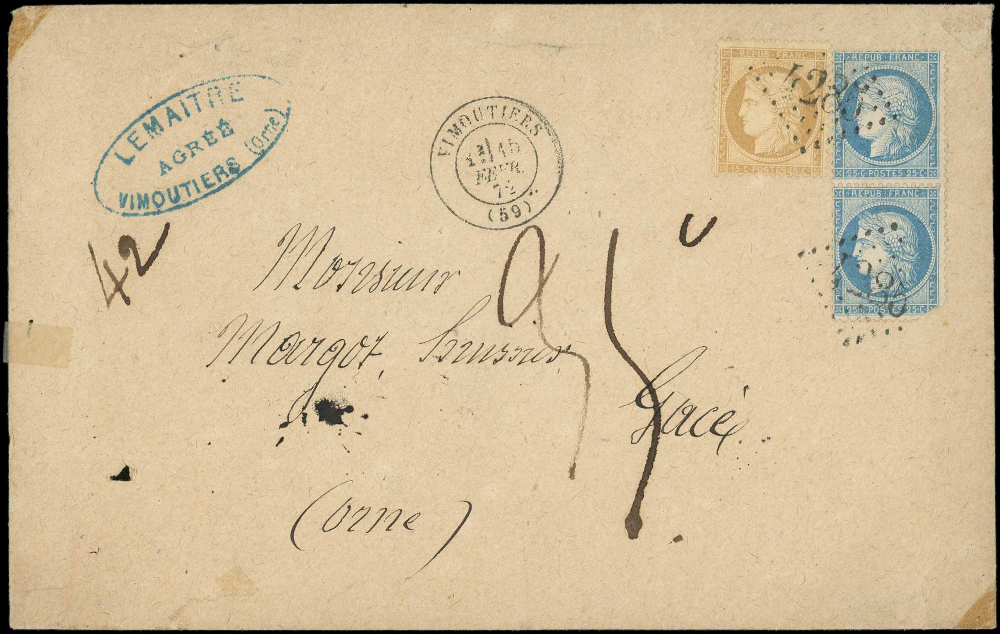 et N°60A 25c. bleu T I PAIRE (1 ex. défx), obl. GC 4285 s. Env., càd T17 VIMOUTIERS 15/2/72, TAXE "35c.", frappes TTB (Image)