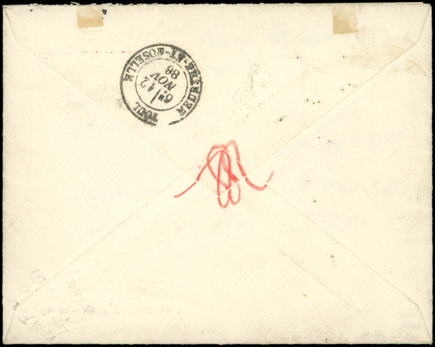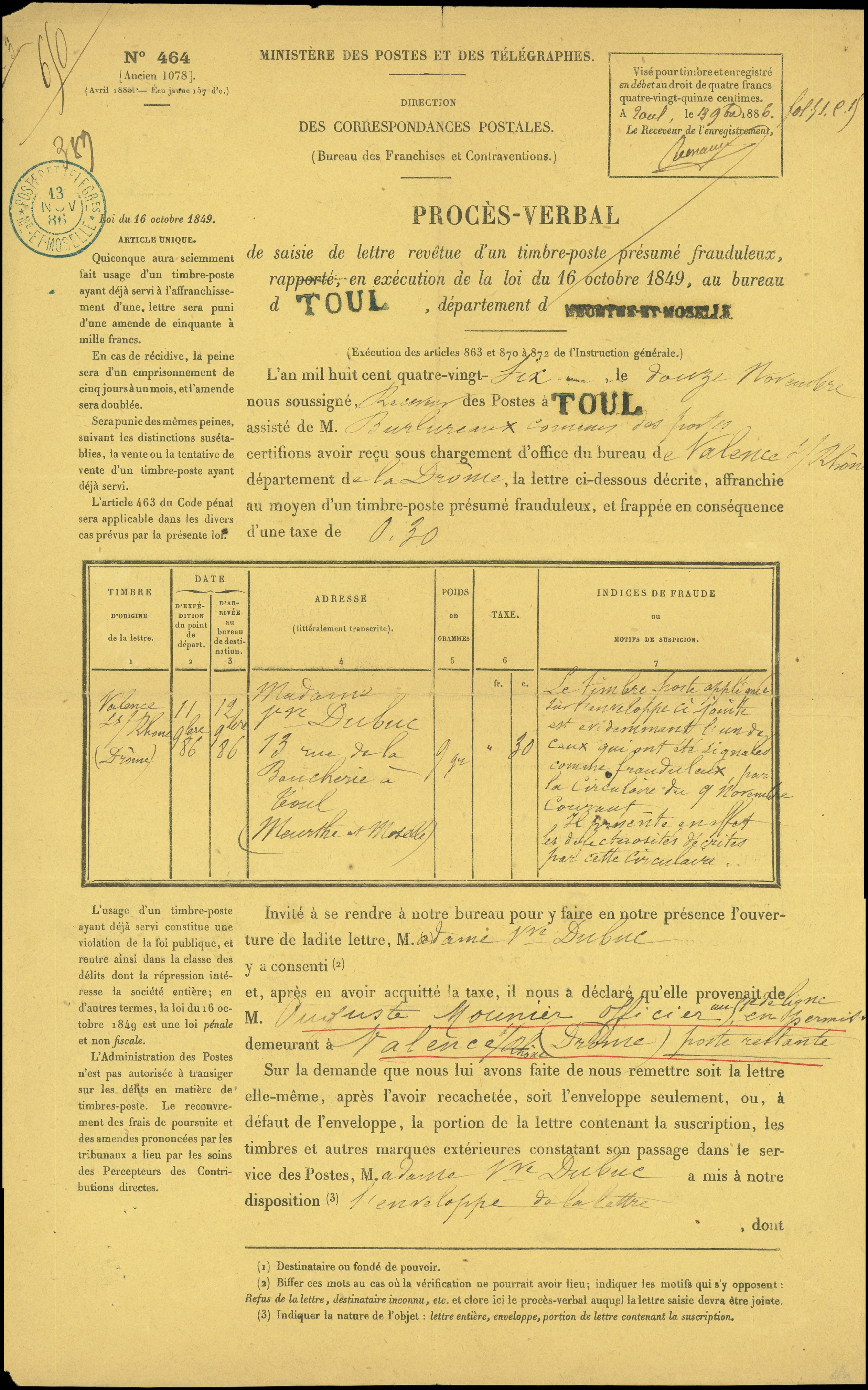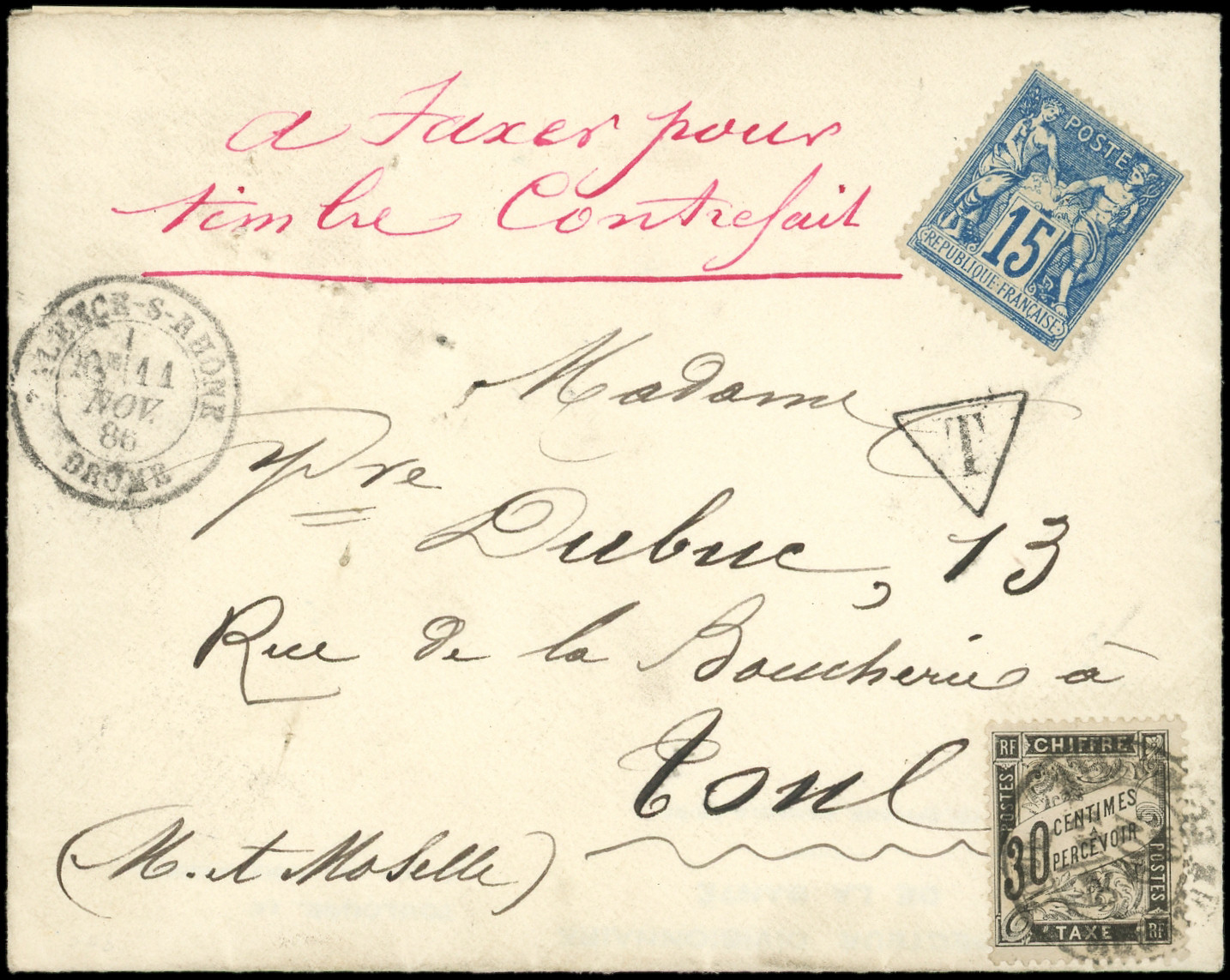 FAUX pour servir, non obl. s. Env., càd VALENCE s. RHONE 11/11/86, T dans un triangle, " a taxer pour timbre contrefait" et Taxe 30c. N°18 obl. càd TOUL 12/11 à l'arrivée, il est joint le procès verbal complet, RR, TTB (Image) (Image2)