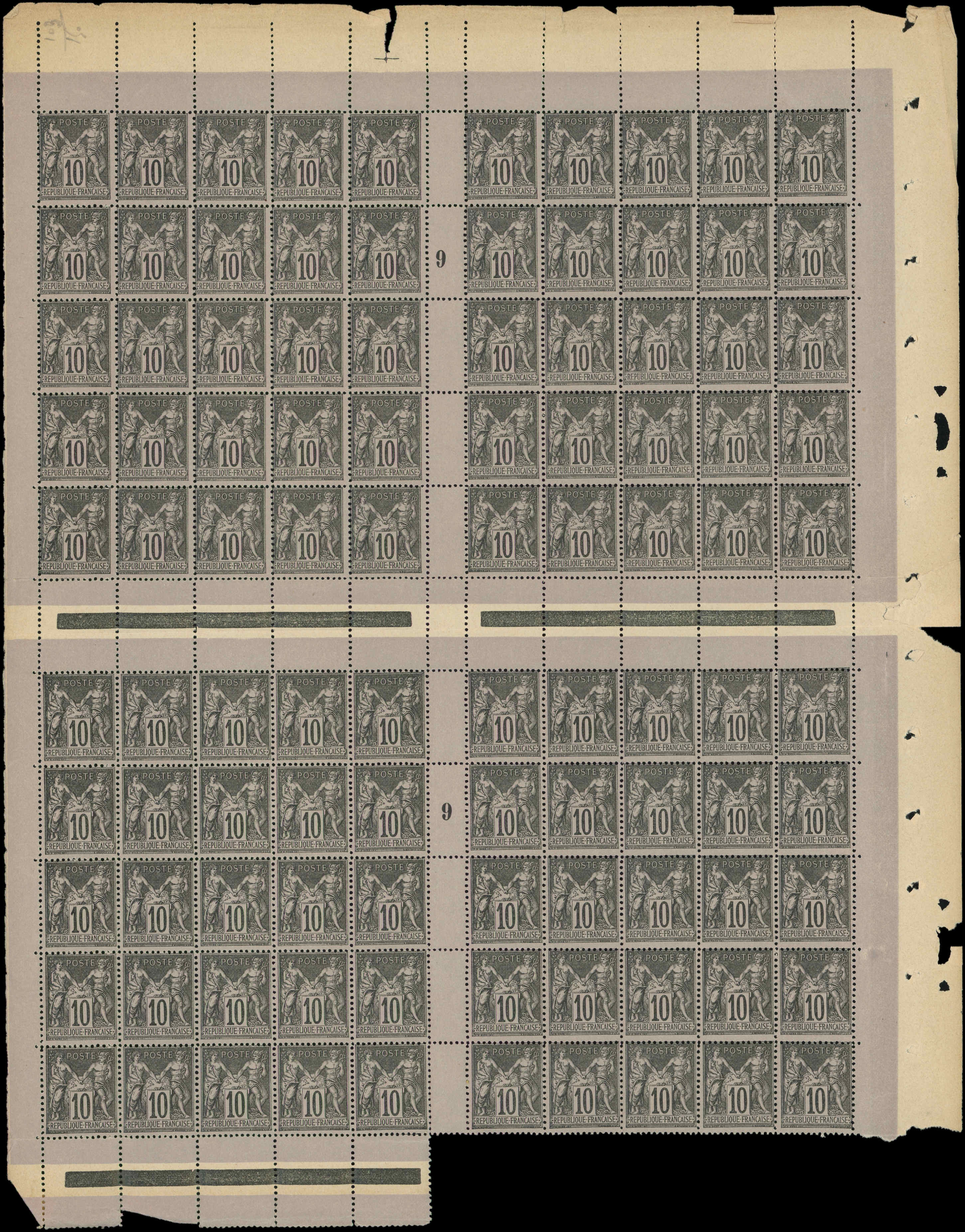 sur lilas, FEUILLE de 100, Millés. 9, un panneau de 25 très bien centré, qqs froiss. sur les bords mais tous les timbres très frais et TB (Image)