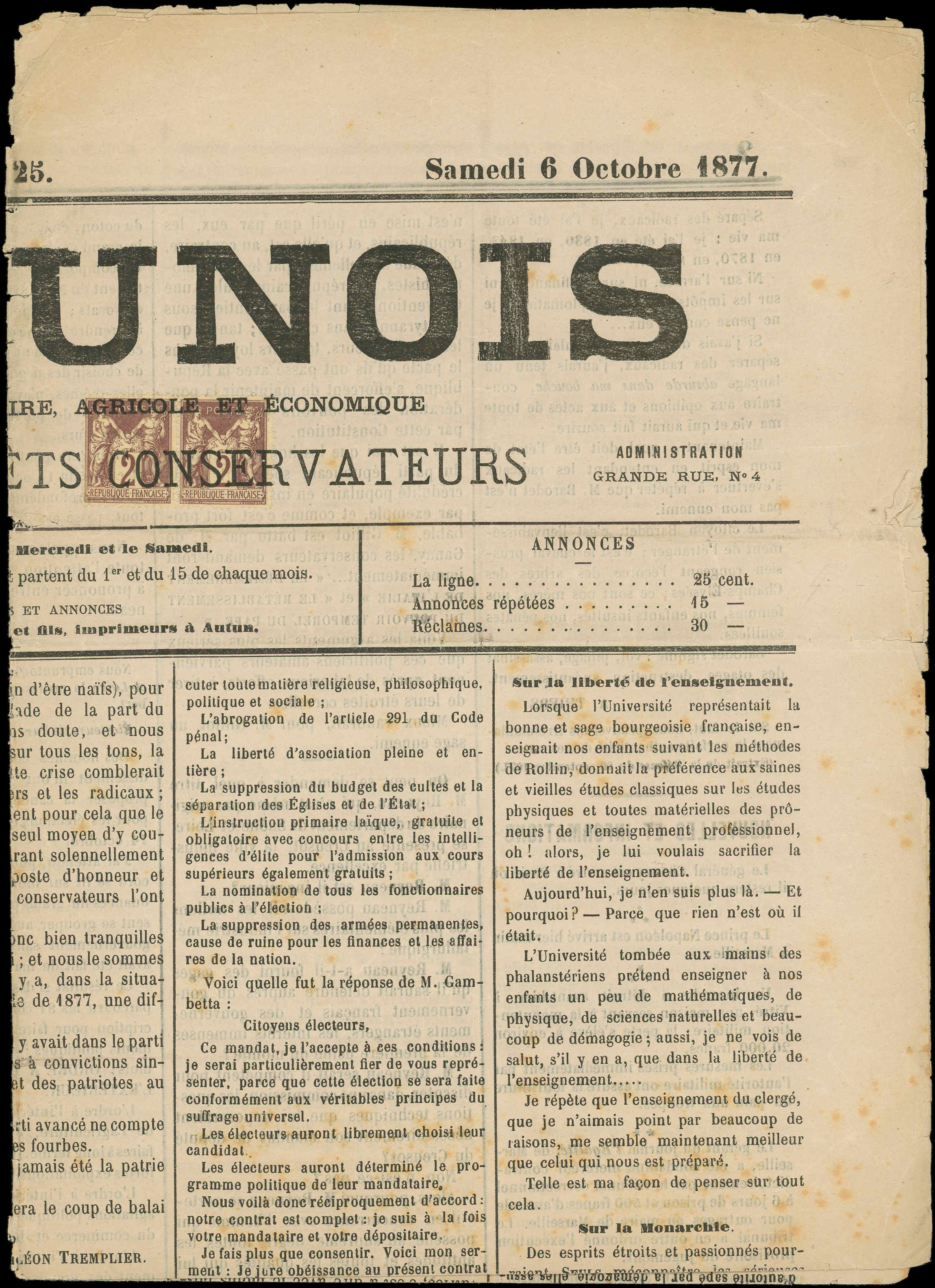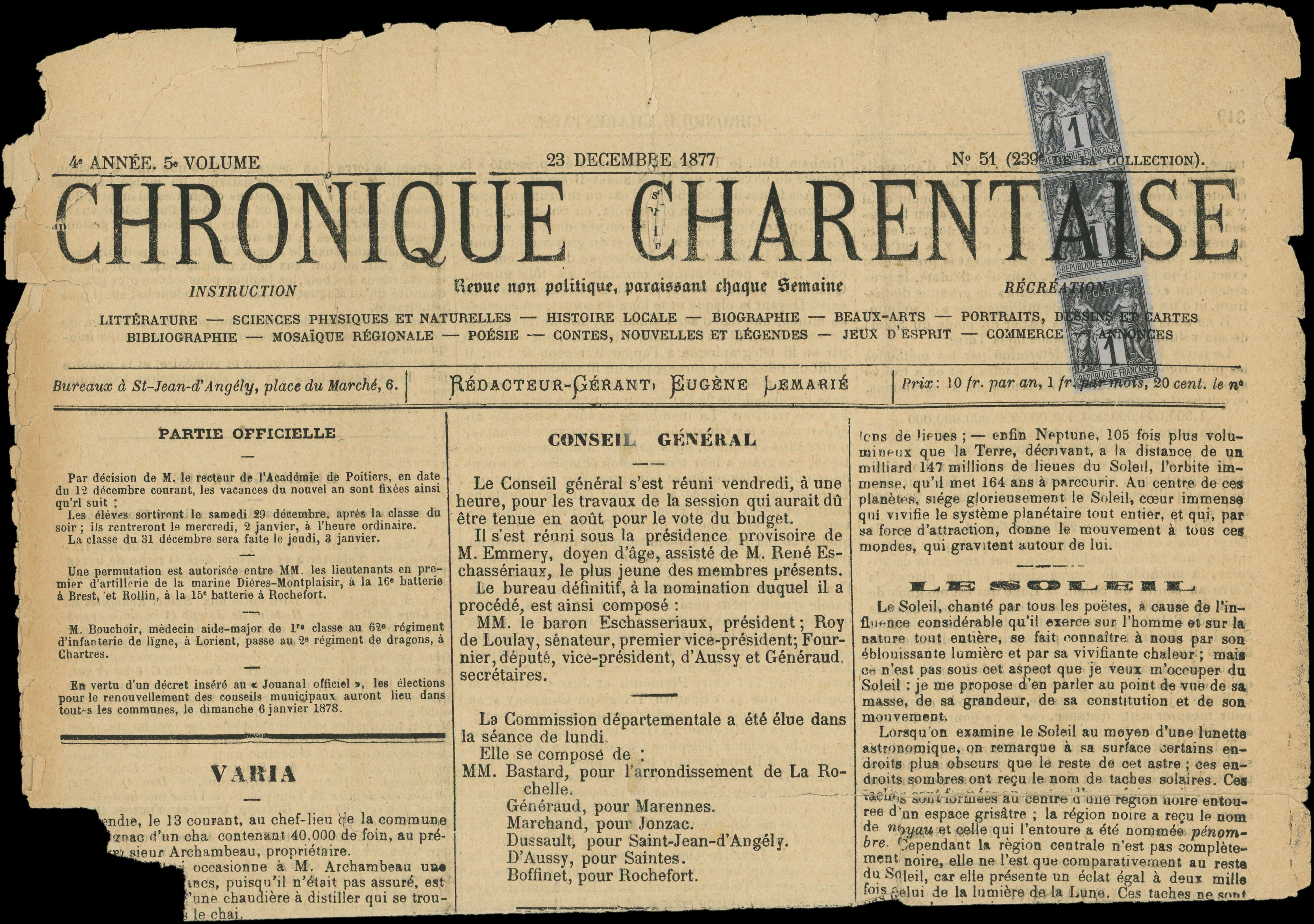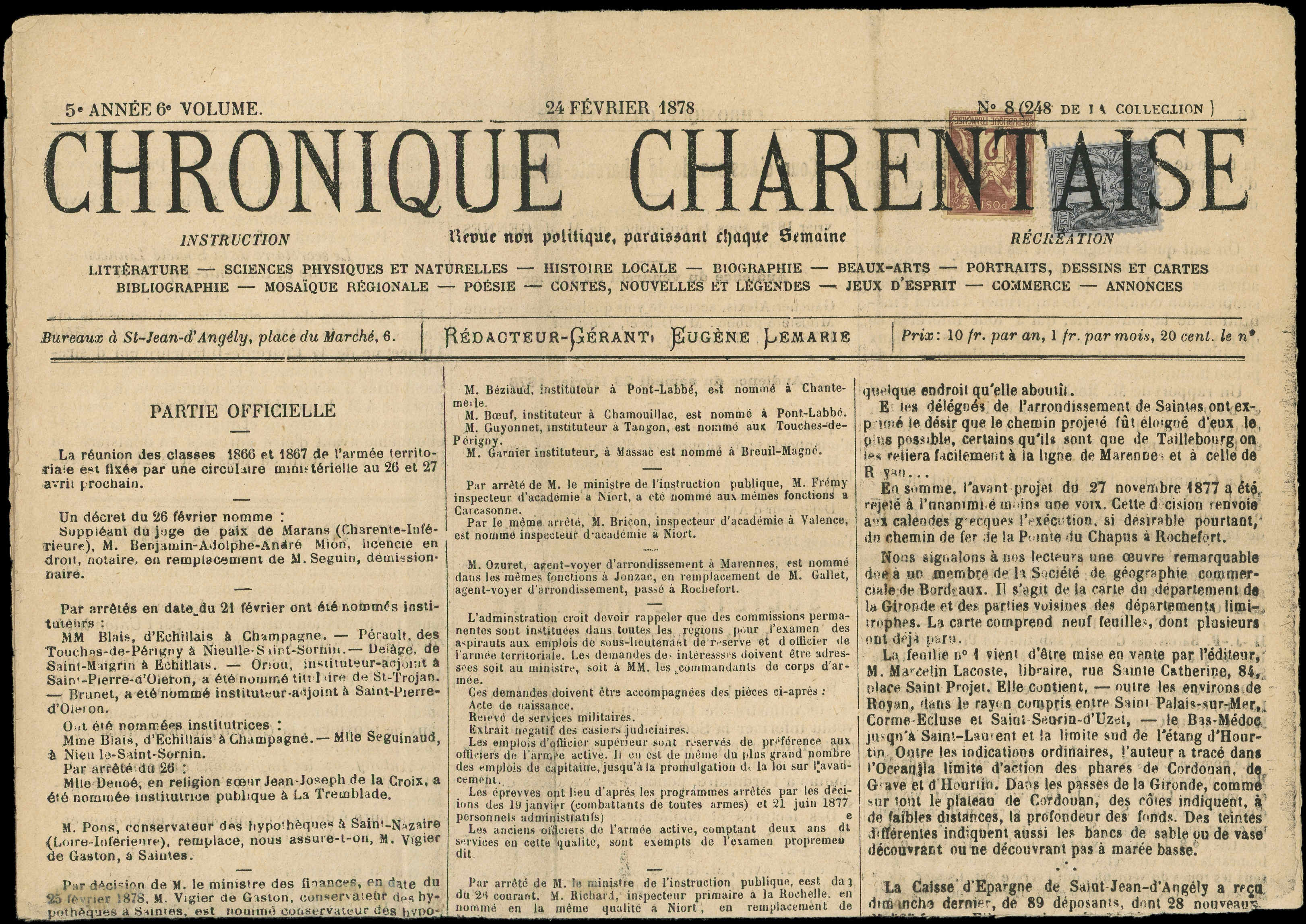 obl. TYPO s. Journal CHRONIQUE CHARENTAISE du 23/12/1877, TB, cote Cérès (Image)