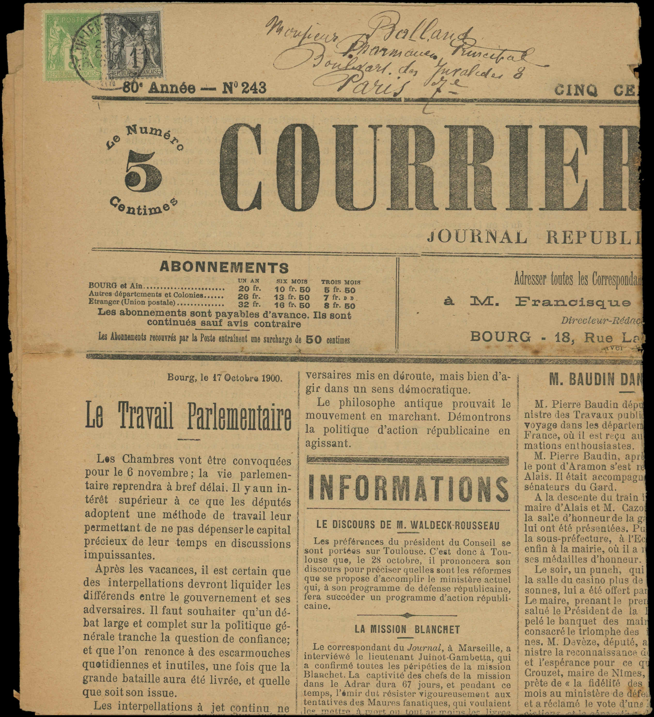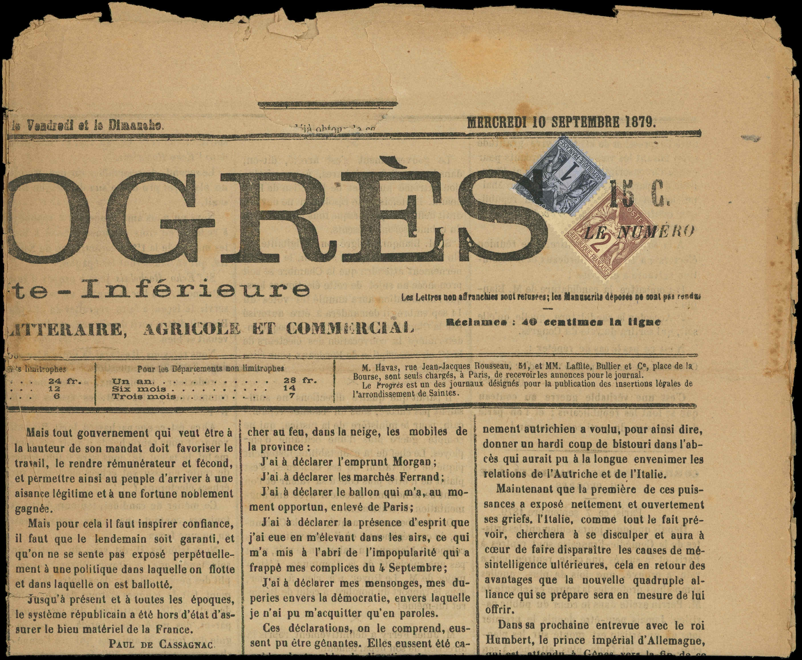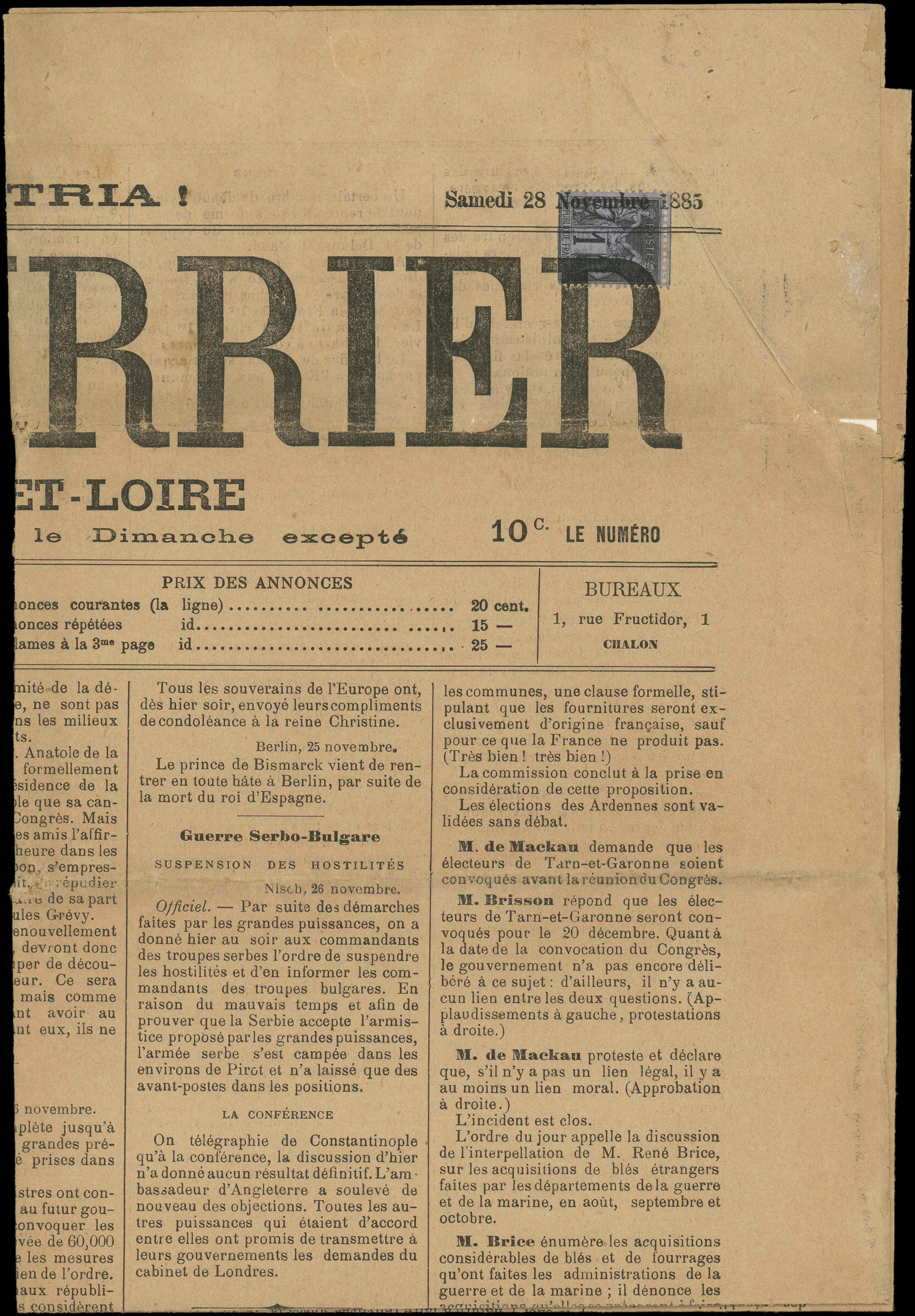 85 obl. TYPO sur "LE PROGRES" de la Charente Inférieure du 10/9/79, B/TB (Image)