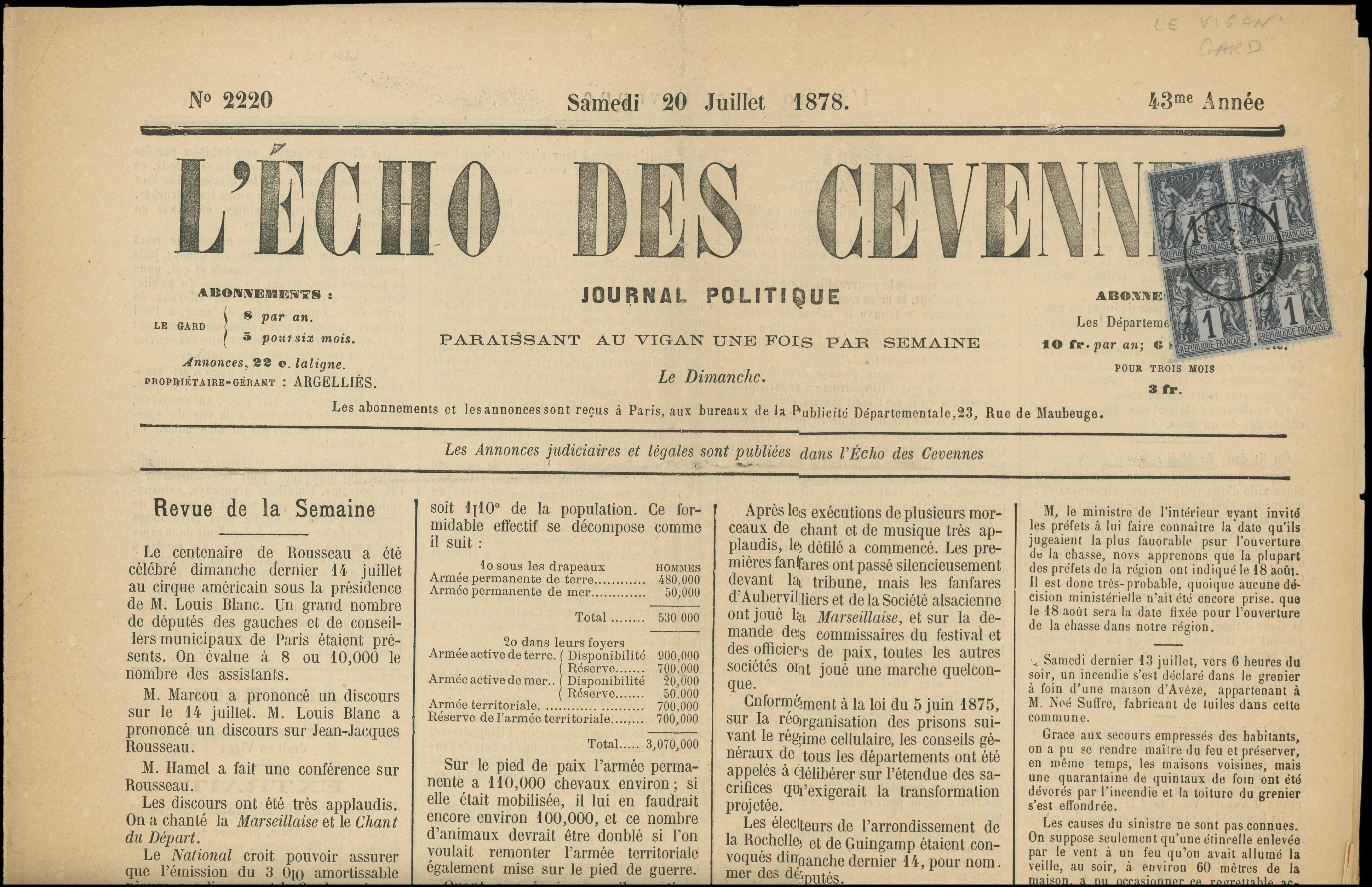 obl. càd LE VIGAN s. L'ECHO DES CEVENNES du 20/7/1878, TB (Image)