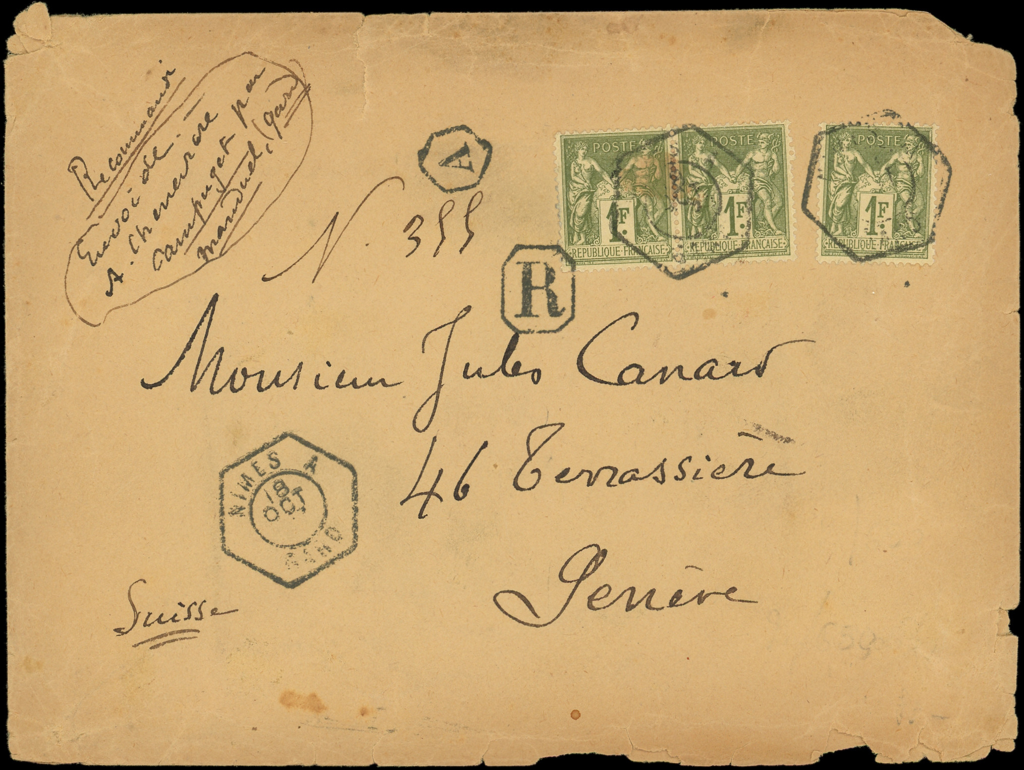 ex. obl. càd Hexag. de recette auxiliaire NIMES A 18/10/87 s. Env. Rec. pour la SUISSE, TB (Image) (Image2)