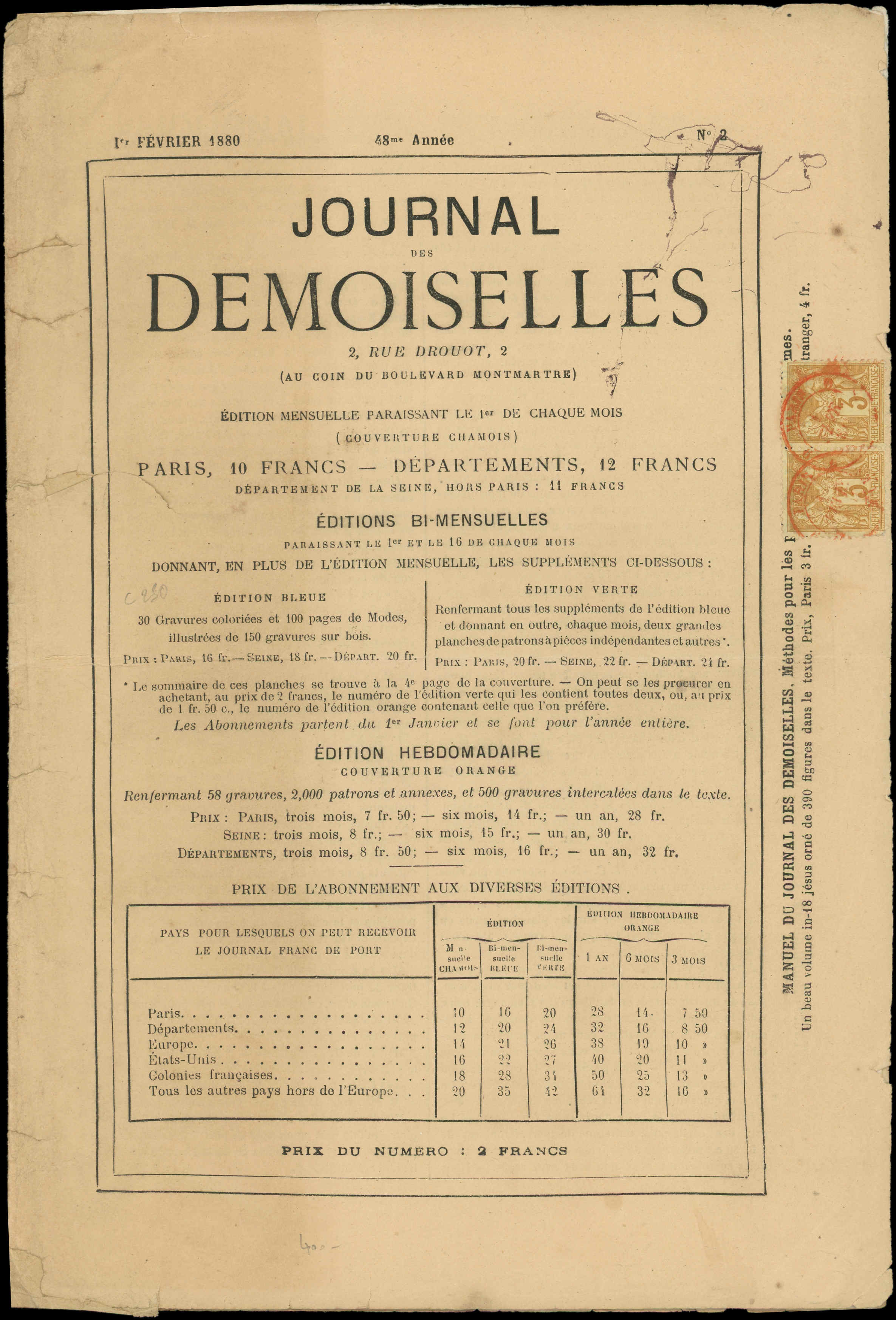 càd ROUGE PARIS 1/2/80, à ne pas confondre avec le cachet rouge des Imprimés, sur "JOURNAL des DEMOISELLES" entier, RR, TB (Image)