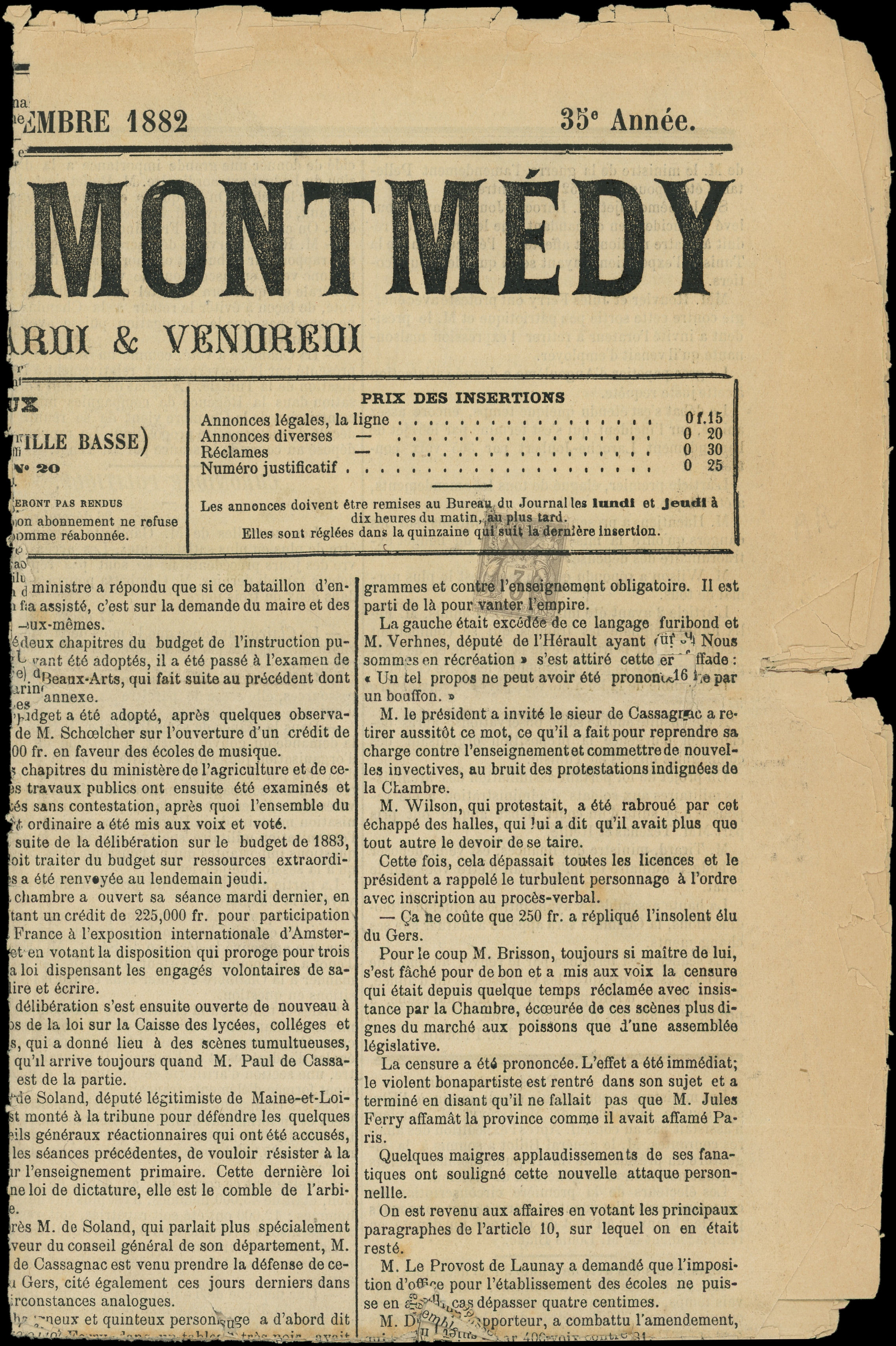 sur Journal MONTMEDY du 29/12/1882 avec défaut, B/TB, cote Cérès (Image)