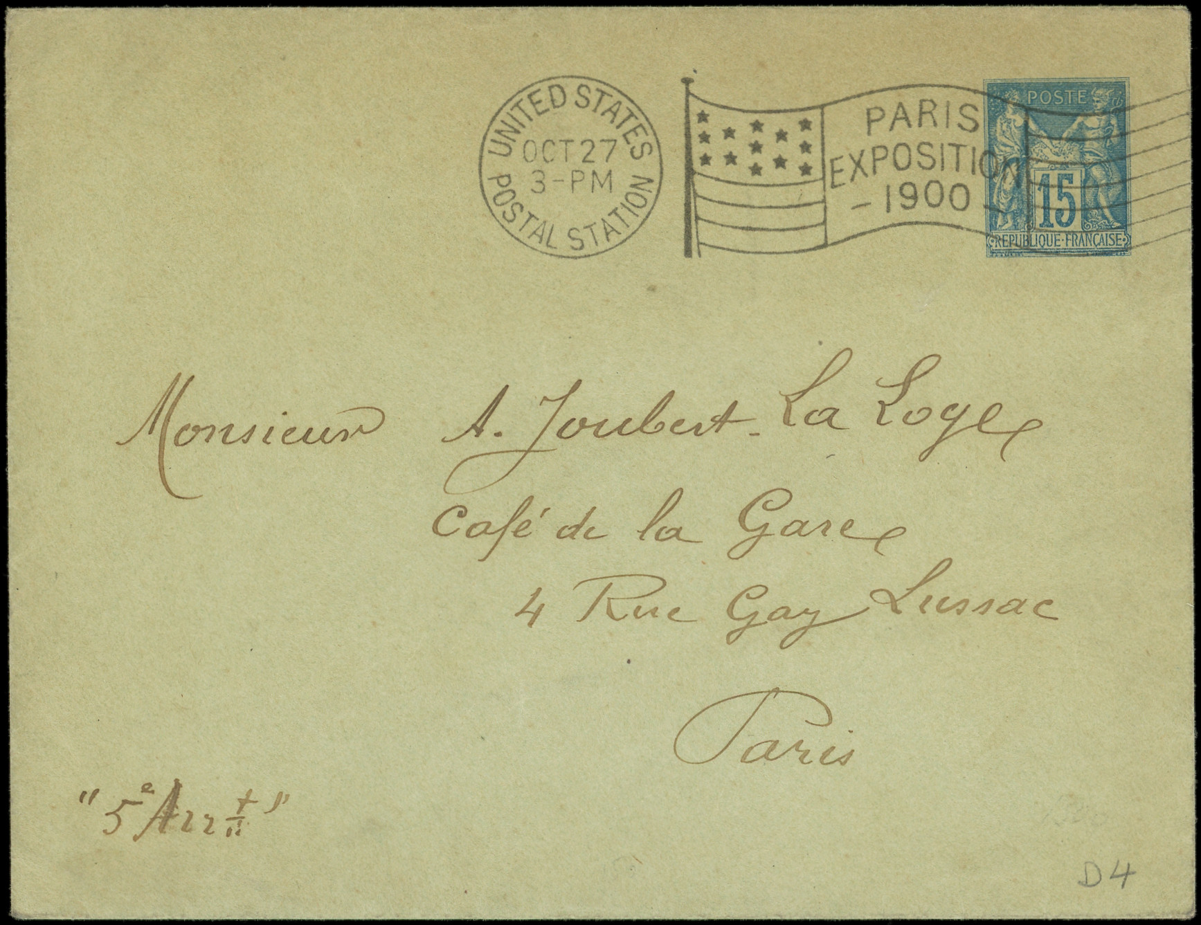bleu N°D4 obl. cachet Drapeau PARIS EXPOSITION 1900 UNITED STATES POSTAL STATION 27/10, TTB (Image)