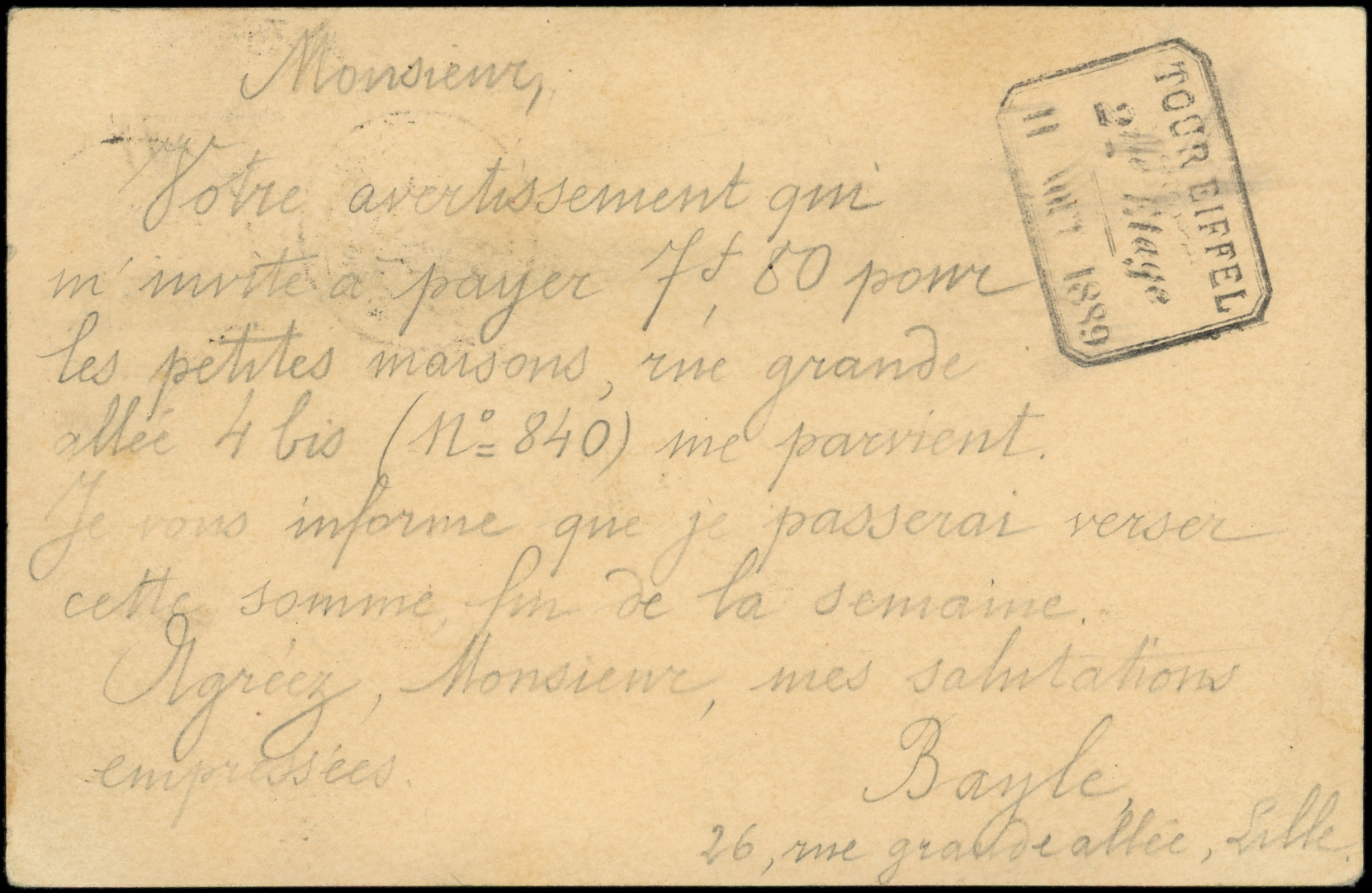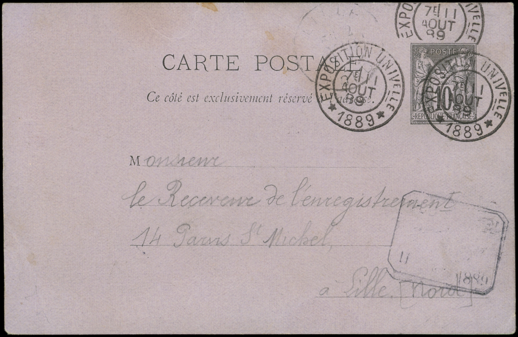 sur lilas, CP Entier obl. EXPOSITION UNIVelle 1889 11/8/89, TB (Image) (Image2)