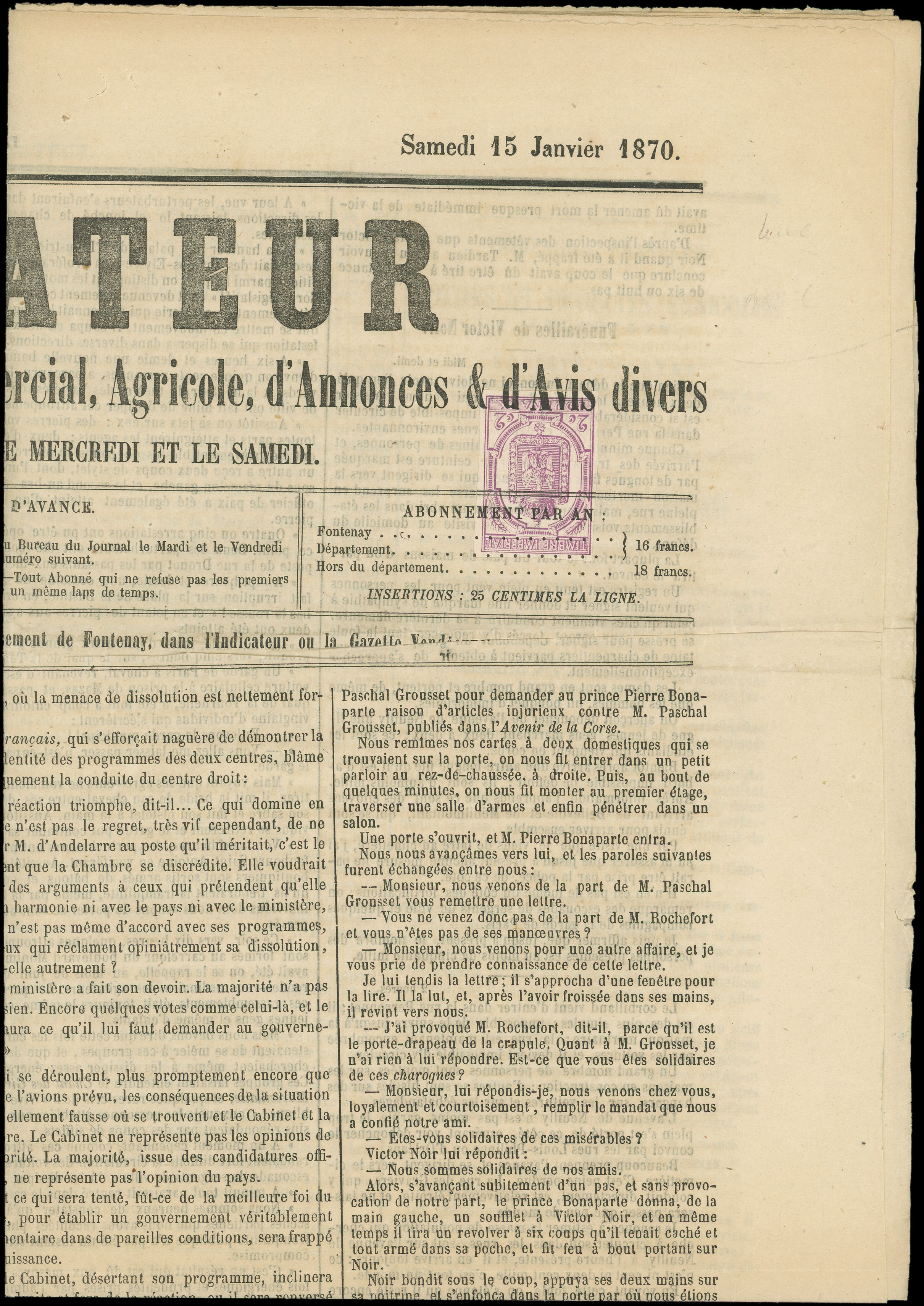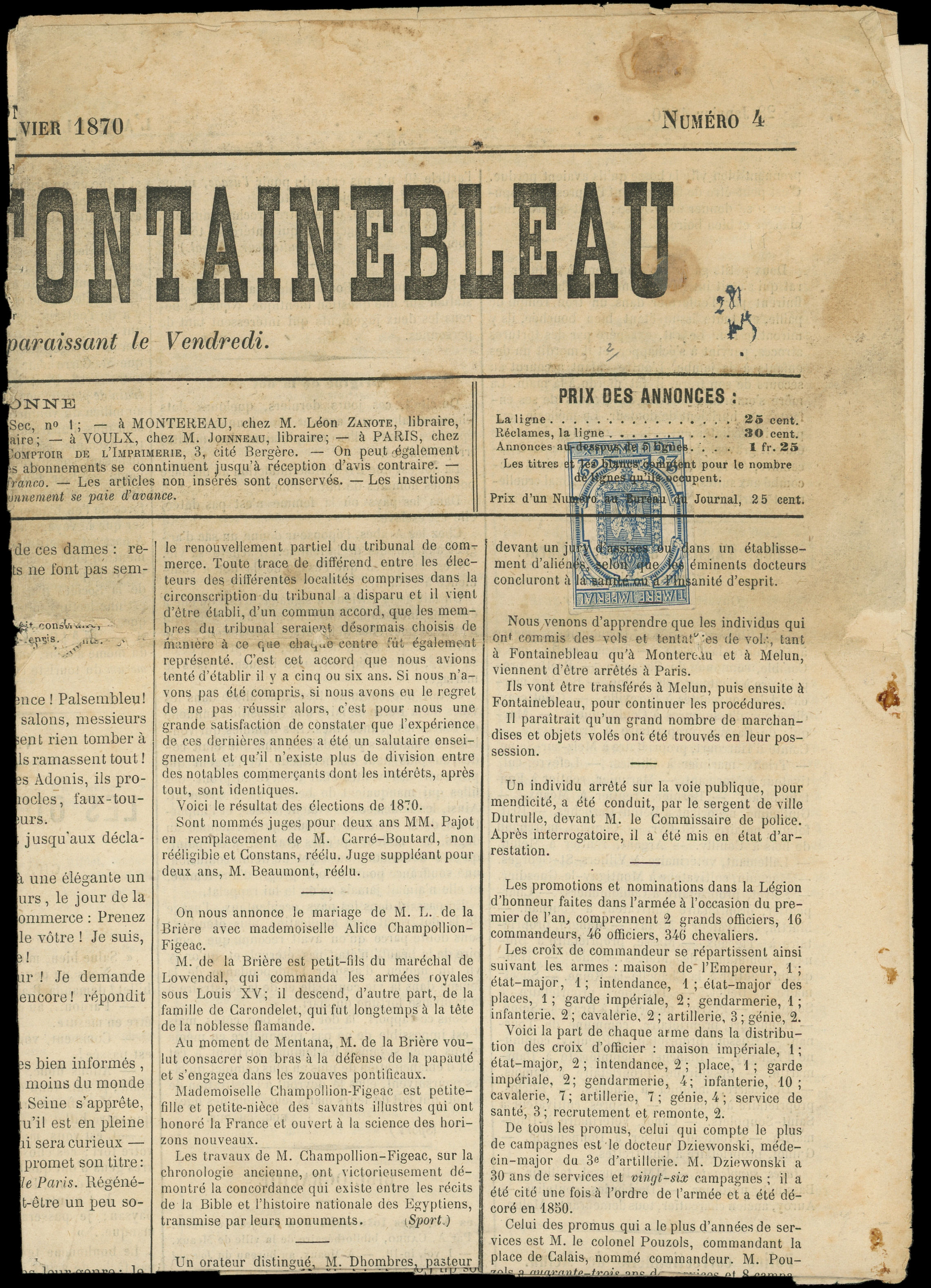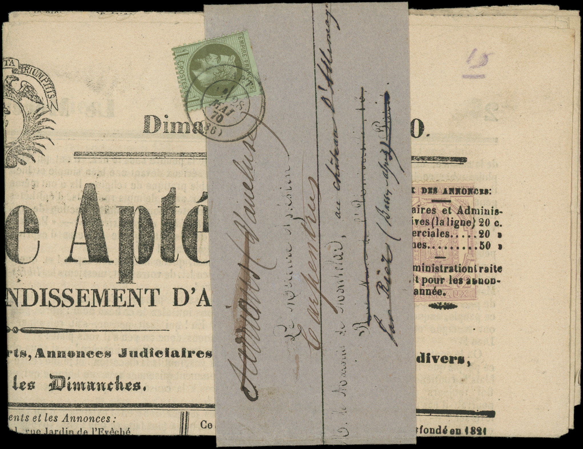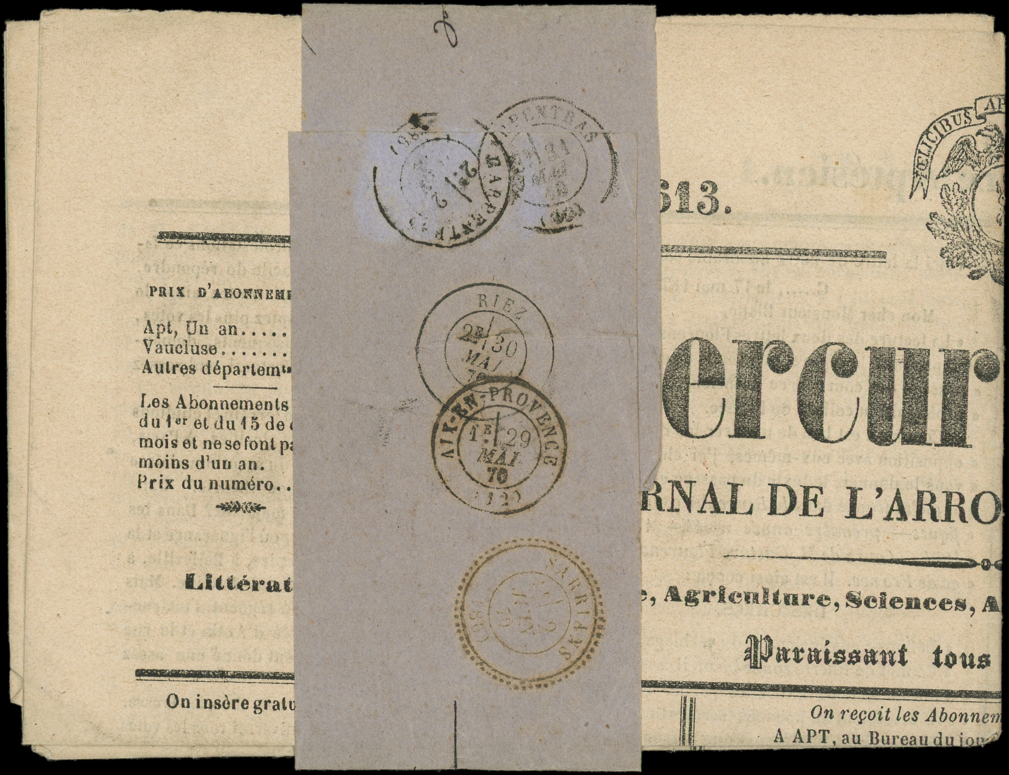 obl. TYPO sur LE MERCURE APTESIEN du 29/5/70 avec bande affie N°25 1c. bronze obl. càd T17 APT 28/5, combinaison possible de Mai 1870 au 5/9/70, RR, TB (Image) (Image2)