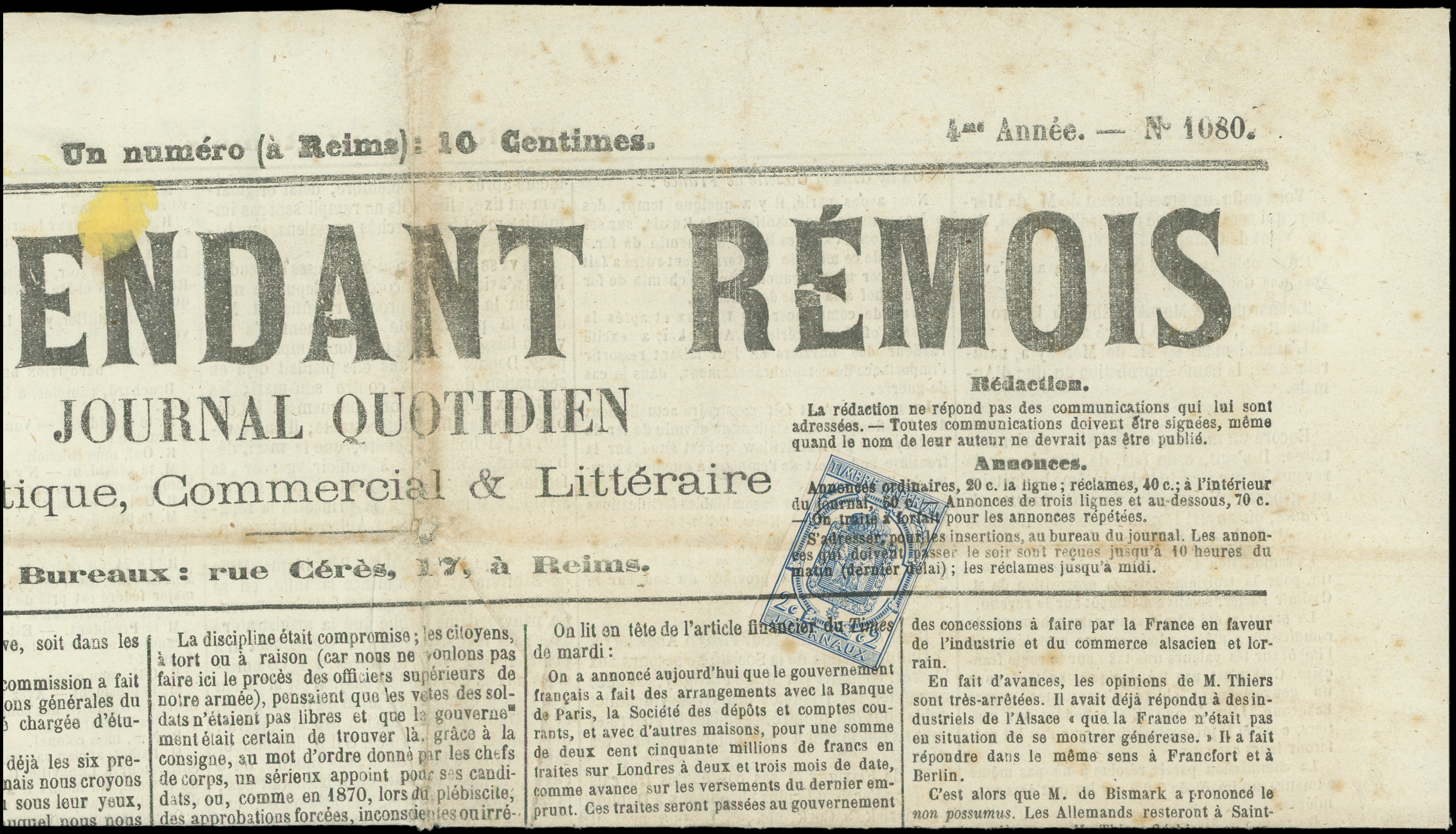 obl. TYPO s. Journal "L'INDEPENDANT REMOIS" du 25/8/71, usage très tardif, RR, TTB (Image)