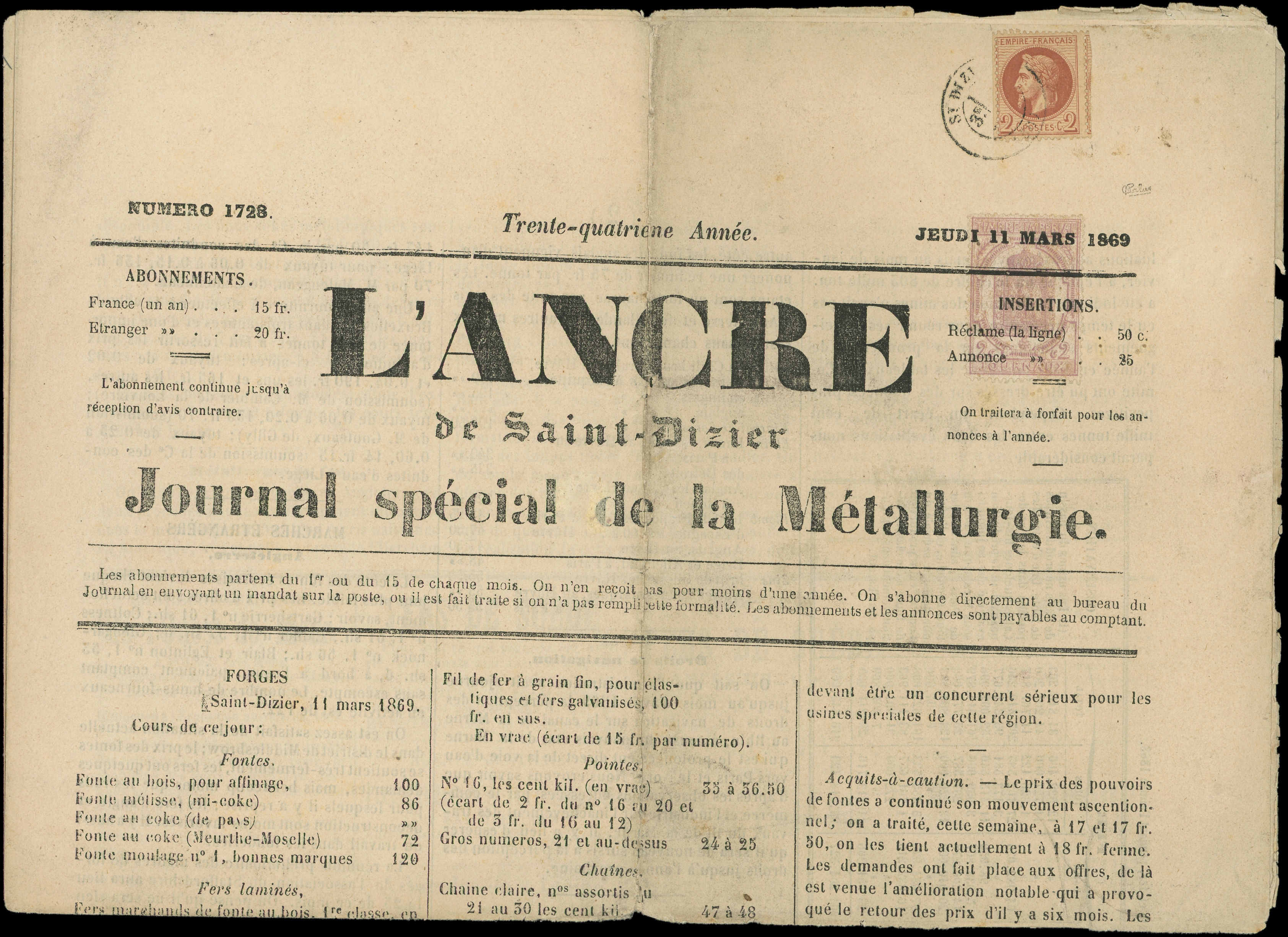obl. TYPO sur L'ANCRE du 11/3/69 affr. N°26 2c. rouge-brun obl. càd T17 ST DIZIER, TB. C (Image)