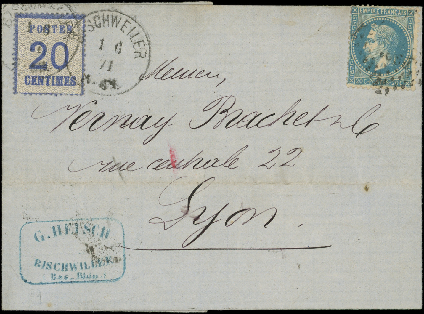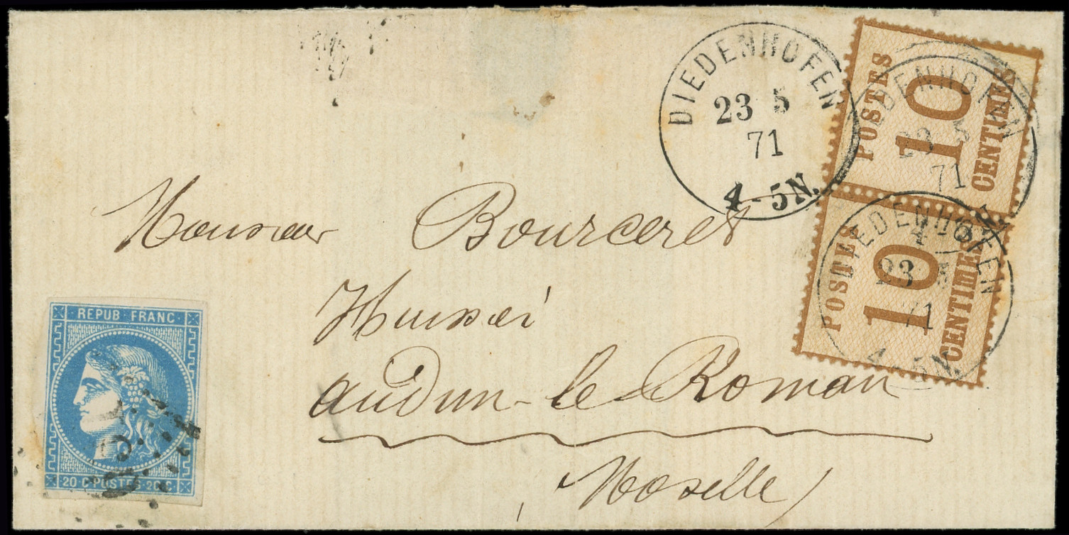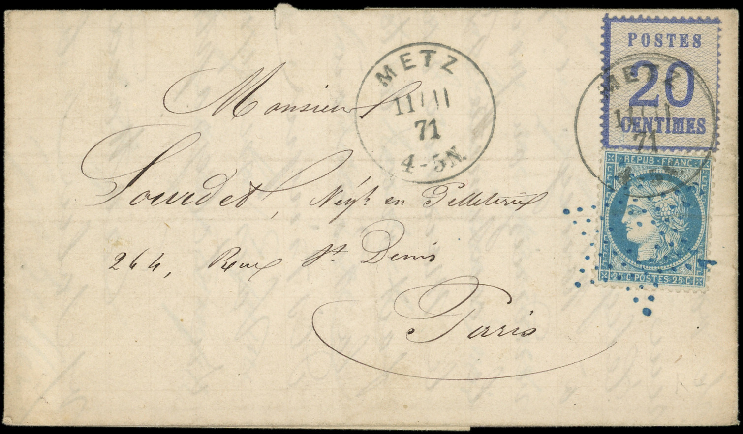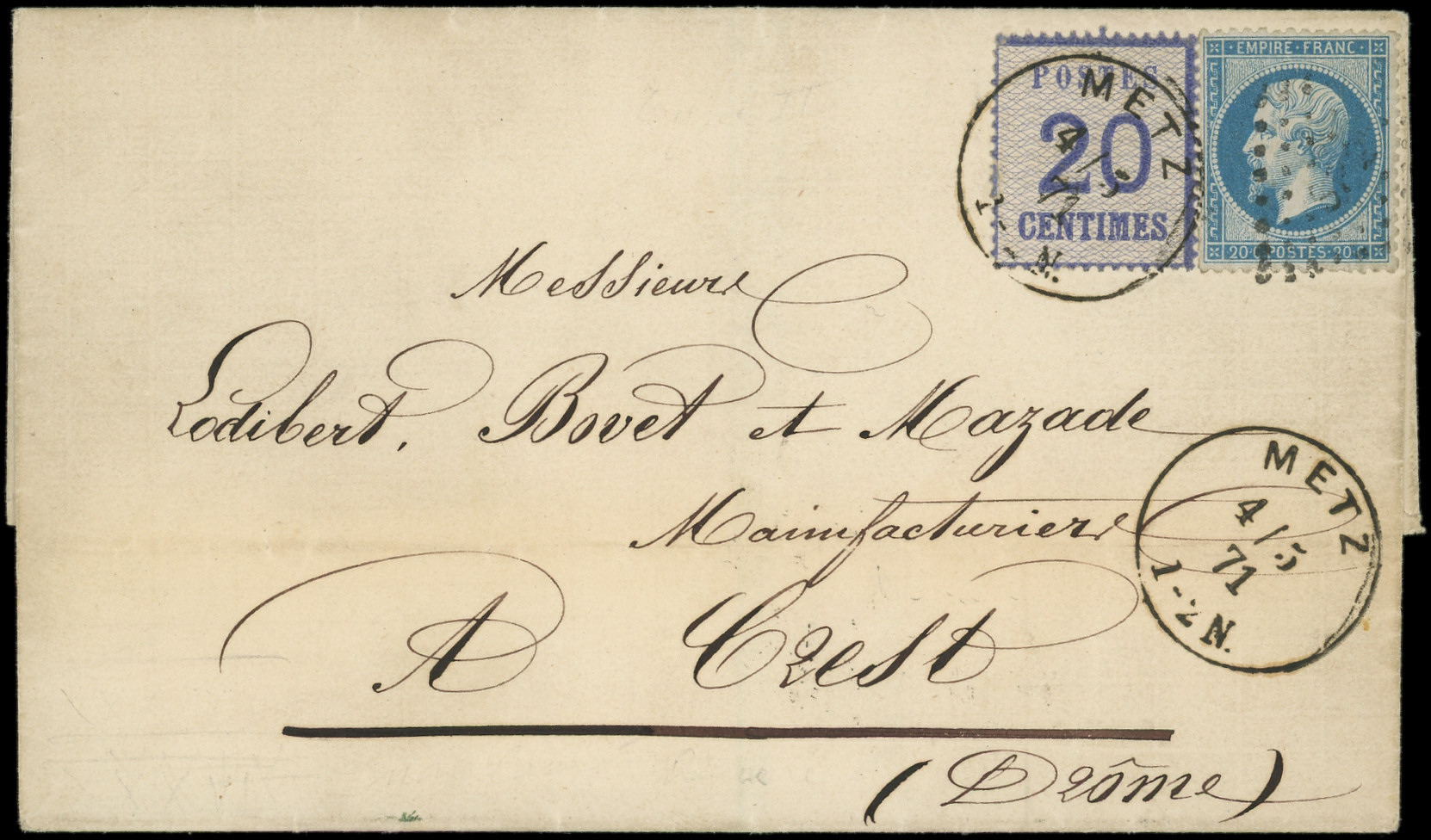 MIXTE avec France N°22 20c. bleu obl. càd Allemand METZ 4/5/71 et PC 1031 sur LSC, arr. CREST 8/5/71, TB (Image) (Image2)