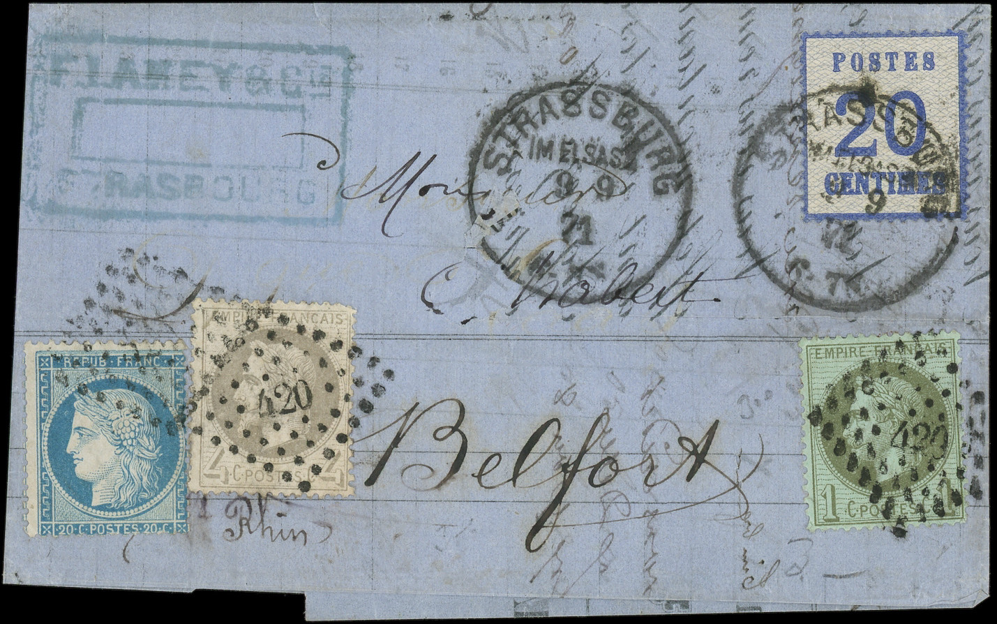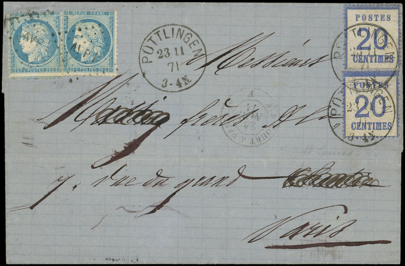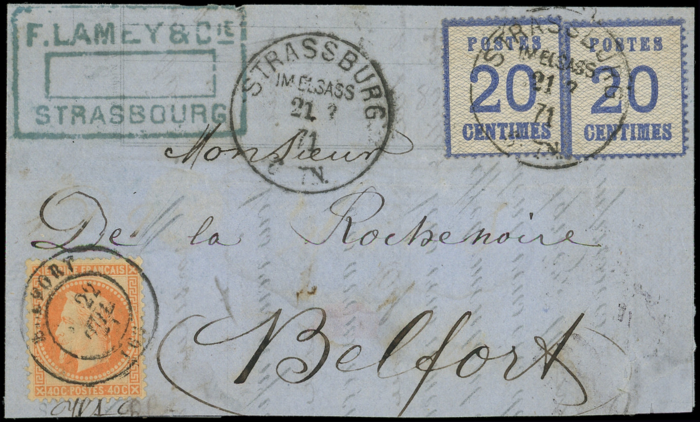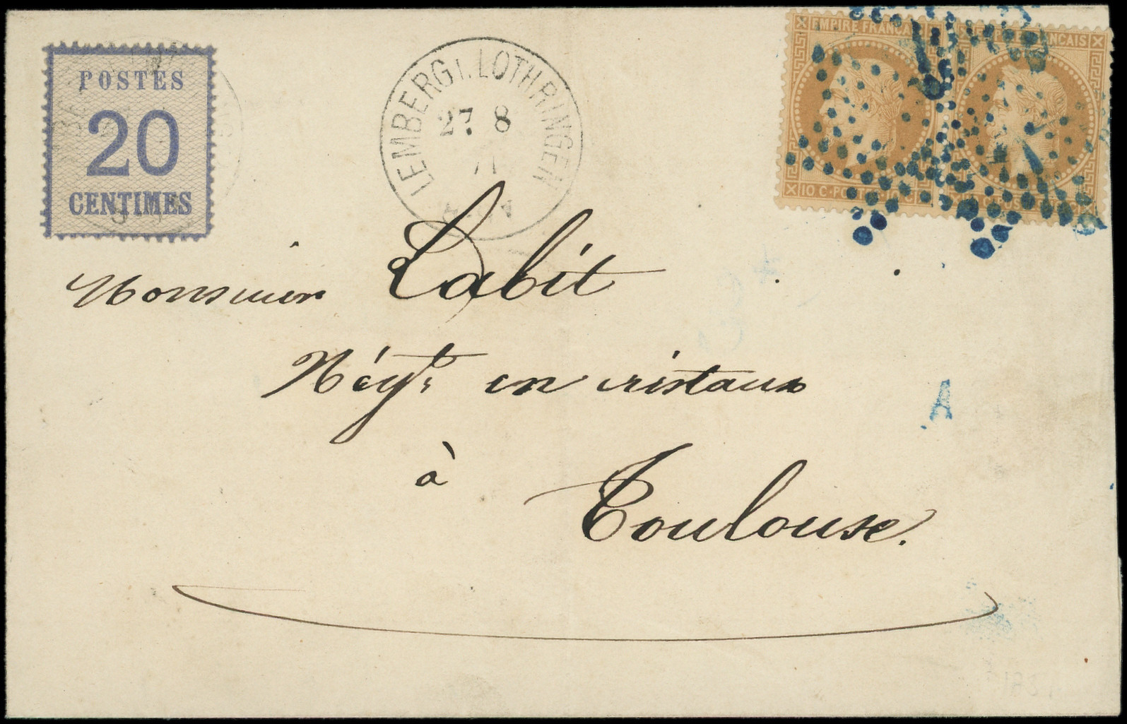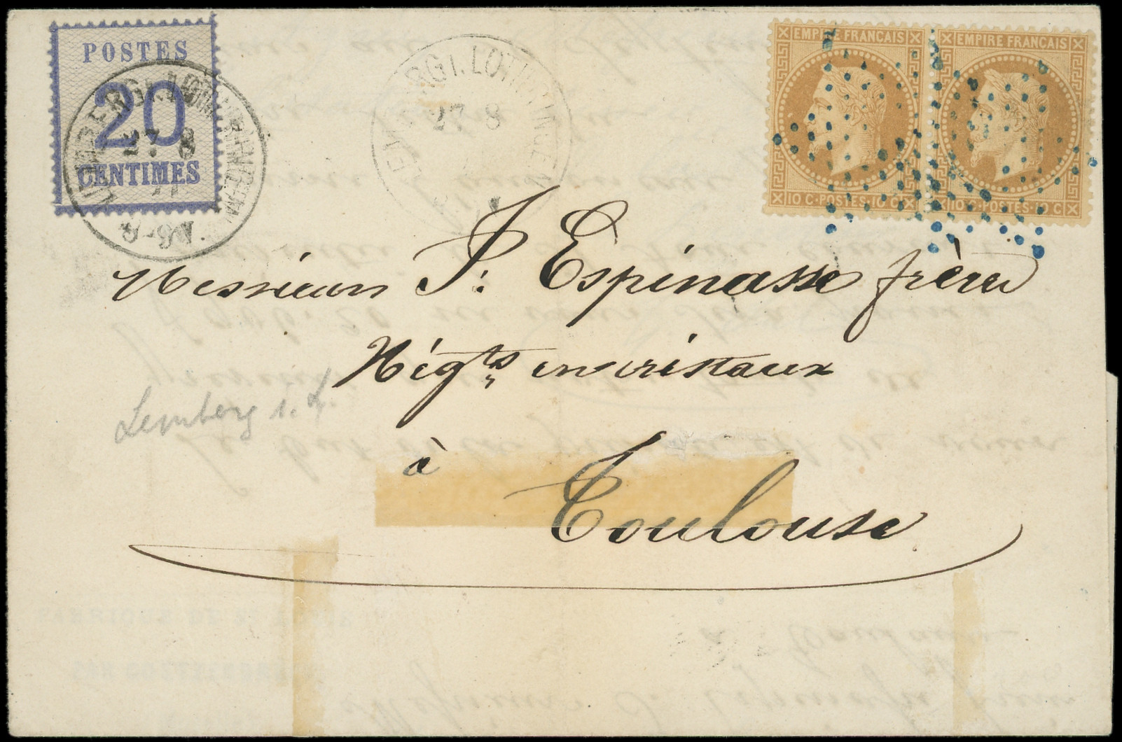 obl. càd LEMBERG-LOTHRINGEN 27/8/71 s. LSC, MIXTE avec France N°28B PAIRE obl. ETOILE BLEUE, passage METZ 27/8, arr. TOULOUSE 29/8, TTB (Image) (Image2)