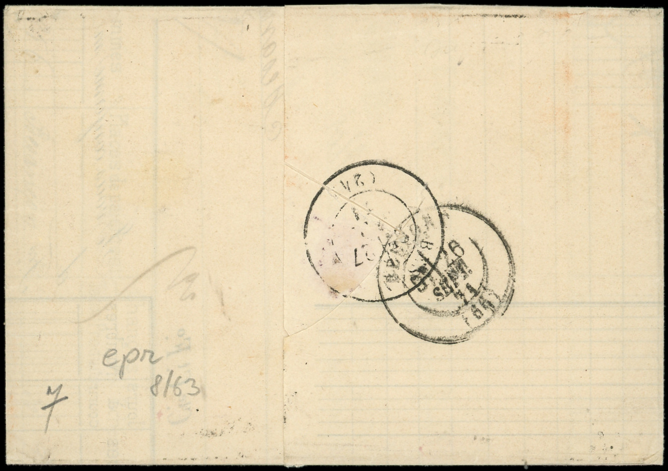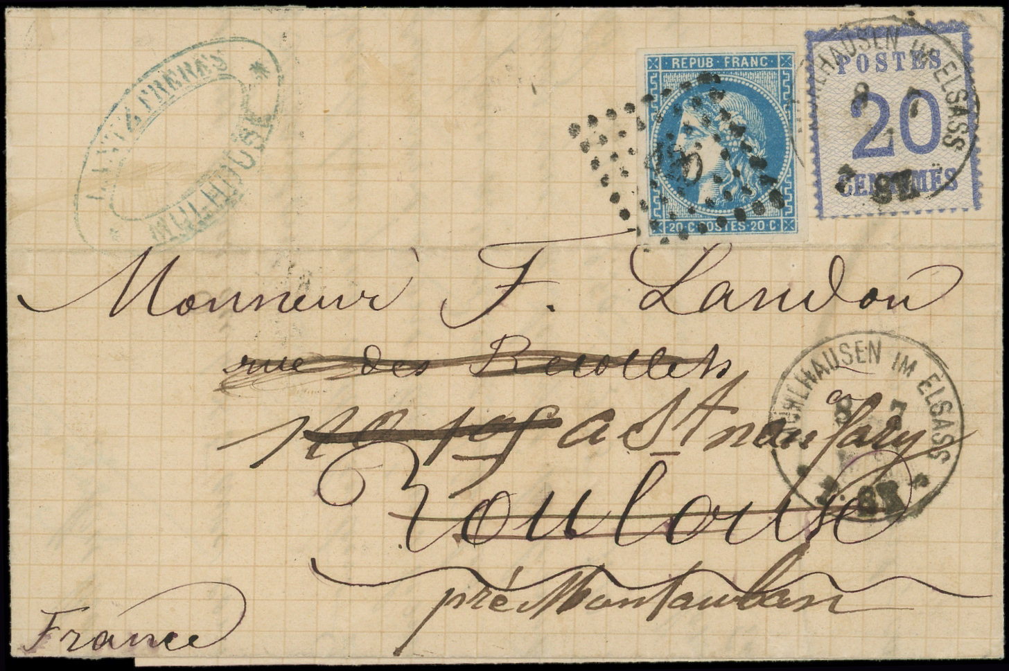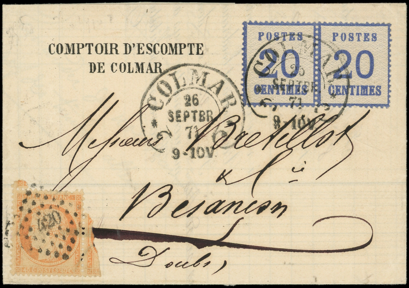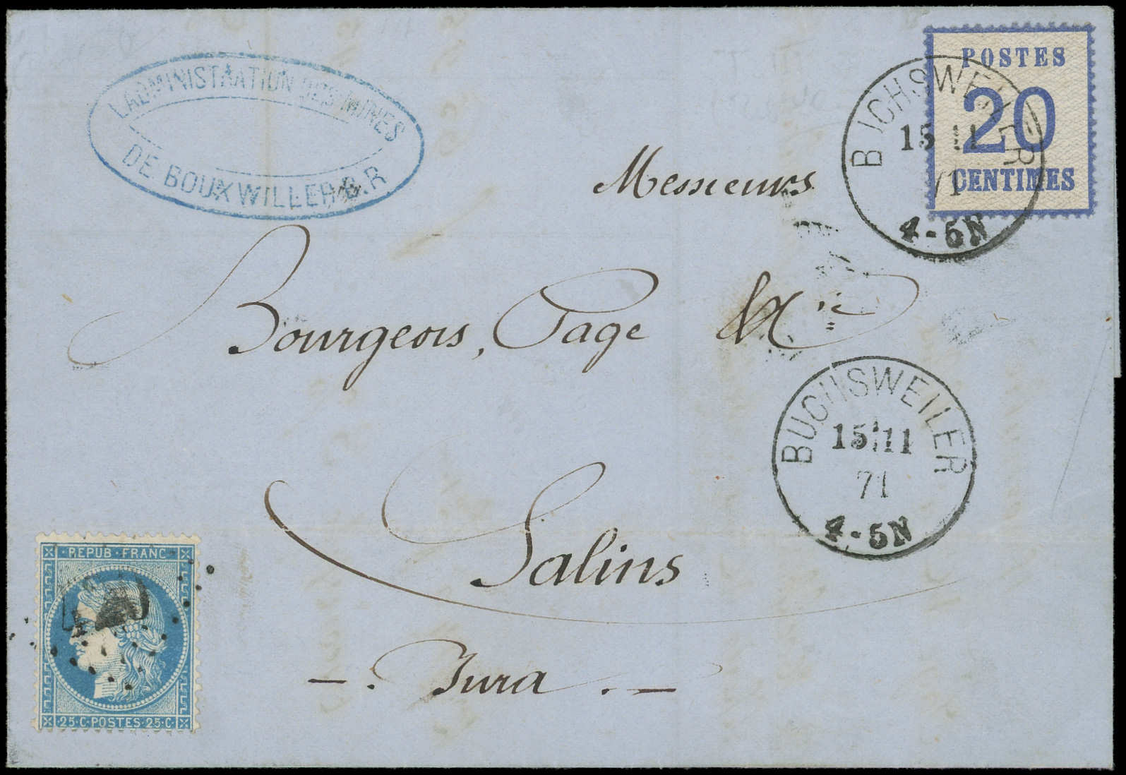 obl. càd LEMBERG-LOTHRINGEN 27/8/71 s. LSC, MIXTE avec France N°28B PAIRE obl. ETOILE BLEUE, passage METZ 27/8, arr. TOULOUSE 29/8, TTB (Image) (Image2)