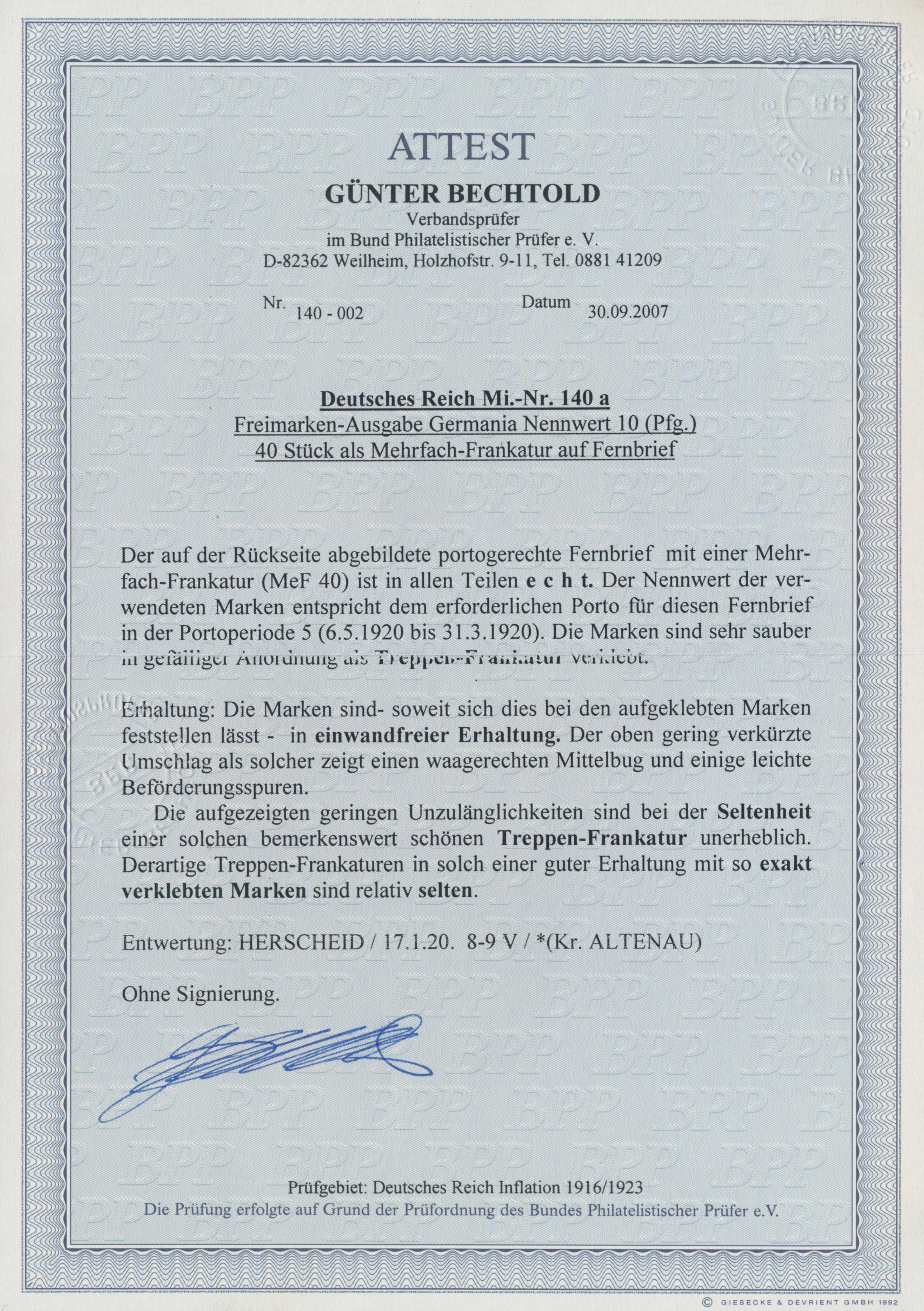 1920, Germania, 5 Pfg., seltene Mehrfachfrankatur von vierzig Exemplaren, treppenförmig geklebt auf tarifgerechten Fernbrief, Umschlag oben gering