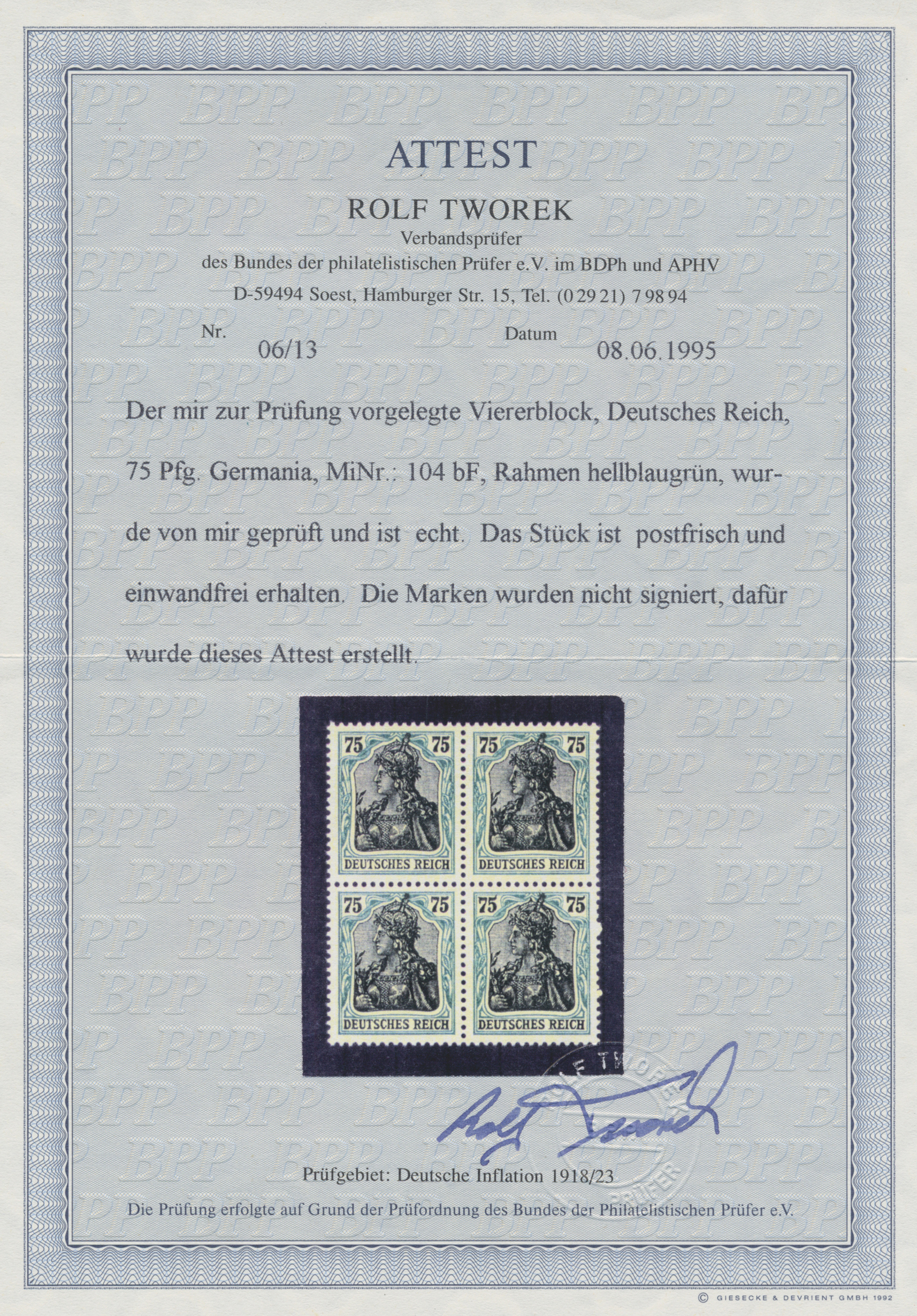 1918, Germania, 75 Pfg., postfrischer Viererblock, Foto-Attest Tworek BPP (1995), Mi 1600,-