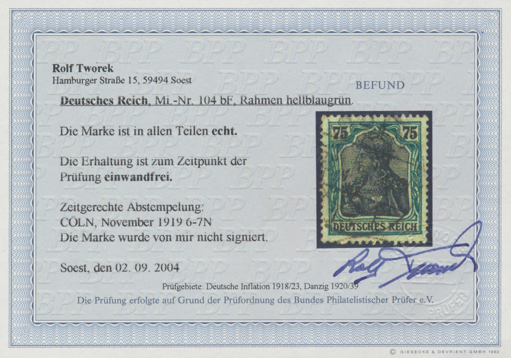 1918, Germania, 75 Pfg., sauber gestempelt, Foto-Befund Tworek BPP (2004), Mi 450,-