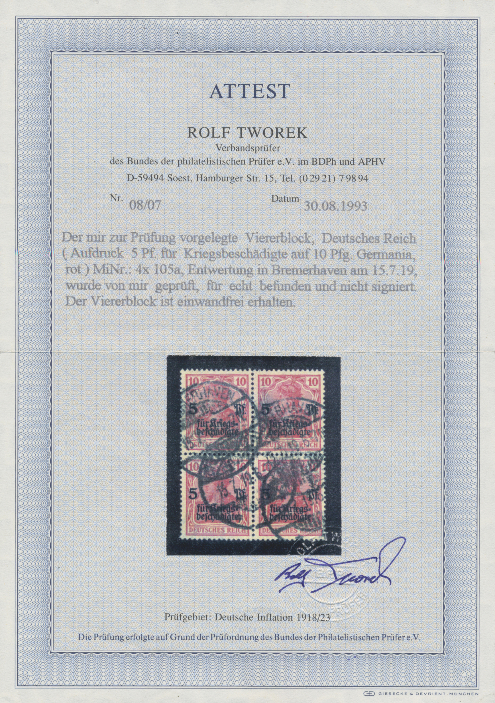 1919, Kriegsbeschädigtenhilfe, 10 Pfg. karminrot, sauber gestempelter Viererblock, Foto-Attest Tworek BPP (1993), Mi 600,- +