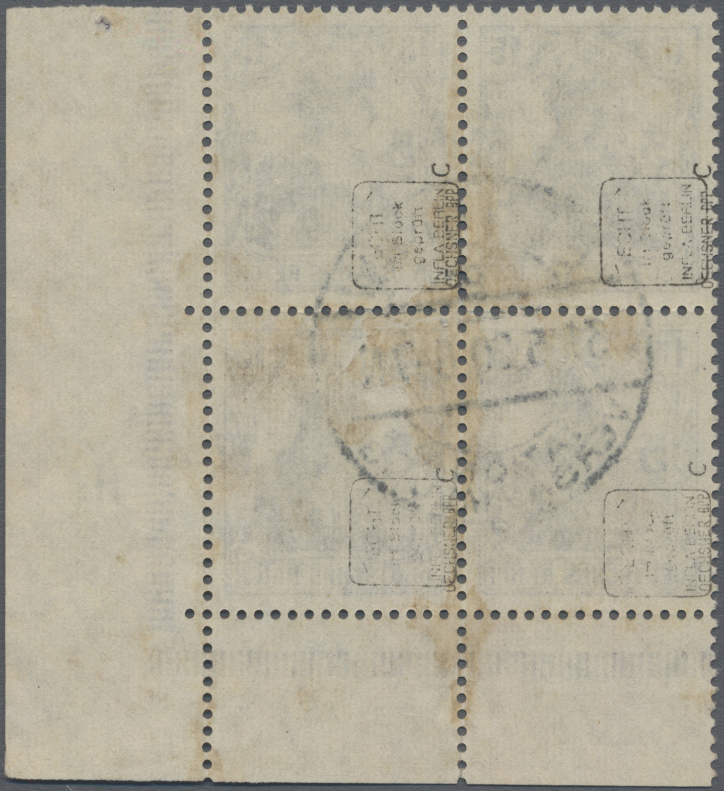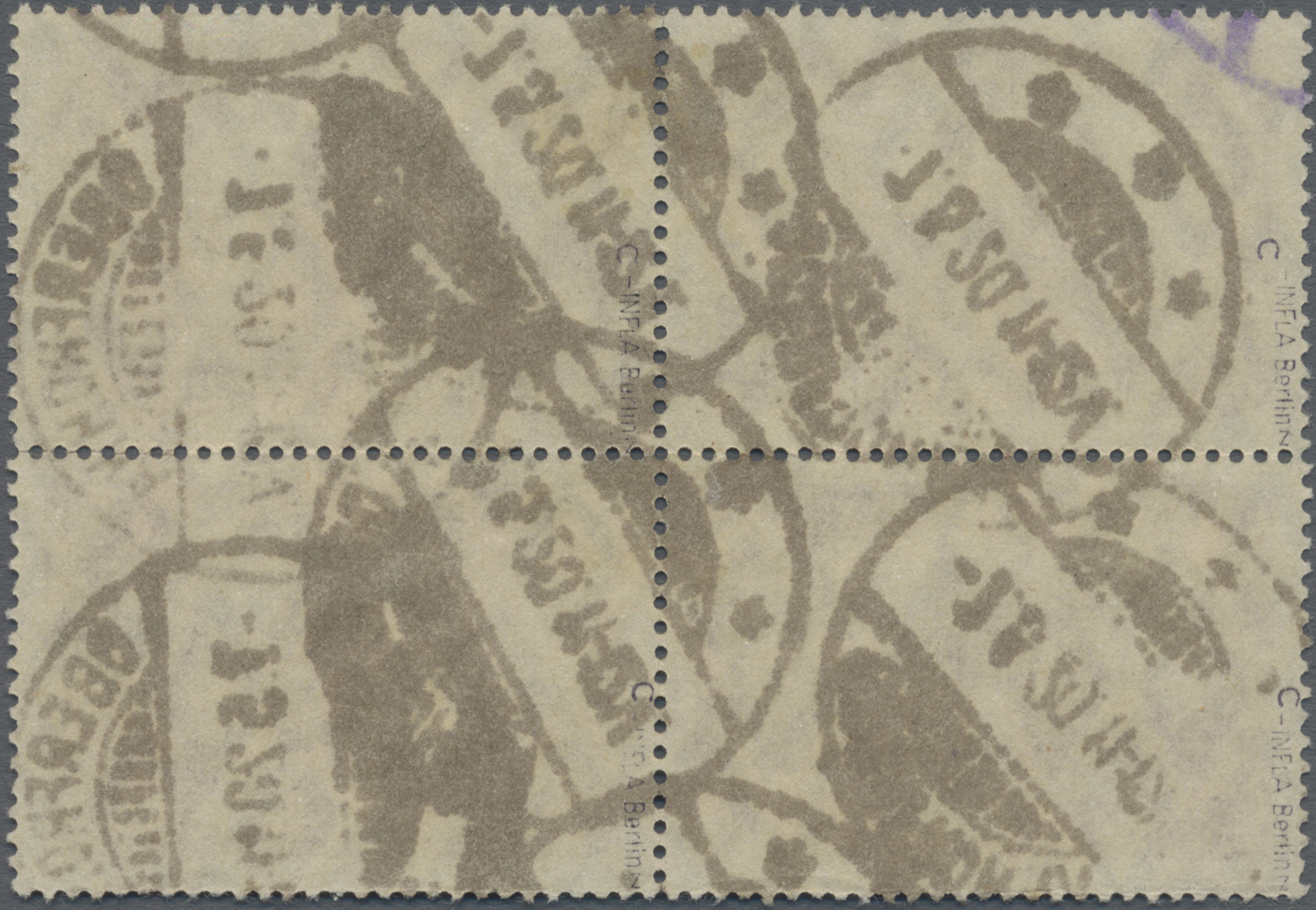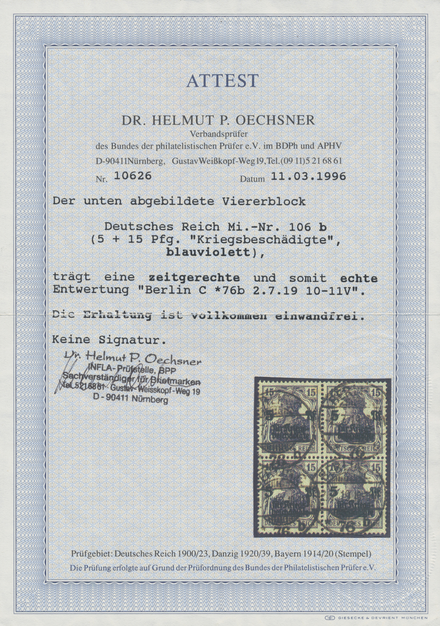 1919, Kriegsbeschädigtenhilfe, 15 Pfg. schwarzviolett, rechter unterer Eckrand-Viererblock, sauberer zentrischer Stempel, gepr. Dr. Oechsner BPP, Infla,