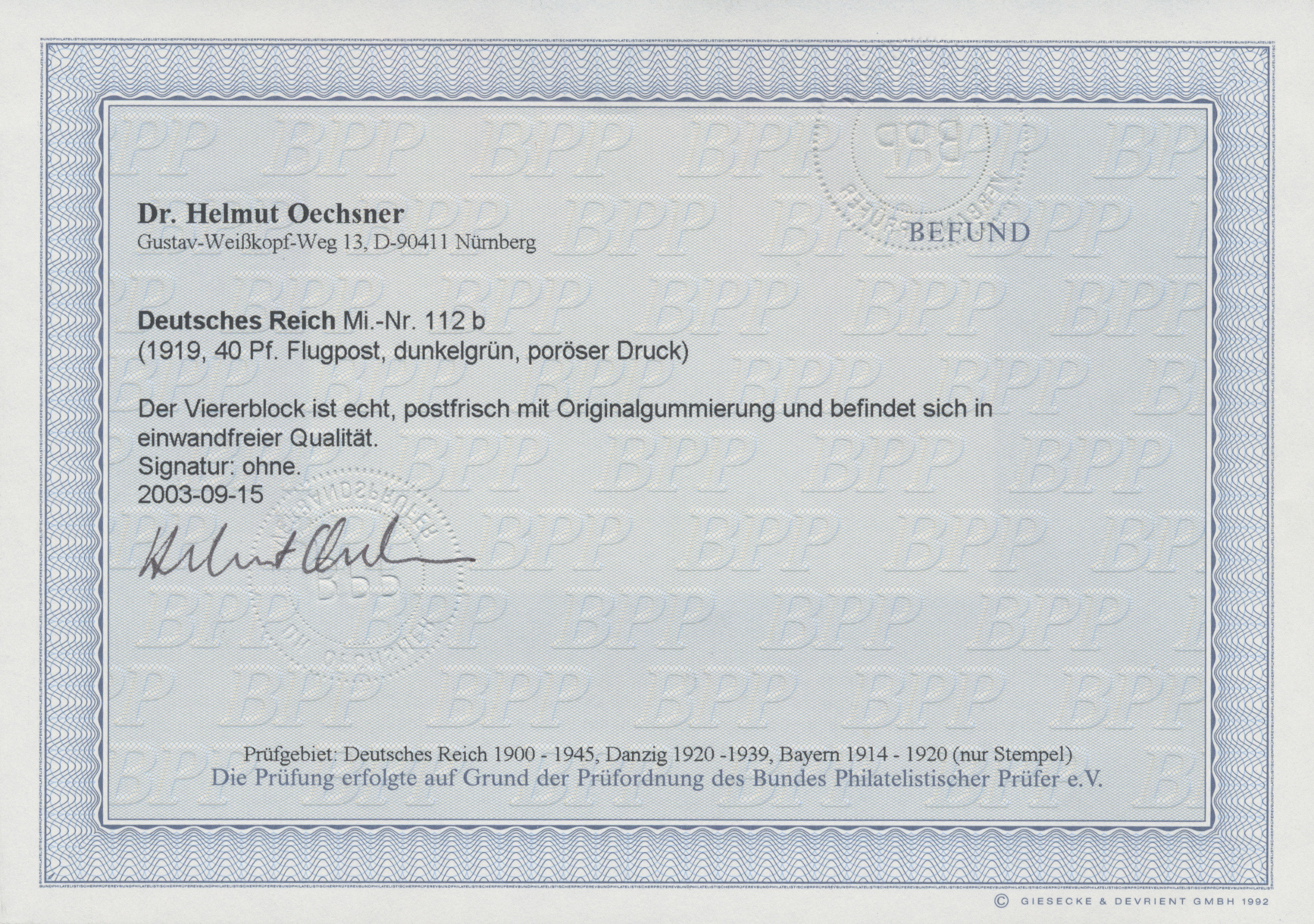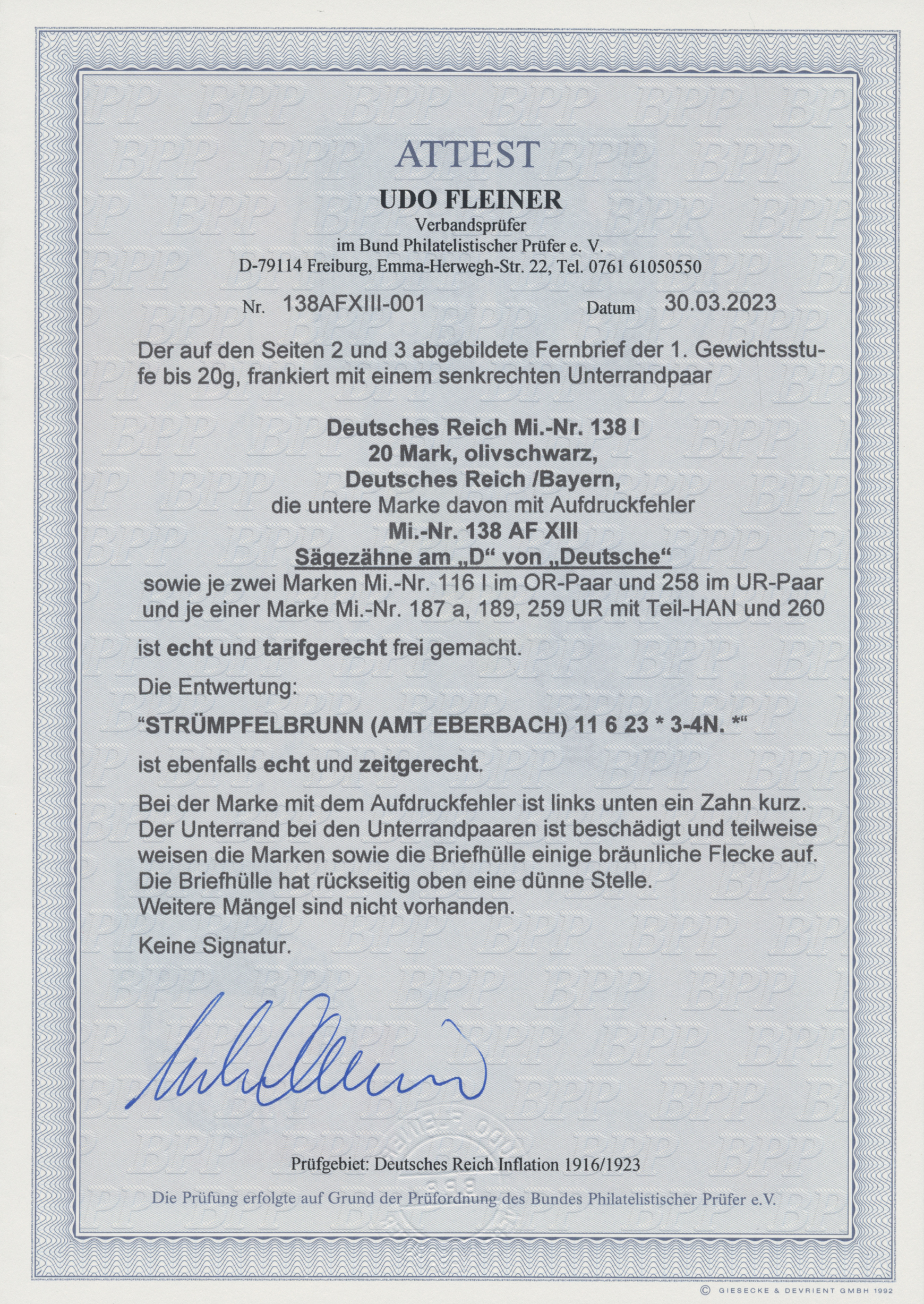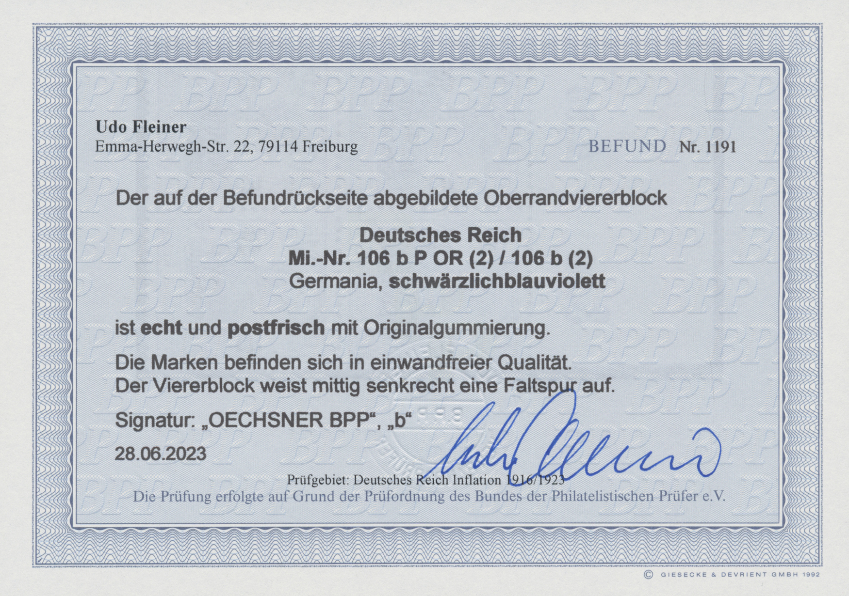 Foto-Attesten Oechsner, BPP(2010) und Fleiner, BPP(2021). (Mi. 450,- €)