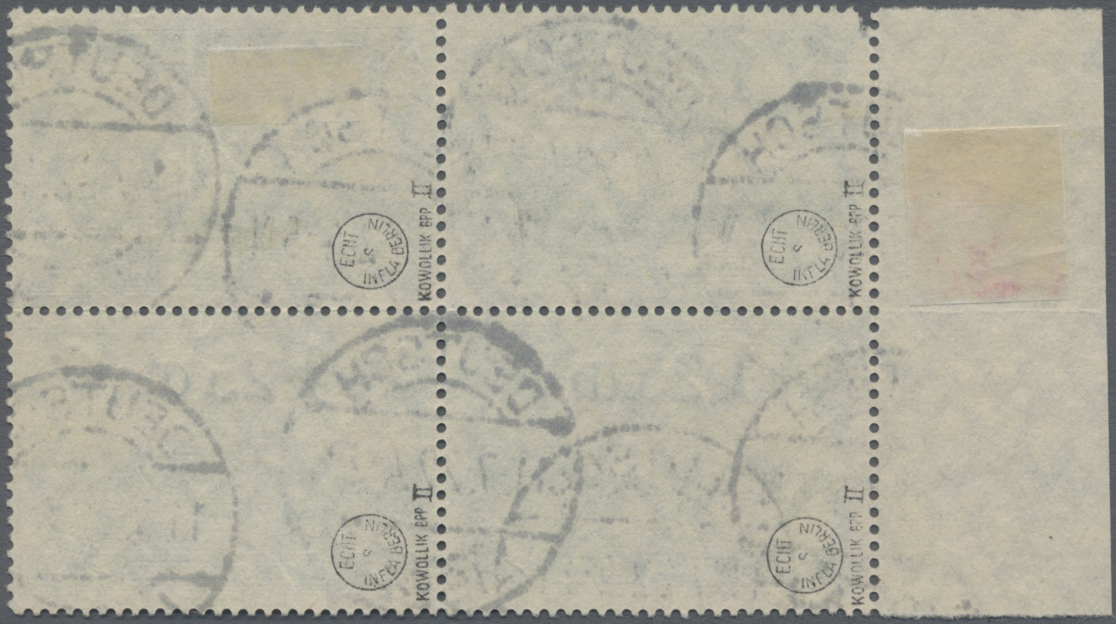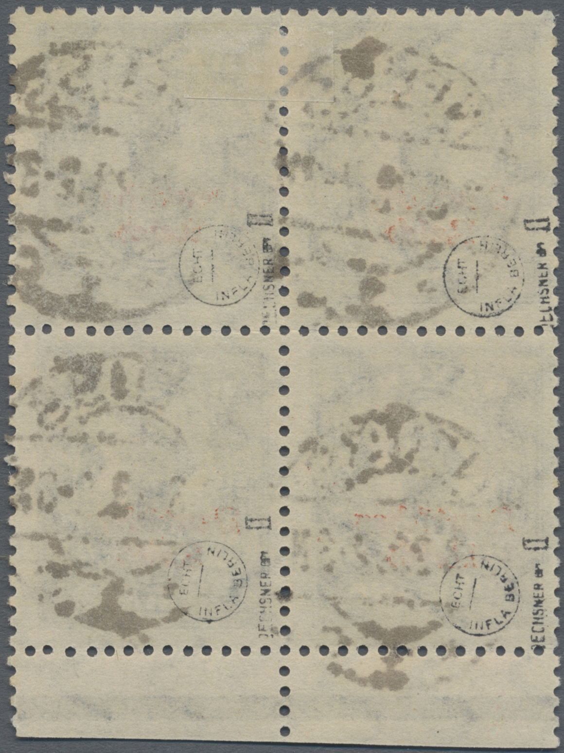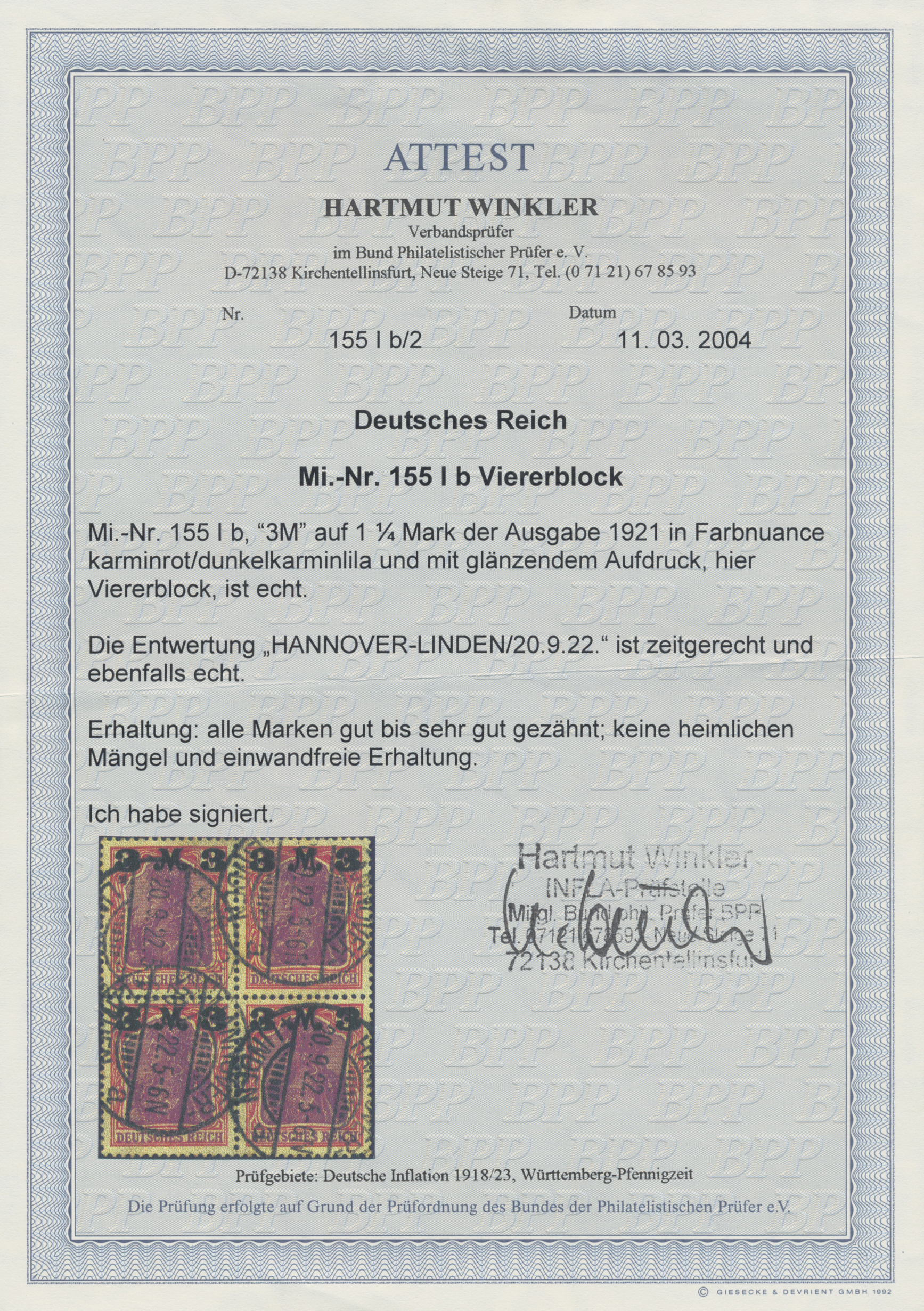 1921, Aufdruck-Ausgabe, 3 Mark karminrot/dunkelkarminlila, Type I, schön gestempelter Viererblock, tadellos, Foto-Attest Winkler BPP (2004), Mi 1120,-