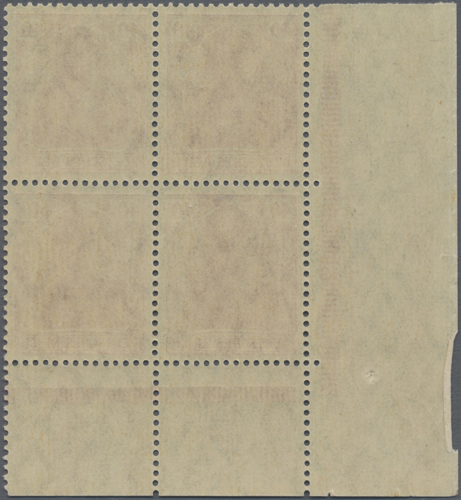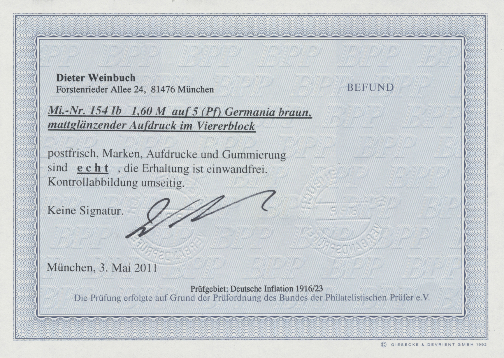 1921, Aufdruck-Ausgabe, 1.60 Mark dunkelbraun, Type I, postfrischer Viererblock, Foto-Befund Weinbuch BPP (2011), Mi 920,-