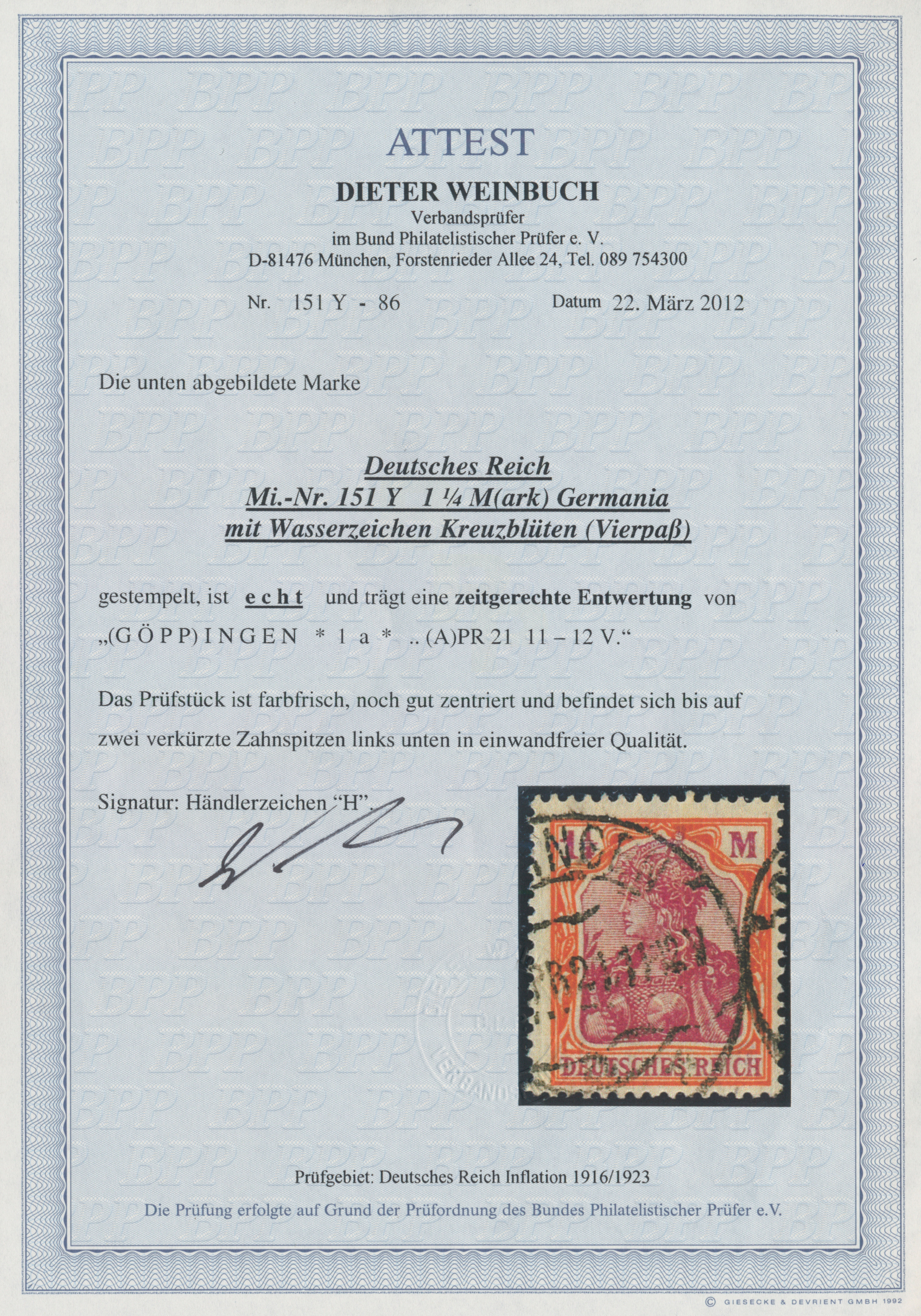 1920, Germania, 1 1/4 Mark mit "Vierpass-Wasserzeichen", sauber gestempelt, zwei stumpfe Zahnspitzen, Foto-Attest Weinbuch BPP (2012), Mi 1000,-