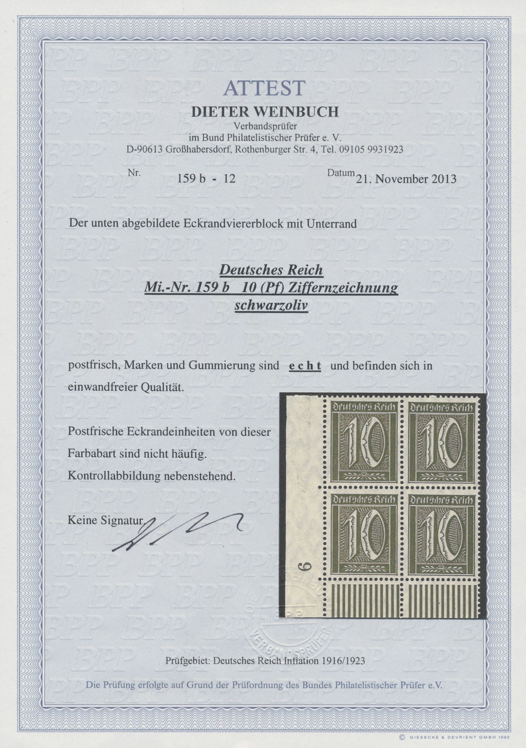 1921, Freimarken, 10 Pfg. schwarzoliv, postfrischer linker unterer Eckrand-Viererblock mit Plattennummer 9, Foto-Attest Weinbuch BPP (2013), Mi 800,-