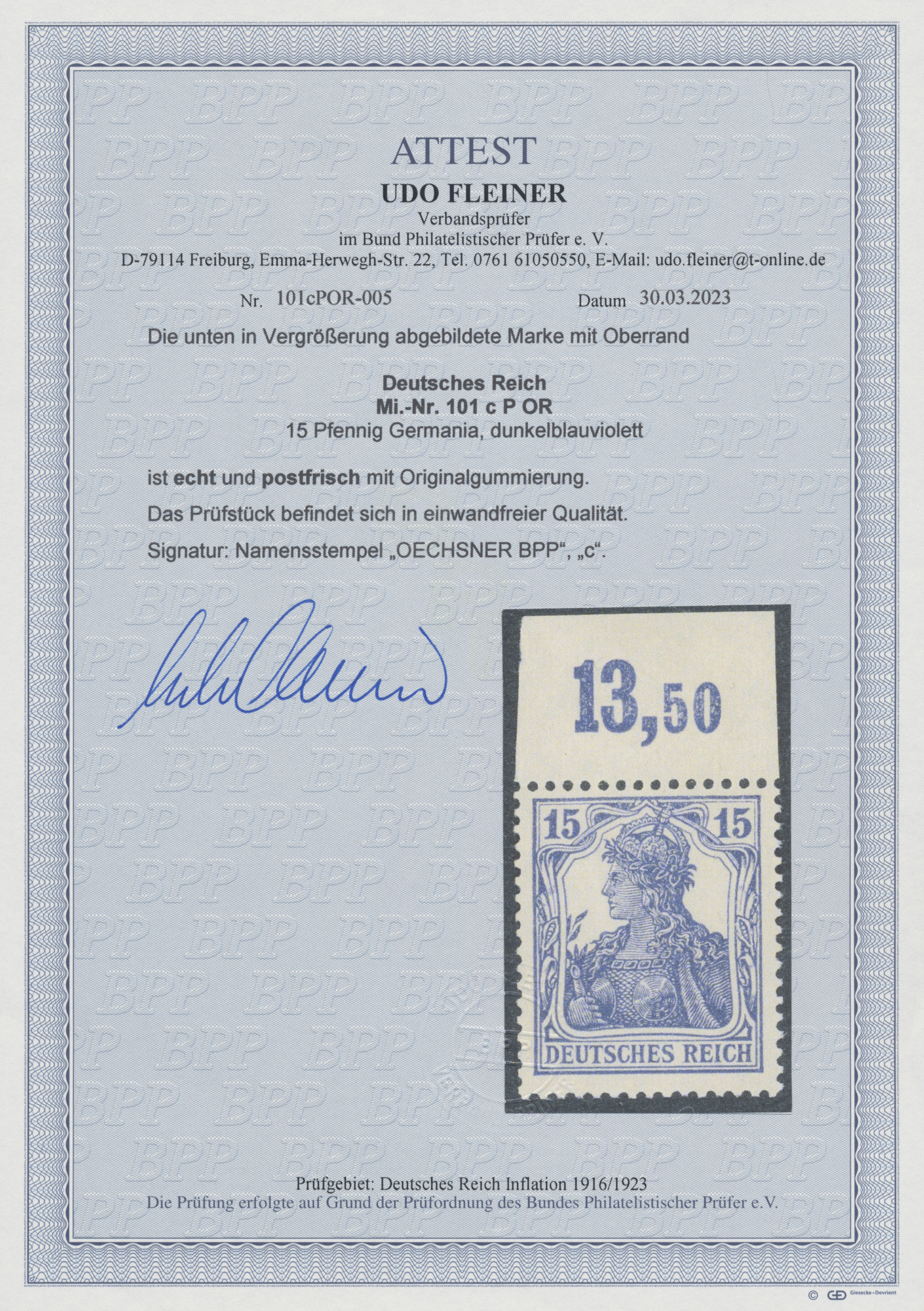 1917, 15 PF Germania in der seltenen c-Farbe "dunkelblauviolett" als tadellos postfrisches Oberrand-Stück im Plattendruck. Signiert Oechsner und