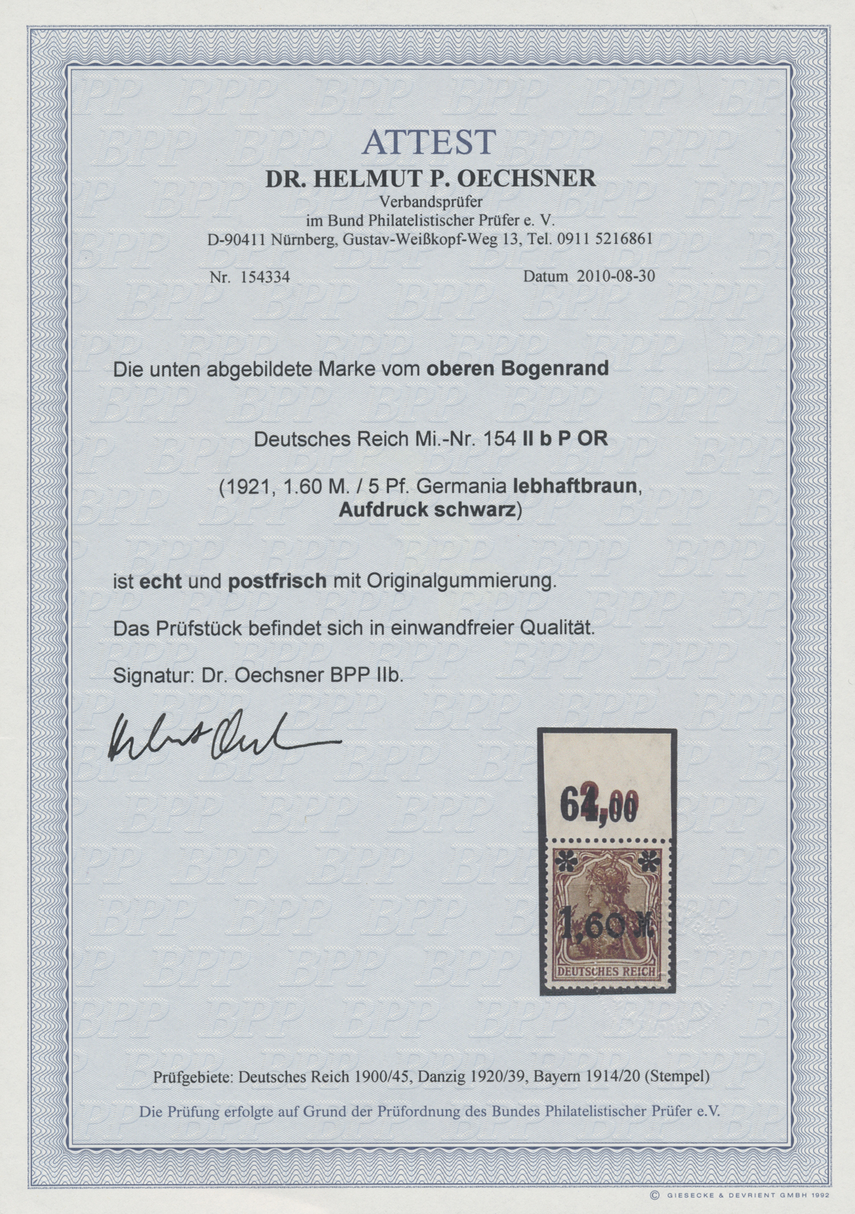 1921, 1,60 M auf 5 Pf dunkelbraun, Aufdruck mattglänzend, Oberrandstück im Plattendruck, tadellose postfrische Erhaltung, signiert Oechsner und mit